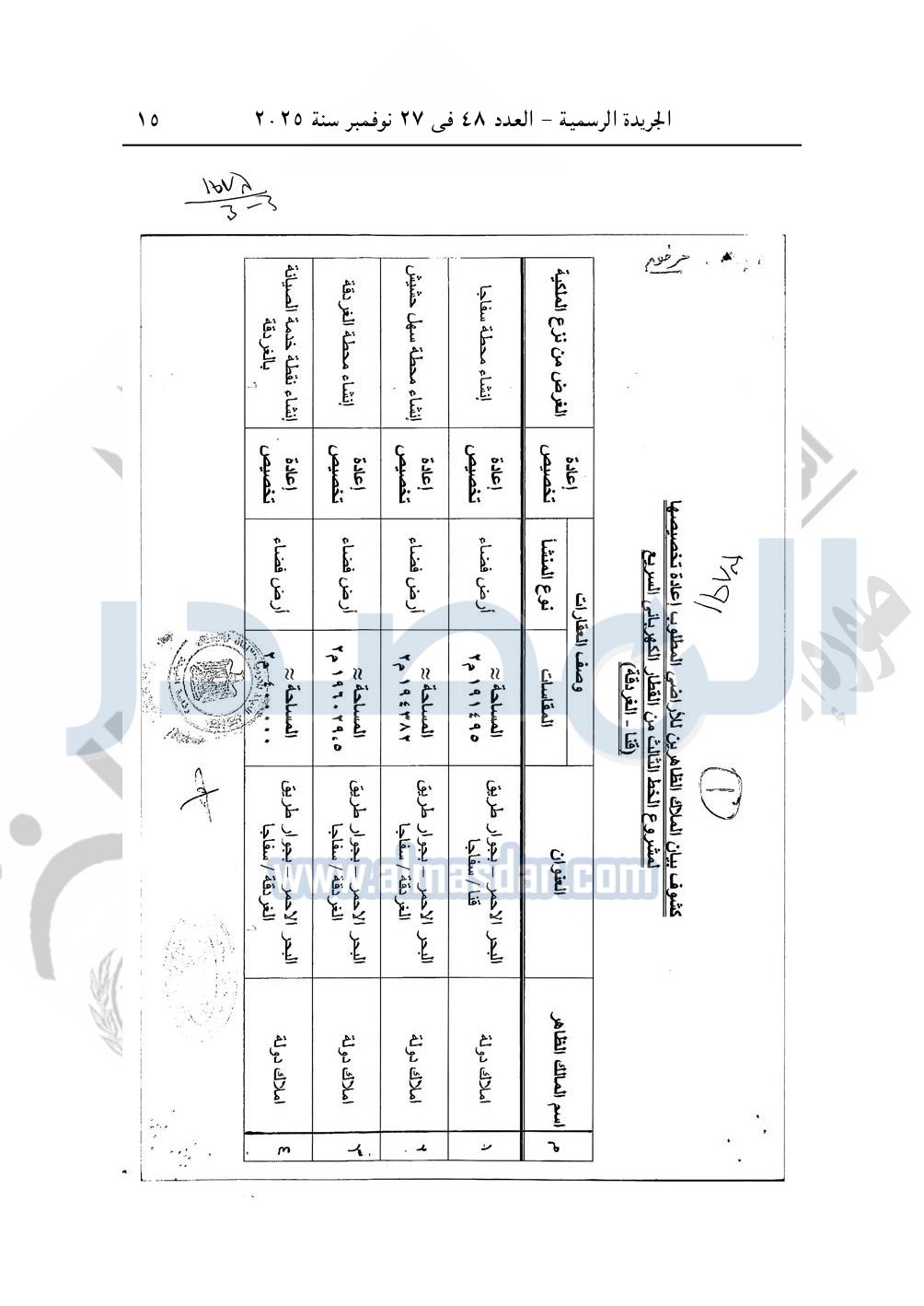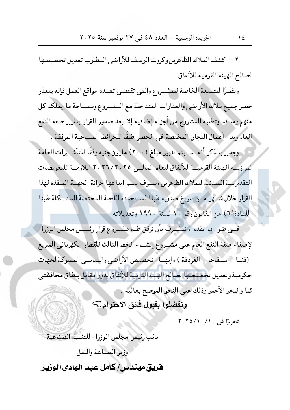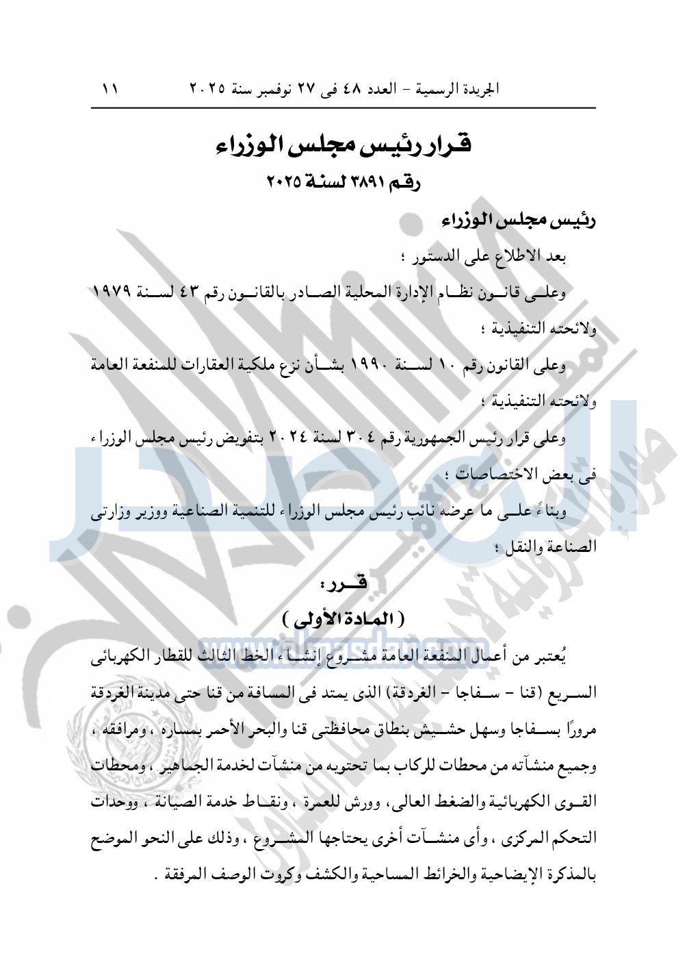 نشرت الجريدة الرسمية في العدد 48، الصادر في 27 نوفمبر سنة 2025، قرار رئيس مجلس الوزراء، رقم 3891 لسنة 2025، بشأن نزع ملكية بعض الأراضي والعقارات لإنشاء الخط الثالث للقطار الكهربائي السريع.