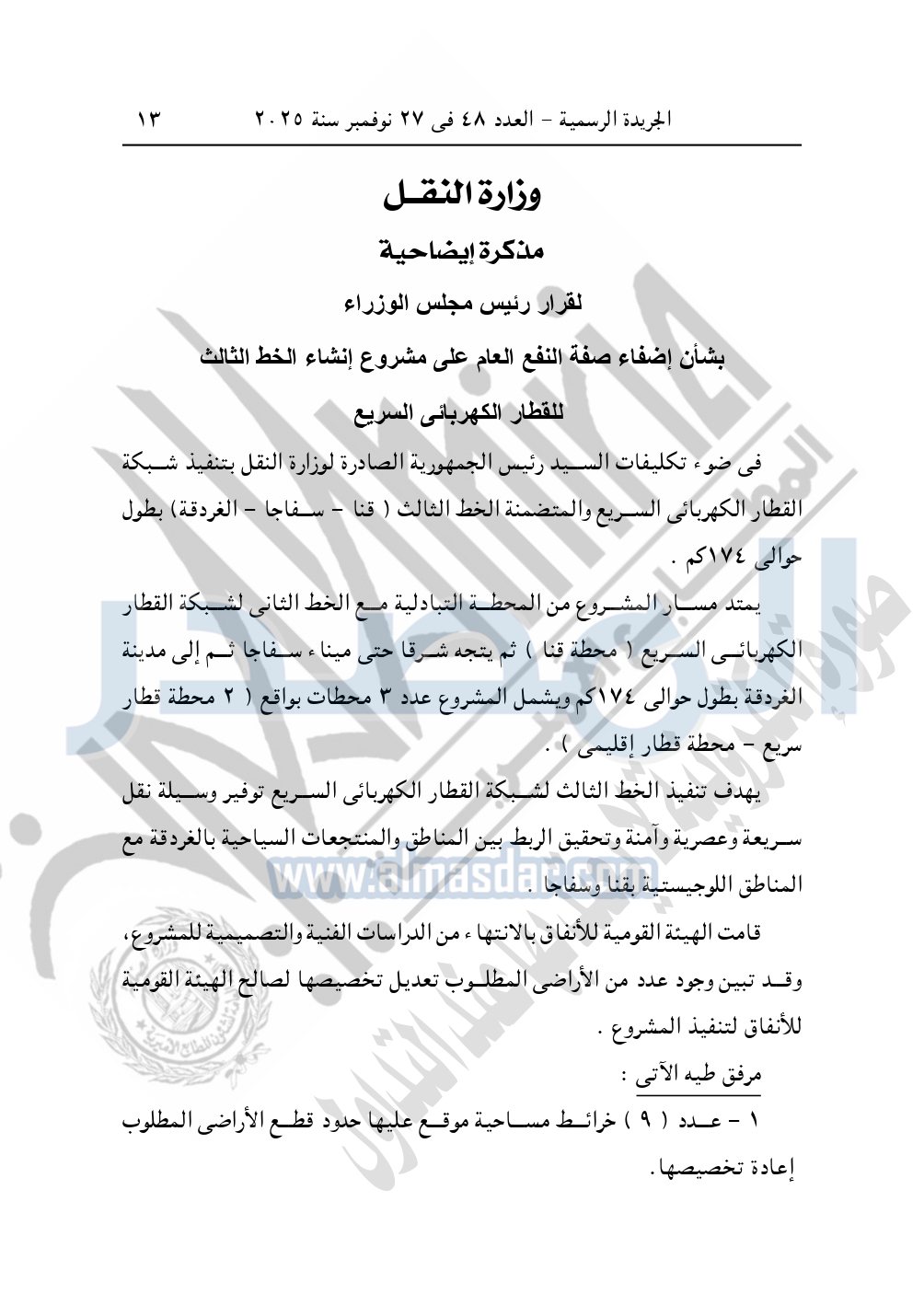 يُعتبر من أعمال المنفعة العامة مشروع إنشاء الخط الثالث للقطار الكهربائي السريع "قنا – سفاجا – الغردقة" الذي يمتد في المسافة من قنا حتى مدينة الغردقة مروراً بسفاجا وسهل حشيش بنطاق محافظتى قنا والبحر الأحمر بمساره، ومرافقه، وجميع منشآته من محطات للركاب بما تحتويه من منشآت لخدمة الجماهير، ومحطات القوى الكهربائية والضغط العالى وورش للعمرة، ونقاط خدمة الصيانة، ووحدات التحكم المركزي، وأى منشآت أخرى يحتاجها المشروع، وذلك على النحو الموضح بالمذكرة الإيضاحية والخرائط المساحية والكشف وكروت الوصف المرفقة.