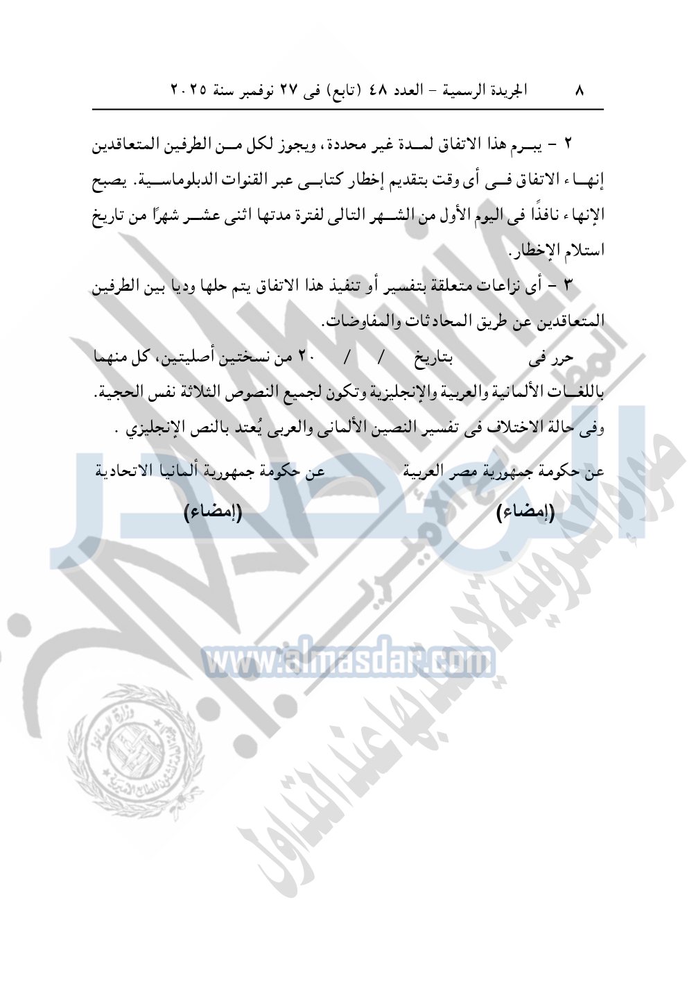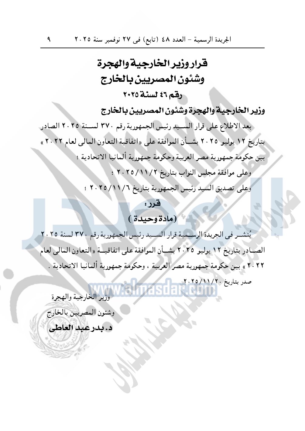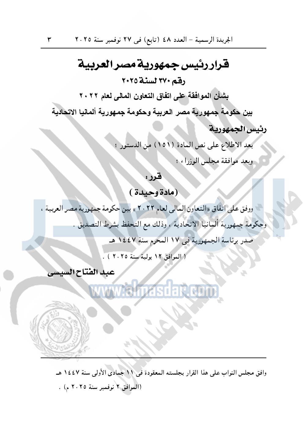 نشرت الجريدة الرسمية، في العدد 48 "تابع"، الصادر في 27 نوفمبر سنة 2025، قرار رئيس جمهورية مصر العربية، رقم 370 لسنة 2025، بشأن الموافقة على اتفاق التعاون المالي لعام 2022 بين حكومة جمهورية مصر العربية وحكومة جمهورية ألمانيا الاتحادية.