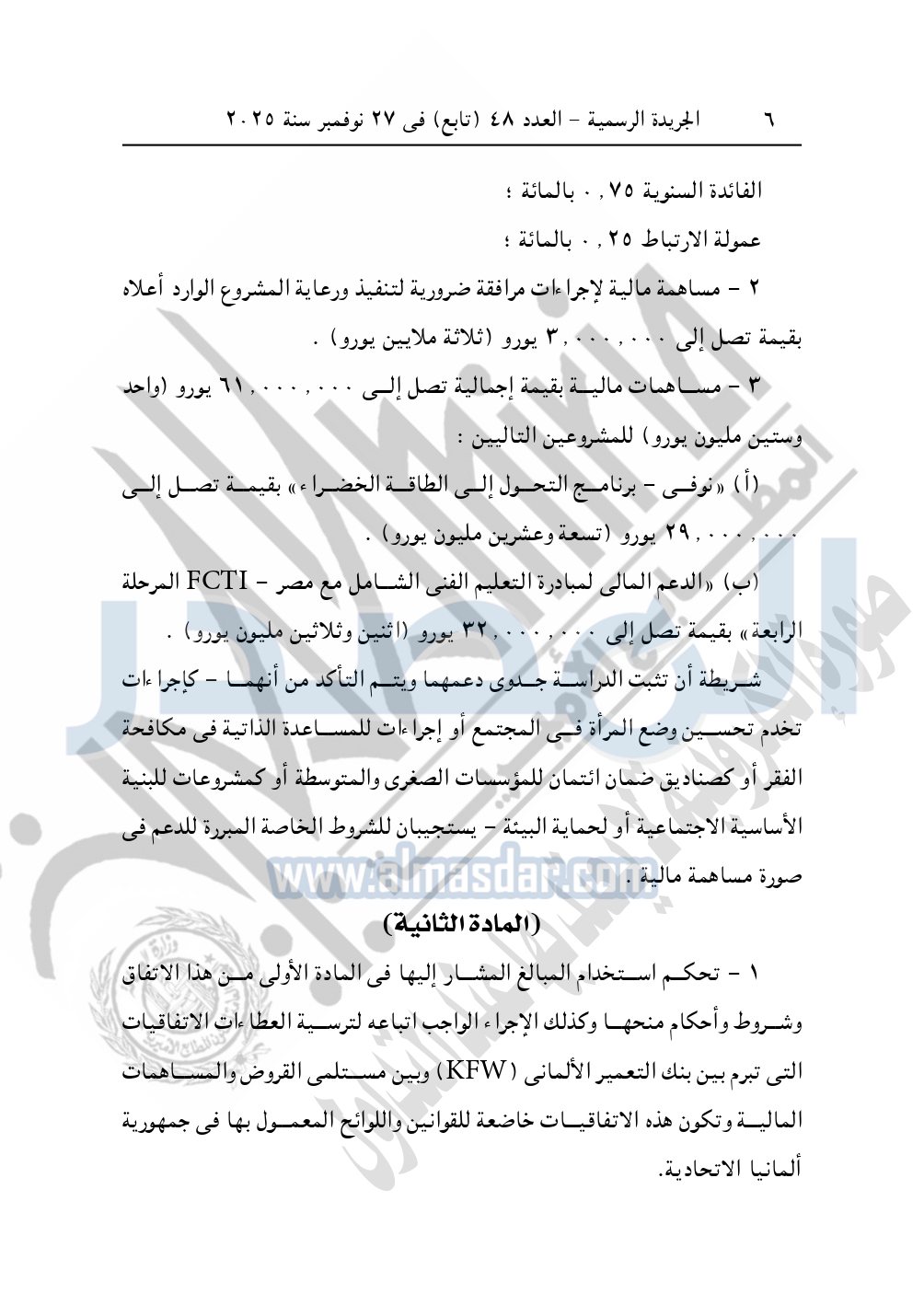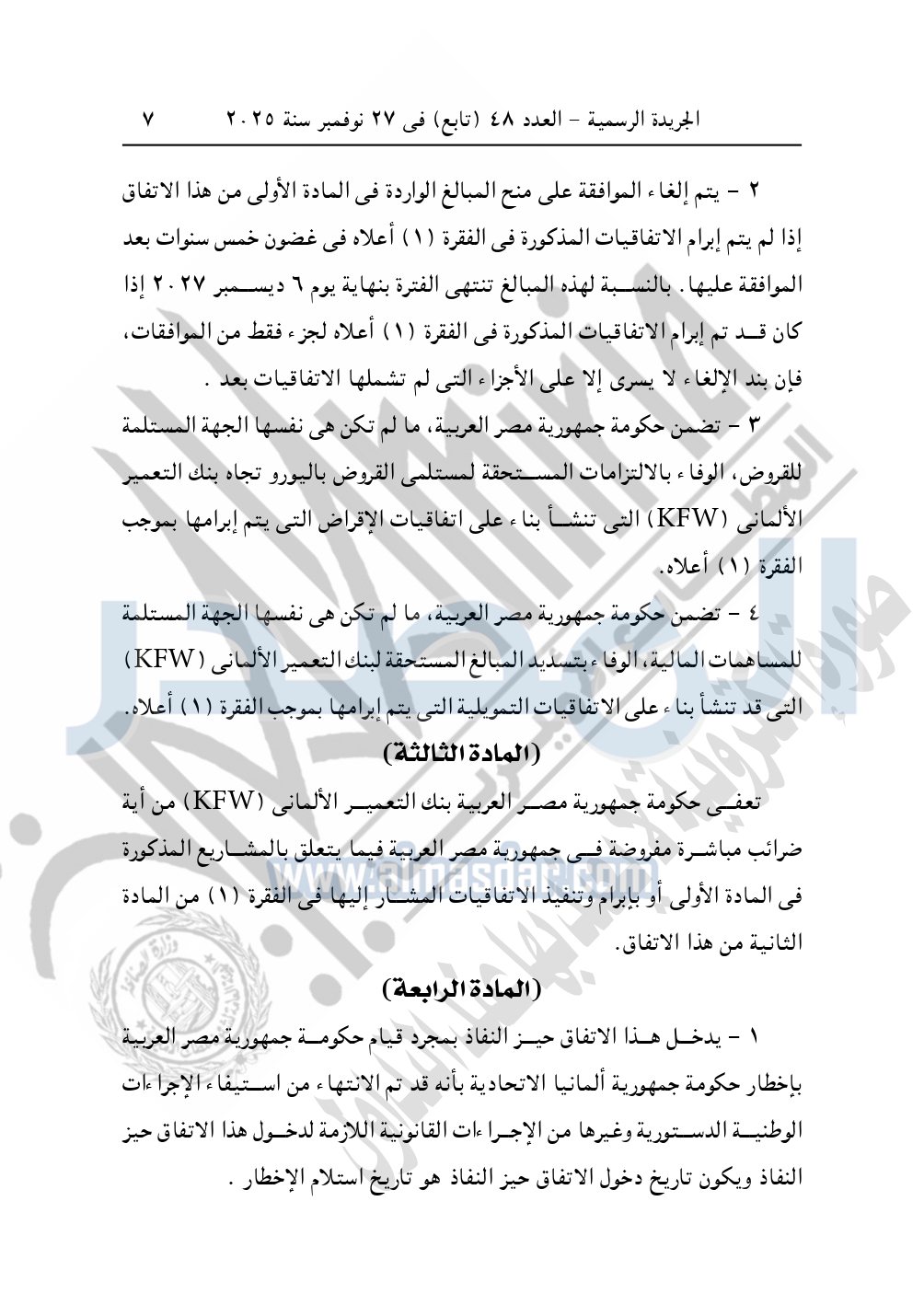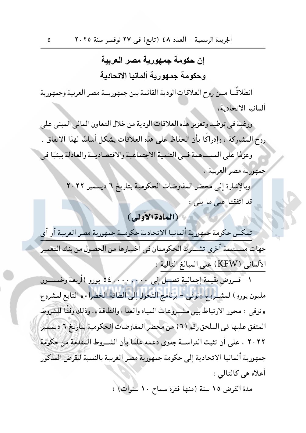 نشرت الجريدة الرسمية، في العدد 48 "تابع"، الصادر في 27 نوفمبر سنة 2025، قرار رئيس جمهورية مصر العربية، رقم 370 لسنة 2025، بشأن الموافقة على اتفاق التعاون المالي لعام 2022 بين حكومة جمهورية مصر العربية وحكومة جمهورية ألمانيا الاتحادية.