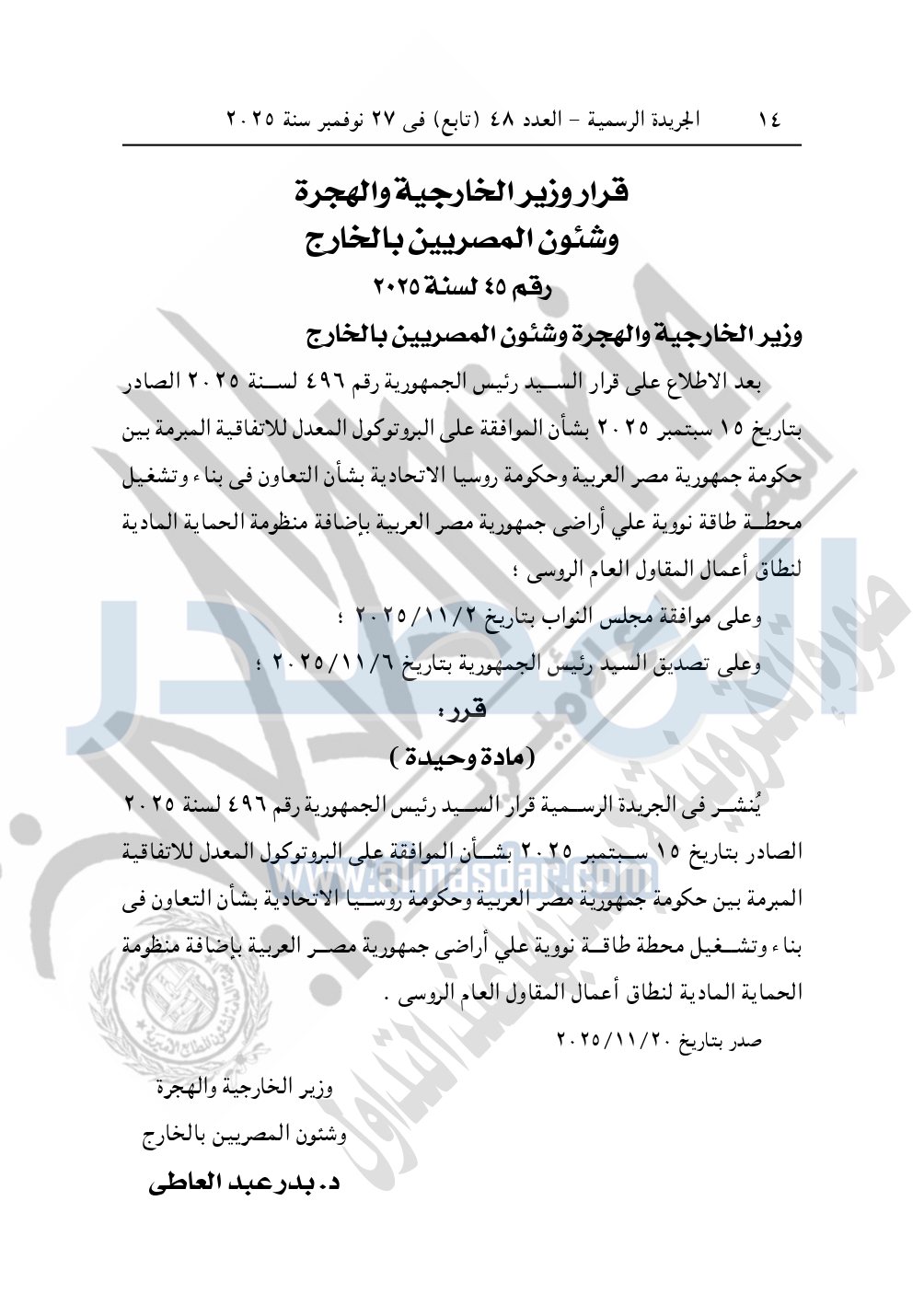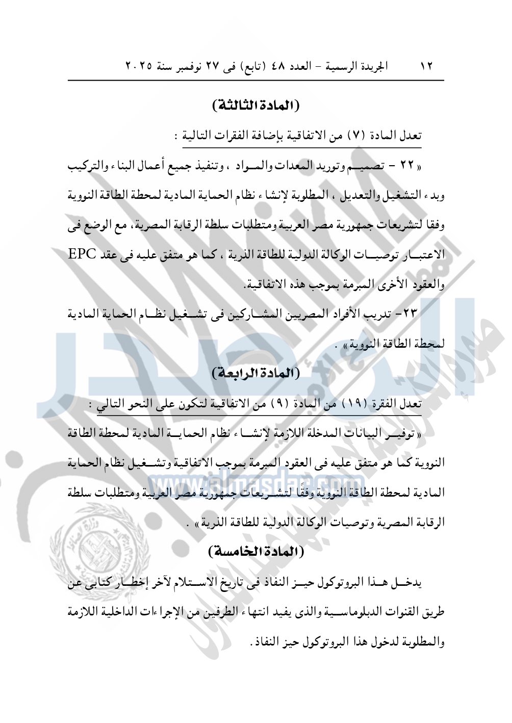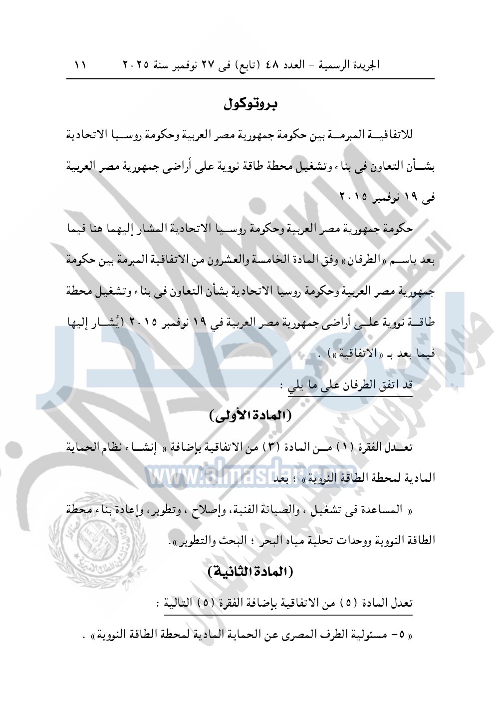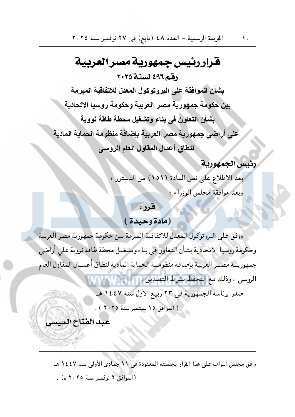 نشرت الجريدة الرسمية، في العدد 48 "تابع"، الصادر في 27 نوفمبر سنة 2025، قرار رئيس جمهورية مصر العربية، رقم 496 لسنة 2025، بشأن الموافقة على البروتوكول المعدل للاتفاقية المبرمة بين حكومة جمهورية مصر العربية وحكومة روسيا الاتحادية بشأن التعاون فى بناء وتشغيل محطة طاقة نووية على أراضى جمهورية مصر العربية بإضافة منظومة الحماية المادية لنطاق أعمال المقاول العام الروسي.