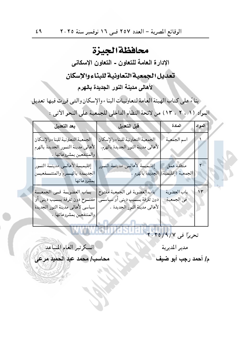 نشرت الوقائع المصرية، في العدد 257، الصادر في 16 نوفمبر سنة 2025، قرار محافظة الجيزة، الإدارة العامة للتعاون - التعاون الإسكاني، بشأن تعديل الجمعية التعاونية للبناء والإسكان لأهالى مدينة النور الجديدة بالهرم.