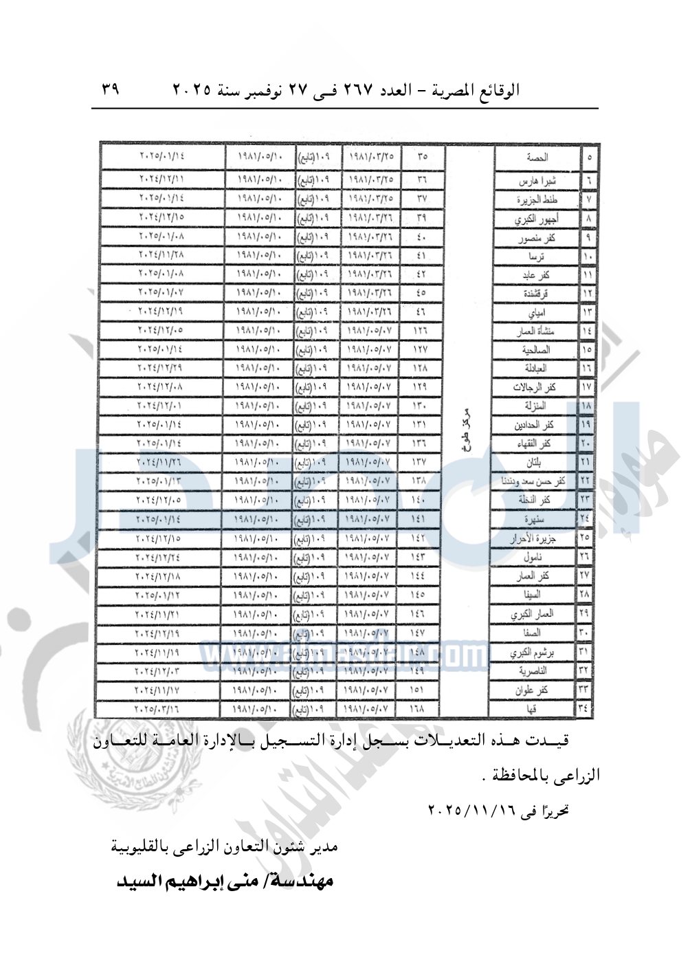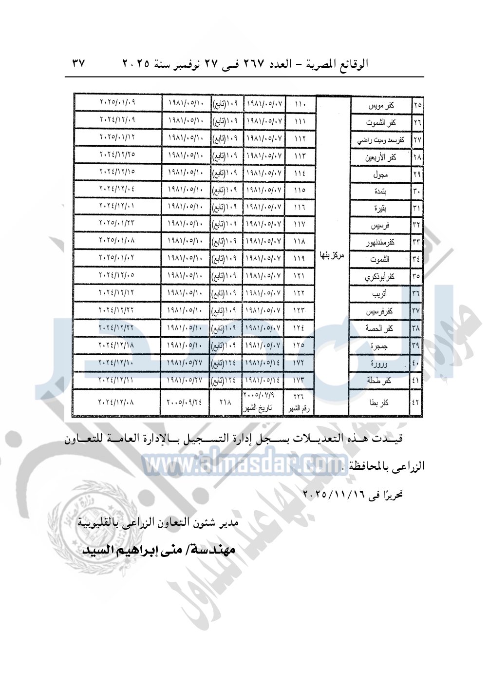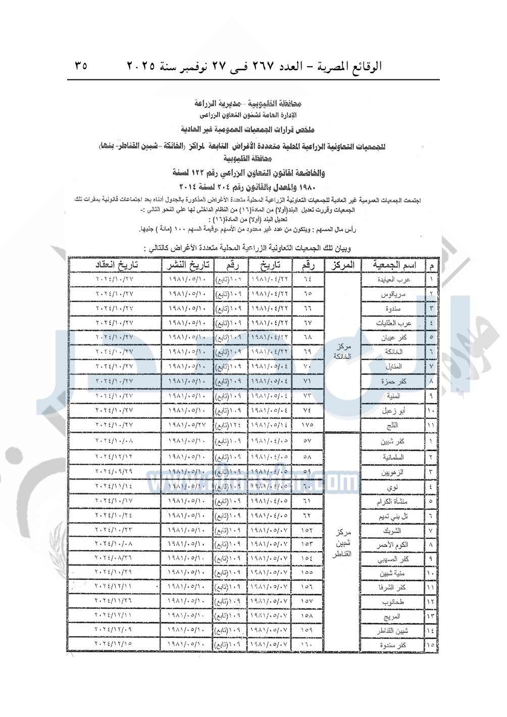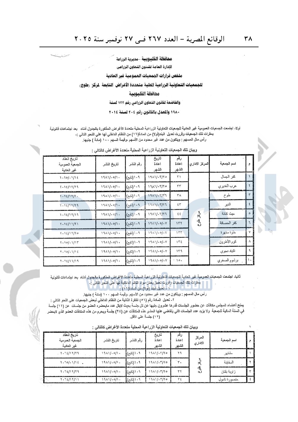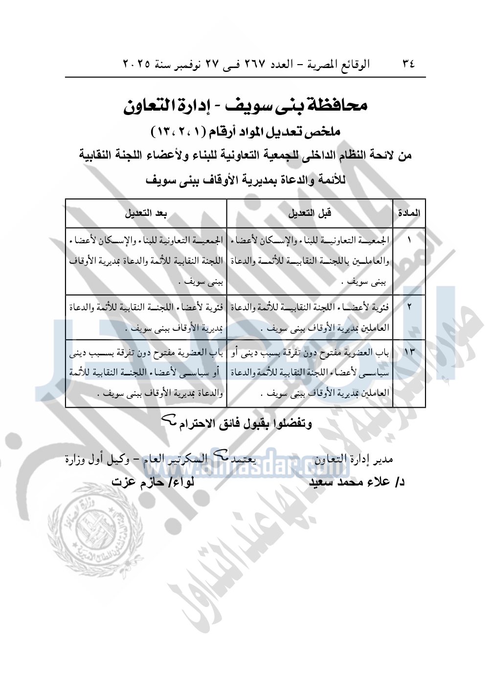 كما نشرت الوقائع المصرية، في العدد 267، الصادر في 27 نوفمبر سنة 2025، قرار محافظة بنى سويف، إدارة التعاون، ملخص تعديل المواد أرقام "1، 2، 13" من لائحة النظام الداخلى للجمعية التعاونية للبناء ولأعضاء اللجنة النقابية للأئمة والدعاة بمديرية الأوقاف ببنى سويف.