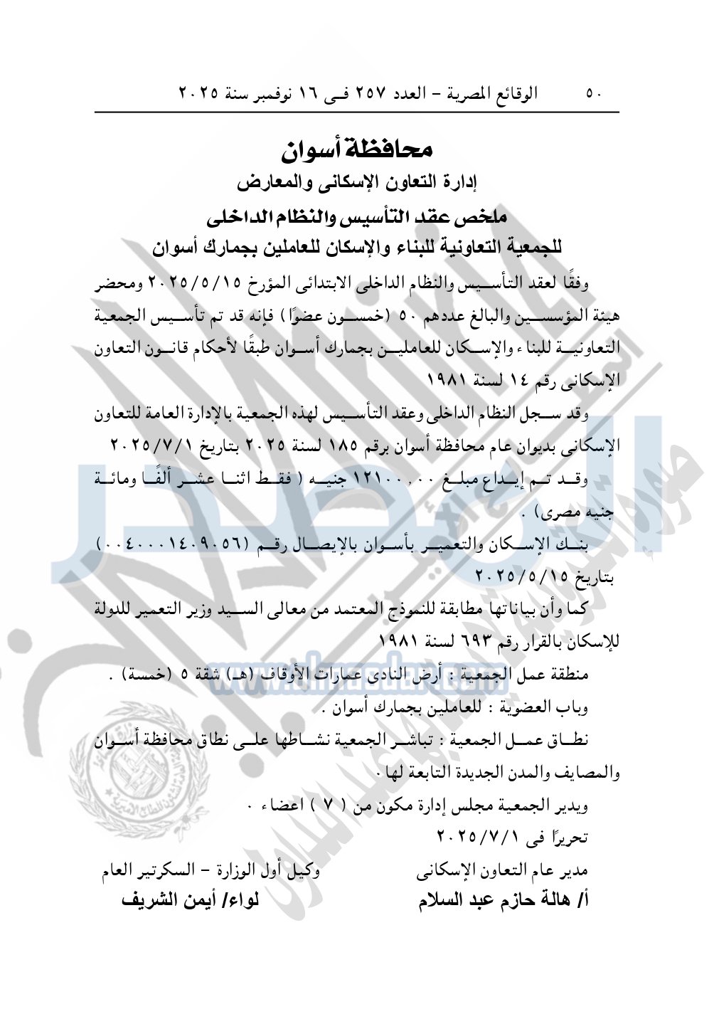 نشرت الوقائع المصرية، في العدد 257، الصادر في 16 نوفمبر سنة 2025، قرار محافظة أسوان، إدارة التعاون الإسكاني والمعارض، بشأن ملخص عقد التأسيس والنظام الداخلى للجمعية التعاونية للبناء والإسكان للعاملين بجمارك أسوان.