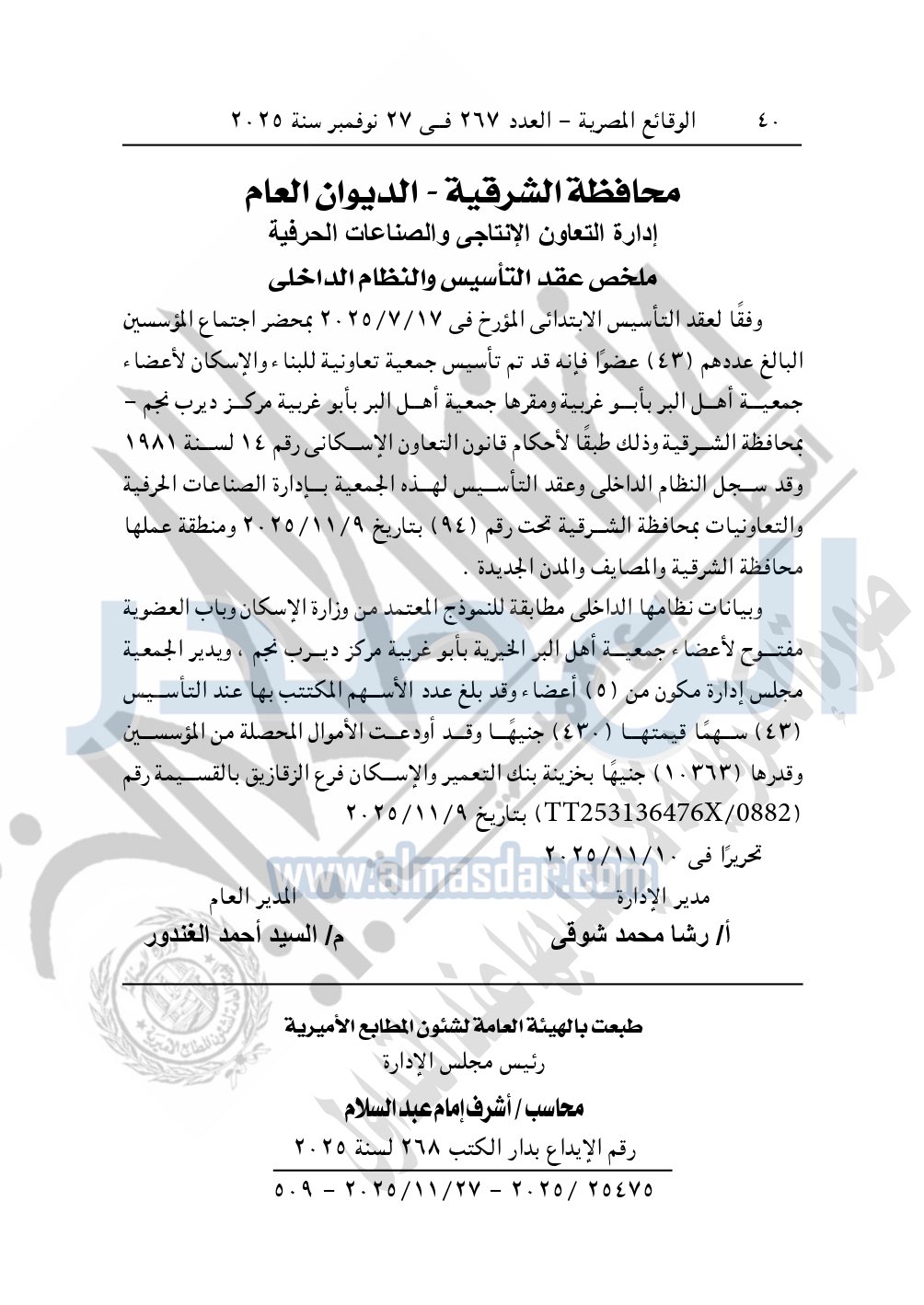 كما نشرت الوقائع المصرية، في العدد 267، الصادر في 27 نوفمبر سنة 2025، قرار محافظة الشرقية، الديوان العام، إدارة التعاون الإنتاجى والصناعات الحرفية، بشأن ملخص عقد التأسيس والنظام الداخلى.