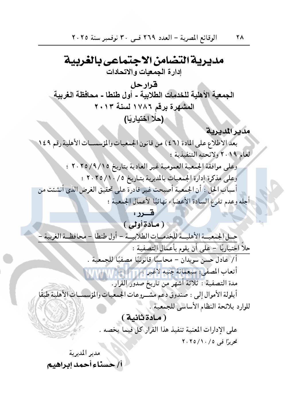 نشرت الوقائع المصرية في العدد 269، بتاريخ 30 نوفمبر 2025، قرار مديرية التضامن الاجتماعي بالغربية، الخاص بحل الجمعية الأهلية للخدمات الطلابية - أول طنطا - محافظة الغربية، المشهرة برقم 1786 لسنة 2013 "حلا اختياريا".