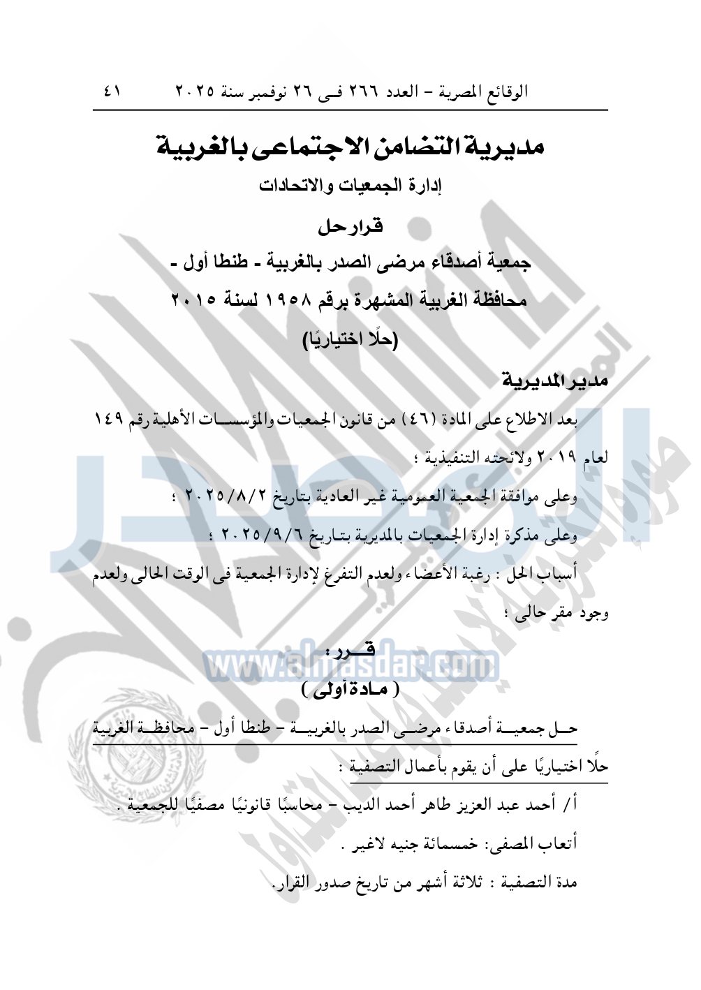 كما نشرت الوقائع المصرية في العدد 266، بتاريخ 26 نوفمبر 2025، قرار مديرية التضامن الاجتماعي بالغربية، الخاص بحل جمعية أصدقاء مرضى الصدر بالغربية - طنطا أول - محافظة الغربية، المشهرة برقم 1958 لسنة 2015 "حلا اختياريا".