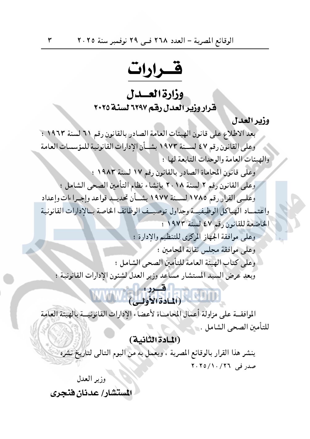 نشرت الوقائع المصرية في العدد 268، بتاريخ 29 نوفمبر 2025، قرار وزارة العدل، رقم 6297 لسنة 2025، بشأن الموافقة على مزاولة أعمال المحاماة لأعضاء الإدارات القانونية بالهيئة العامة للتأمين الصحي الشامل.