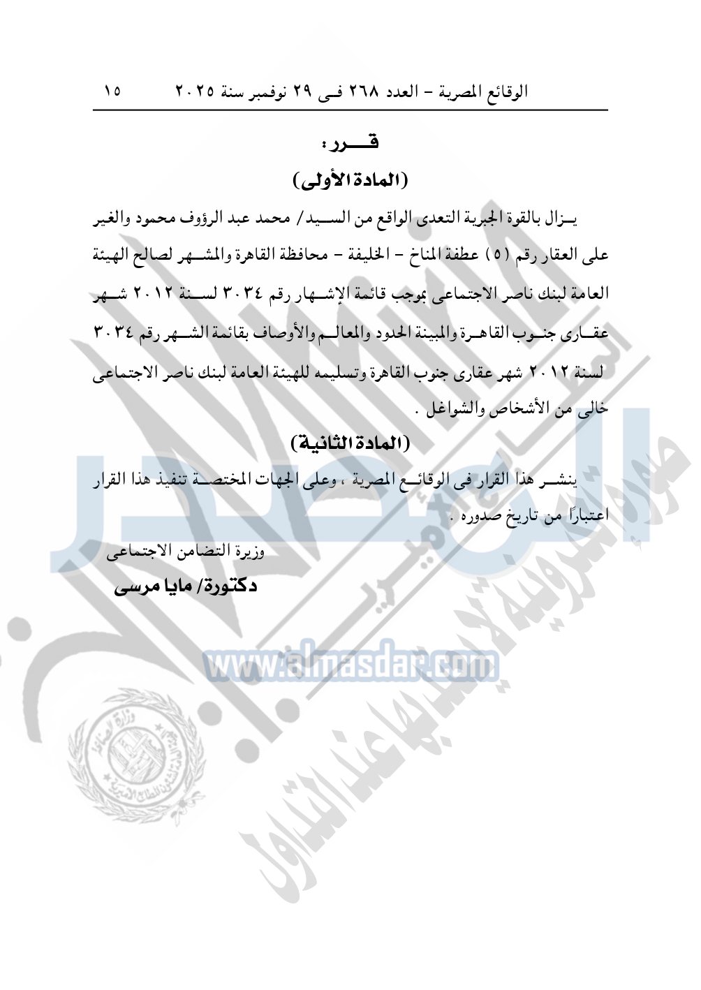 نشرت الوقائع المصرية في العدد 268، بتاريخ 29 نوفمبر 2025، قرار وزارة التضامن الاجتماعي، رقم 921 لسنة 2025، صادر بتاريخ 30-10-2025، بشأن إزالة بالقوة الجبرية التعدى الواقع من محمد عبد الرؤوف محمود.
