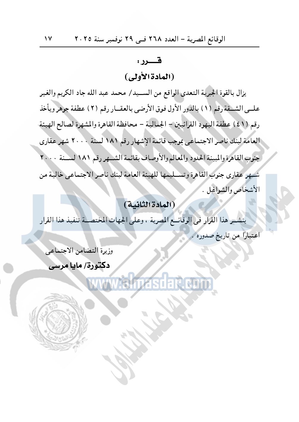 كما نشرت الوقائع المصرية في العدد 268، بتاريخ 29 نوفمبر 2025، قرار وزارة التضامن الاجتماعي، رقم 922 لسنة 2025، صادر بتاريخ 30-10-2025، بشأن إزالة بالقوة الجبرية التعدى الواقع من محمد عبد الله جاد الكريم.