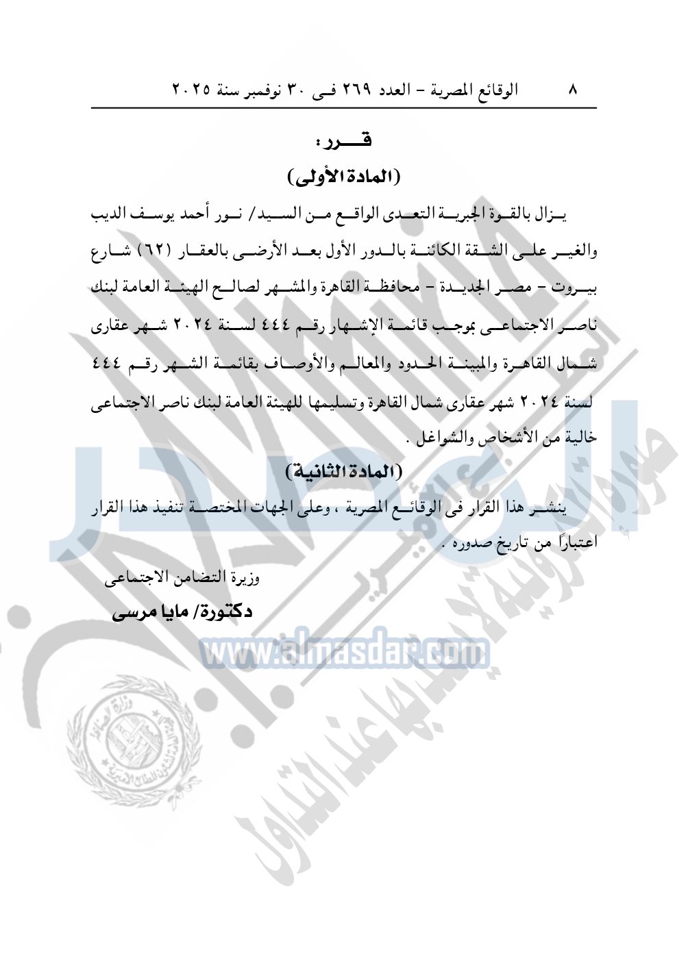 ونشرت الوقائع المصرية في العدد 269، بتاريخ 30 نوفمبر 2025، قرار وزارة التضامن الاجتماعي، رقم 925 لسنة 2025، صادر بتاريخ 30-10-2025، بشأن إزالة بالقوة الجبرية التعدى الواقع من نور أحمد يوسف الديب.