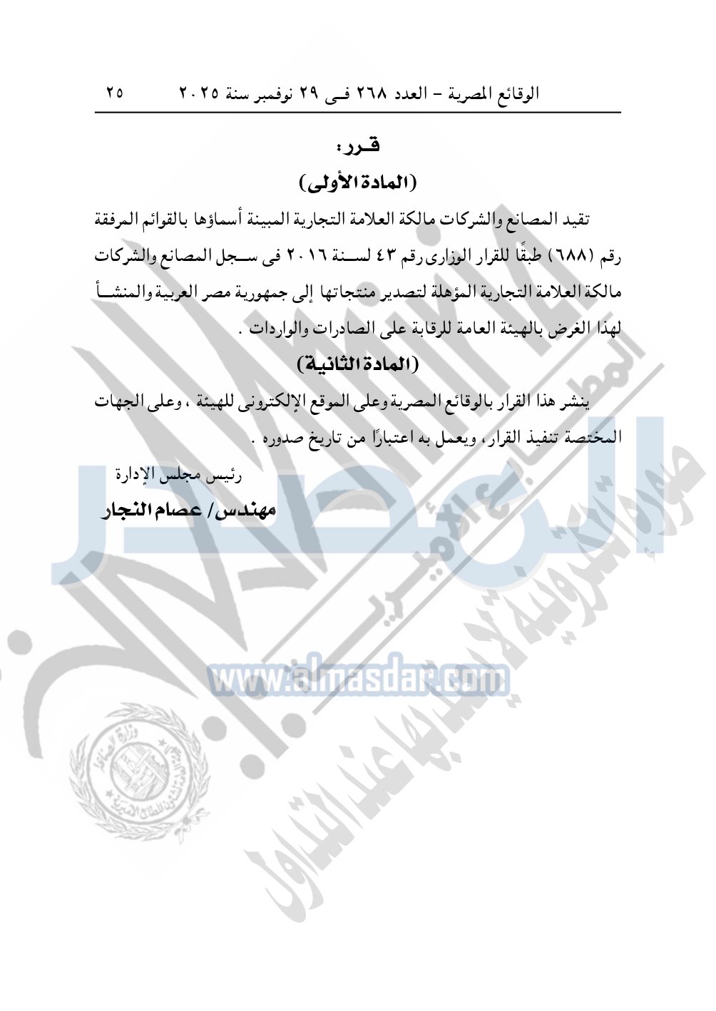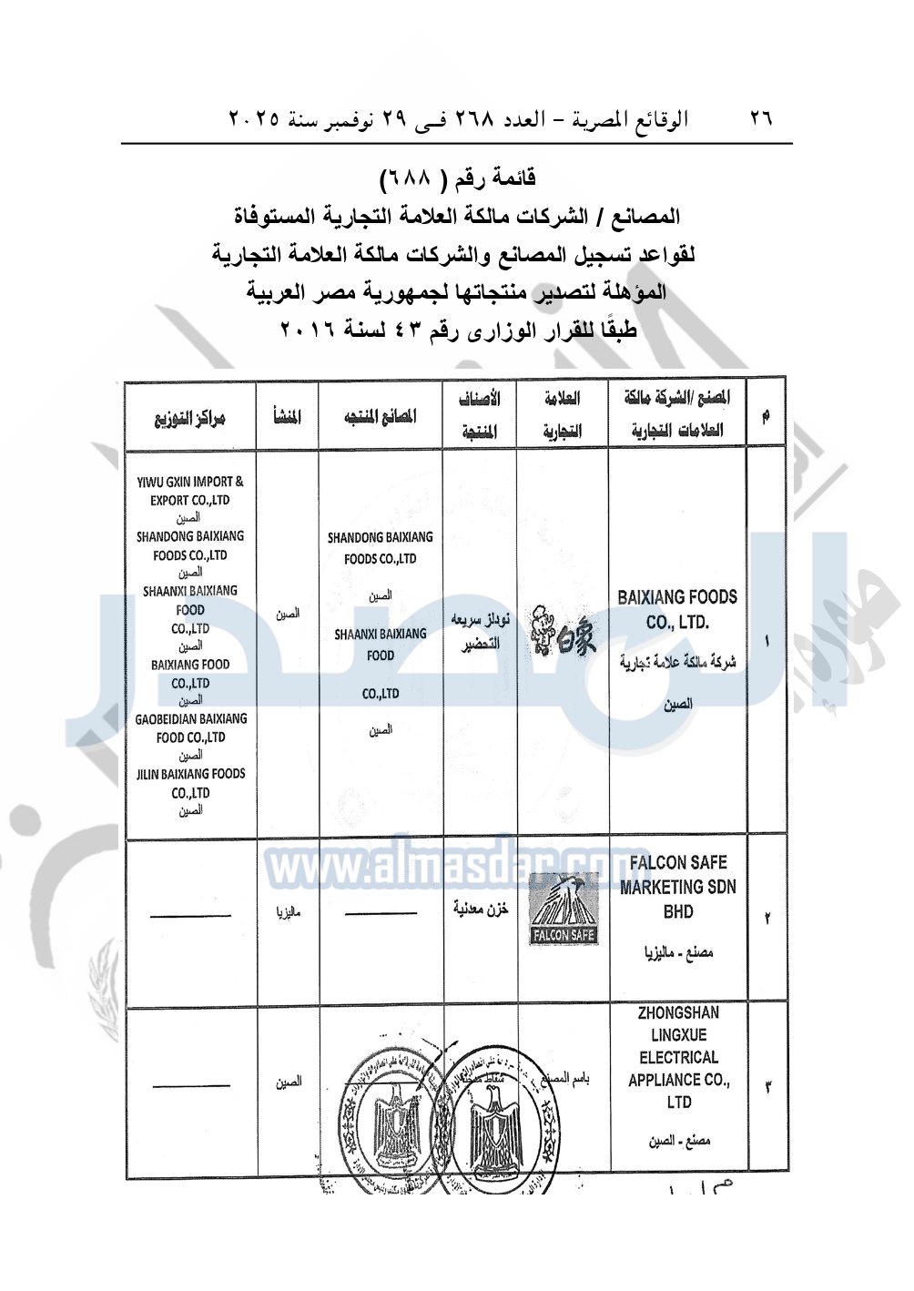 تقيد المصانع والشركات مالكة العلامة التجارية المبينة أسماؤها بالقوائم المرفقة رقم "688" طبقاً للقرار رقم 43 لسنة 2016 في سجل المصانع والشركات مالكة العلامة التجارية المؤهلة لتصدير منتجاتها إلى جمهورية مصر العربية والمنشأ لهذا الغرض بالهيئة العامة للرقابة على الصادرات والواردات.