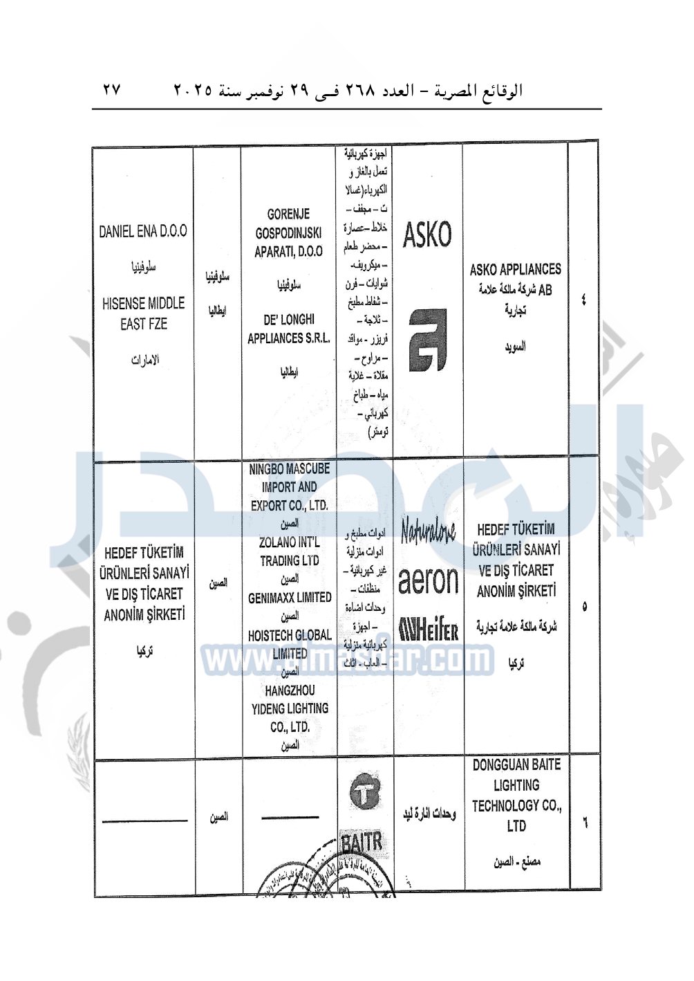 نشرت الوقائع المصرية في العدد 268، الصادر في 29 نوفمبر 2025، قرار الهيئة العامة للرقابة على الصادرات والواردات رقم 1295 لسنة 2025، بشأن قيد بعض المصانع والشركات مالكة العلامات التجارية المستوفاة لقواعد تسجيل المصانع المؤهلة لتصدير منتجاتها إلى جمهورية مصر العربية.