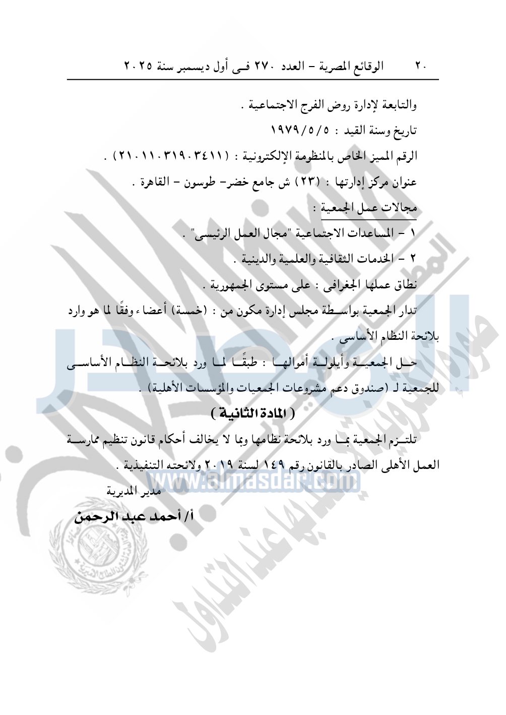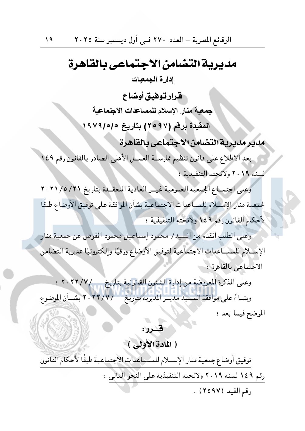 نشرت الوقائع المصرية في العدد 270، بتاريخ أول ديسمبر 2025، قرار مديرية التضامن الاجتماعي بالقاهرة، بشأن توفيق أوضاع جمعية منار الإسلام للمساعدات الاجتماعية، المقيدة برقم "2597" بتاريخ 5-5-1979.
