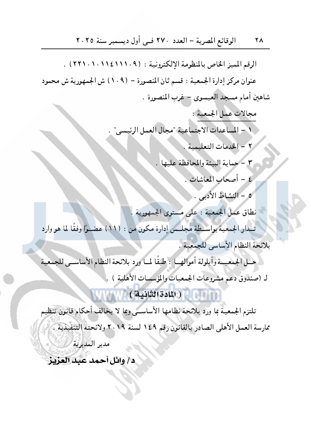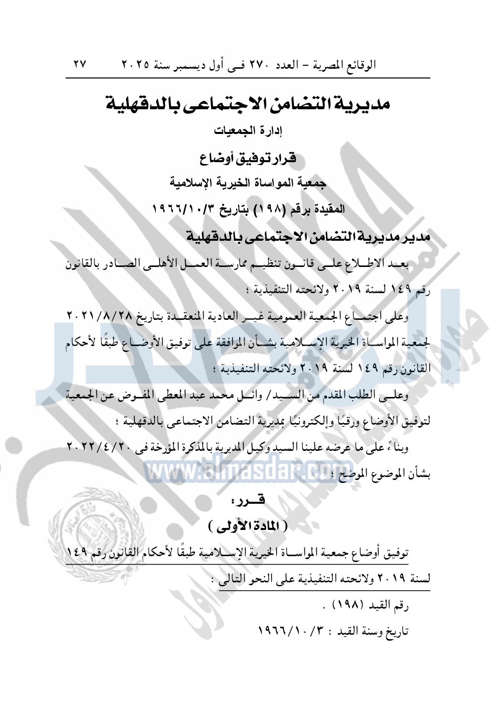 كما نشرت الوقائع المصرية في العدد 270، بتاريخ أول ديسمبر 2025، قرار مديرية التضامن الاجتماعي بالدقهلية، بشأن توفيق أوضاع جمعية المواساة الخيرية الإسلامية، المقيدة برقم "198" بتاريخ 3-10-1966.