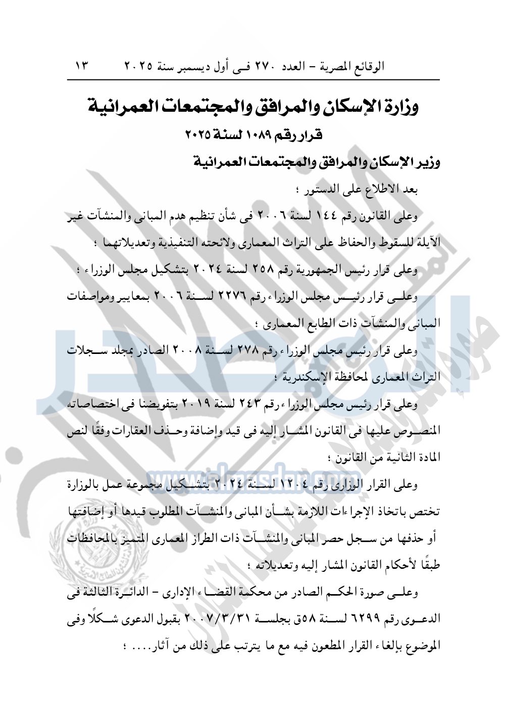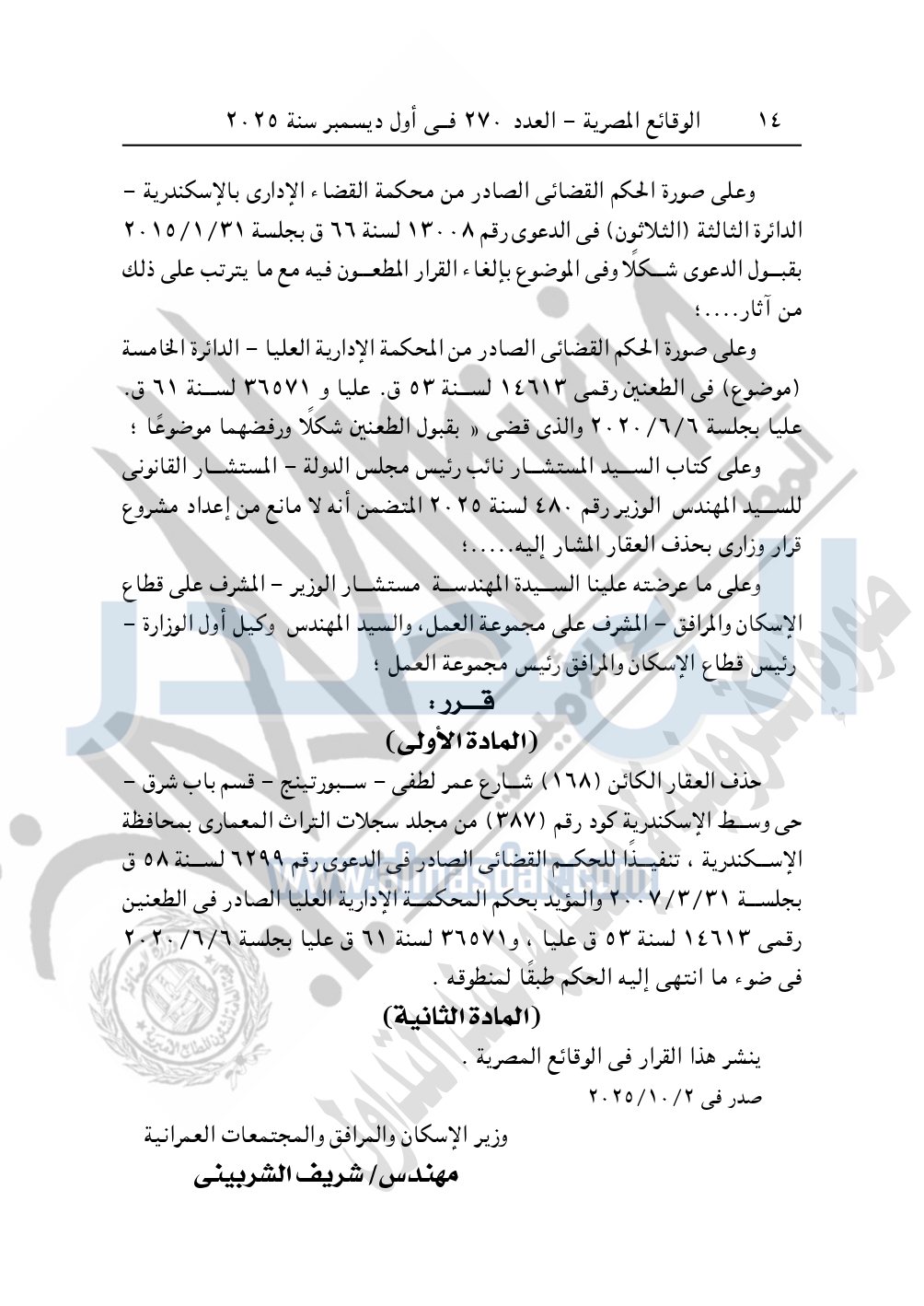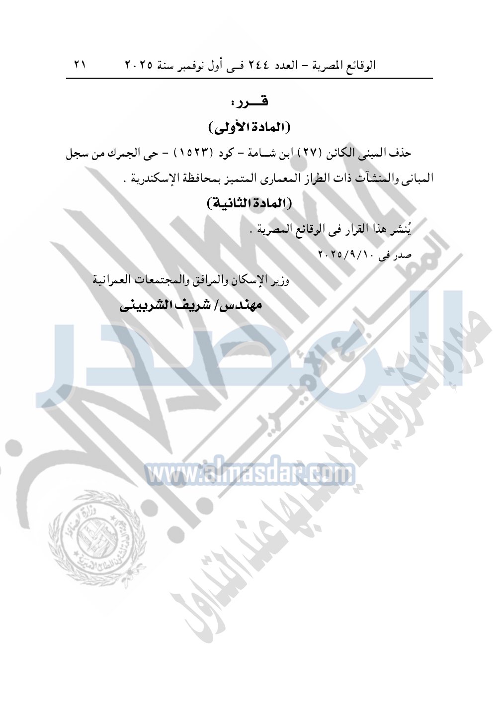 وأيضا كما نشرت الوقائع المصرية في العدد 244، بتاريخ أول نوفمبر 2025، قرار وزارة الإسكان والمرافق والمجتمعات العمرانية، رقم 991 لسنة 2025، بشأن حذف المبنى الكائن "27" من سجل المباني والمنشآت ذات الطراز المعمارى بمحافظة الإسكندرية.