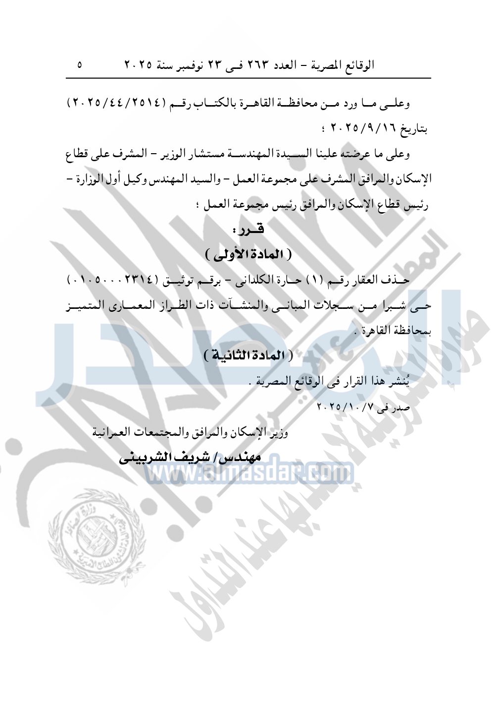 كما نشرت الوقائع المصرية في العدد 263، بتاريخ 23 نوفمبر 2025، قرار وزارة الإسكان والمرافق والمجتمعات العمرانية، رقم 1093 لسنة 2025، بشأن حذف العقار رقم "1" حارة الكلداني من سجلات المبانى والمنشآت ذات الطراز المعماري المتميز بمحافظة القاهرة.