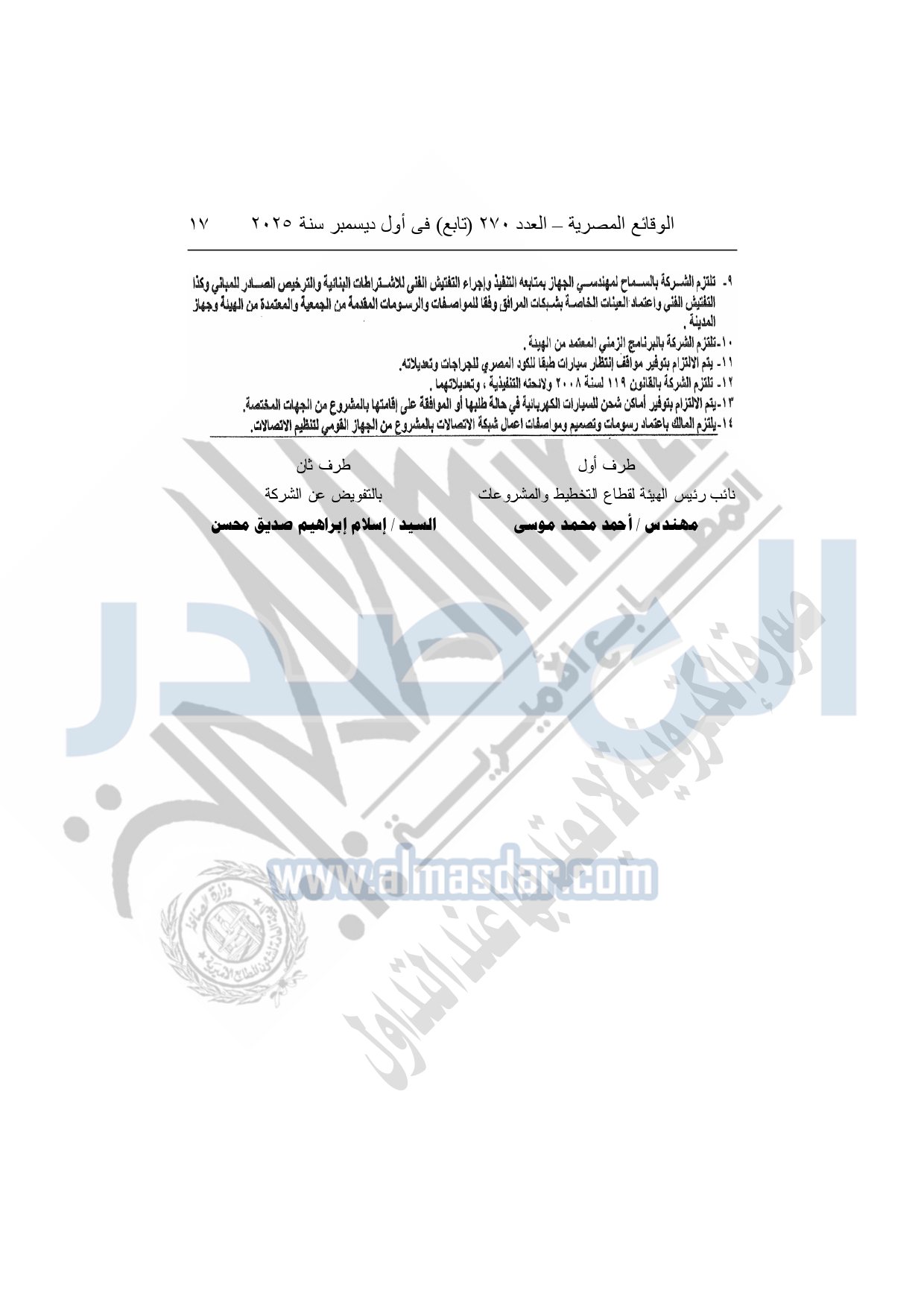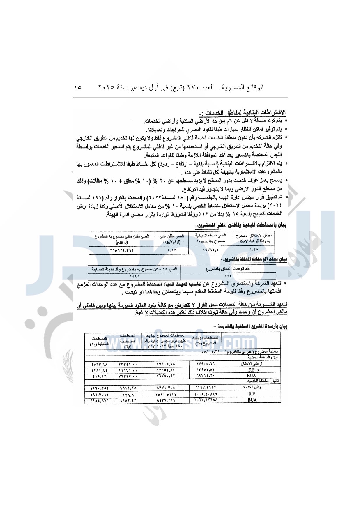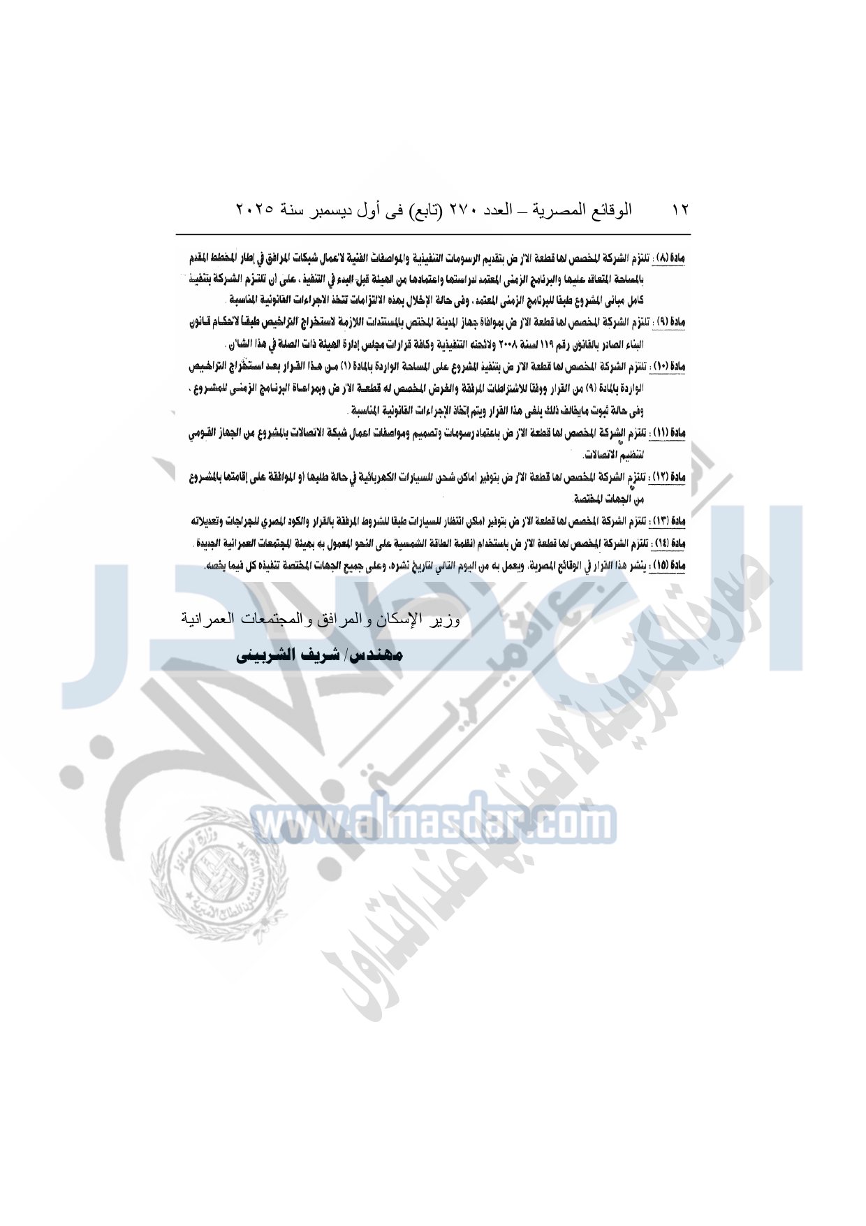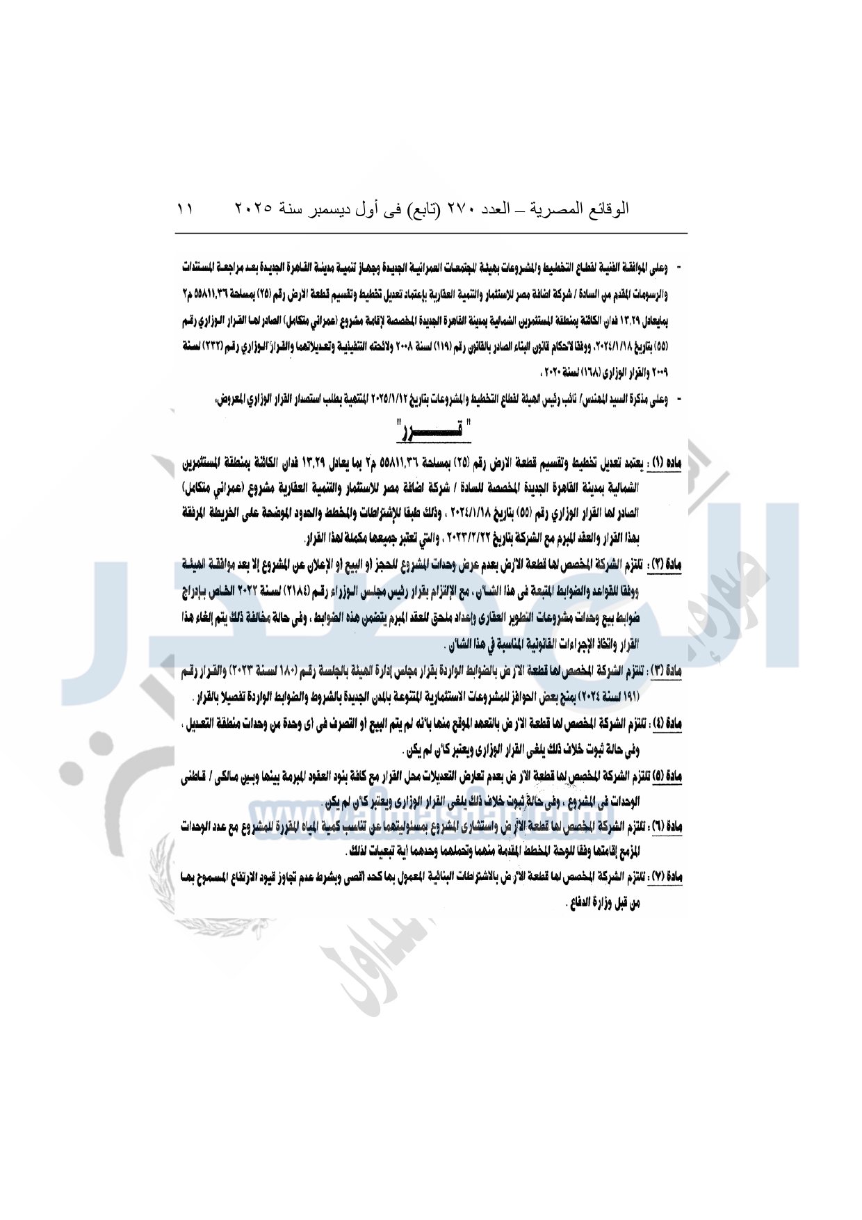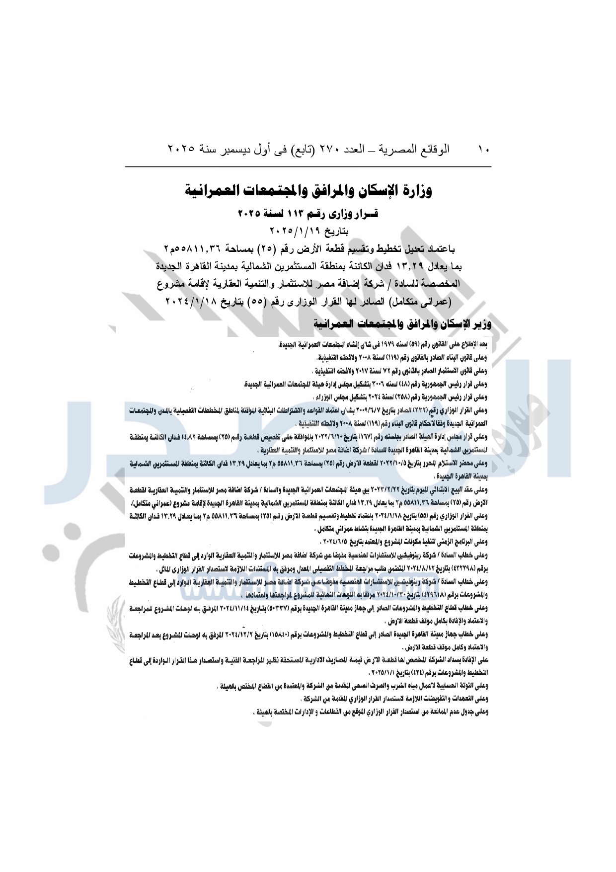 نشرت الوقائع المصرية في العدد 270 "تابع"، بتاريخ أول ديسمبر 2025، قرار وزارة الإسكان والمرافق والمجتمعات العمرانية، رقم 113 لسنة 2025، بتاريخ 19-1-2025، بشأن اعتماد تعديل تخطيط وتقسيم قطعة الأرض رقم "25" بمساحة 55811.36م2 بما يعادل 13.29 فدان الكائنة بمنطقة المستثمرين الشمالية بمدينة القاهرة الجديدة المخصصة لـ شركة إضافة مصر للاستثمار والتنمية العقارية لإقامة مشروع "عمراني متكامل" الصادر لها القرار الوزارى رقم "55" بتاريخ 18-1-2024.