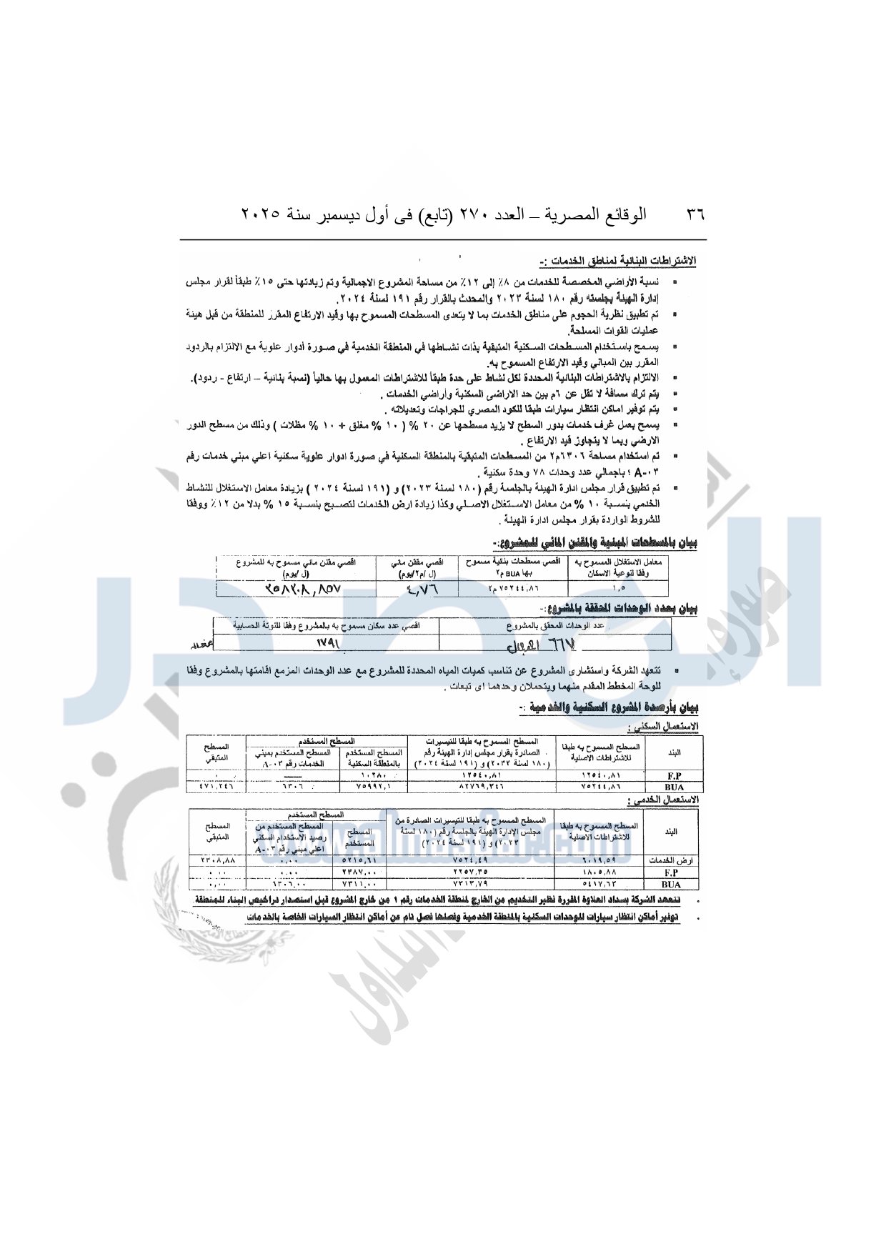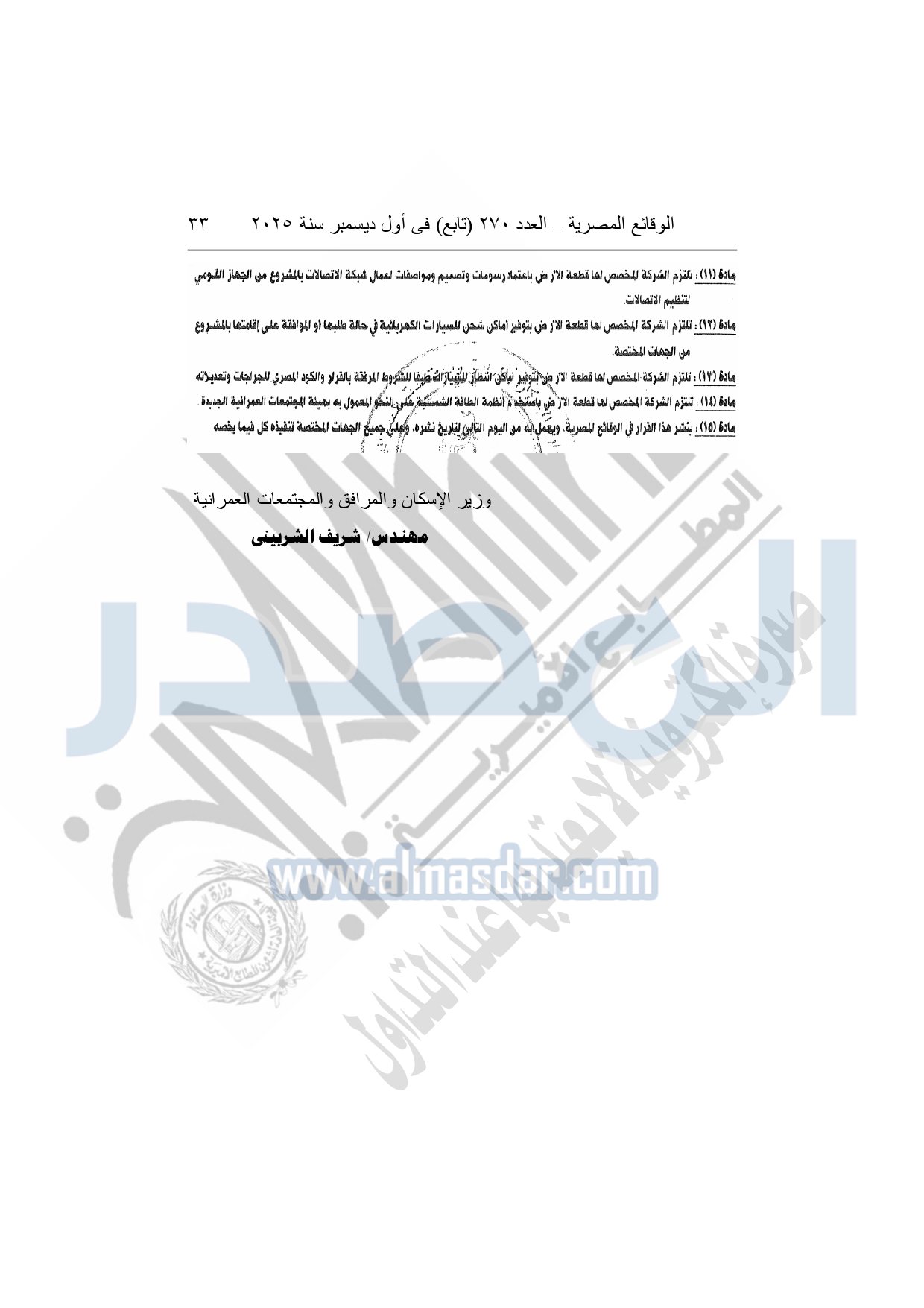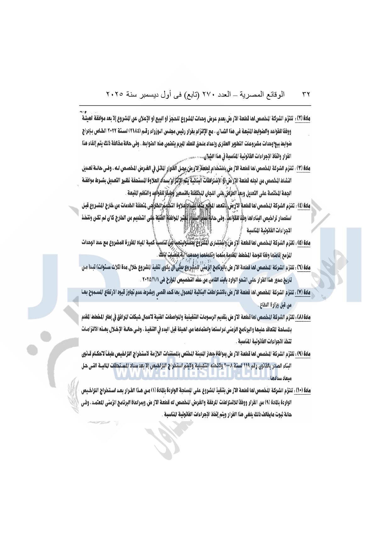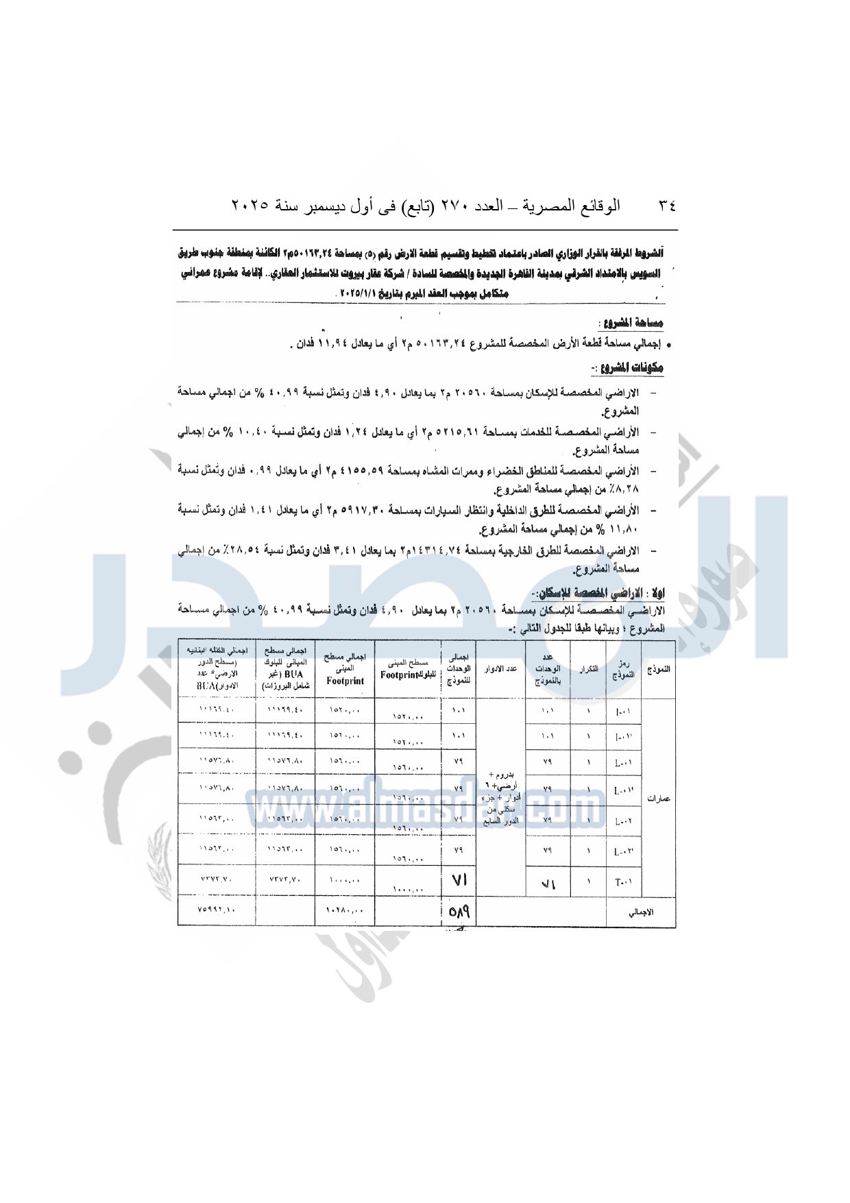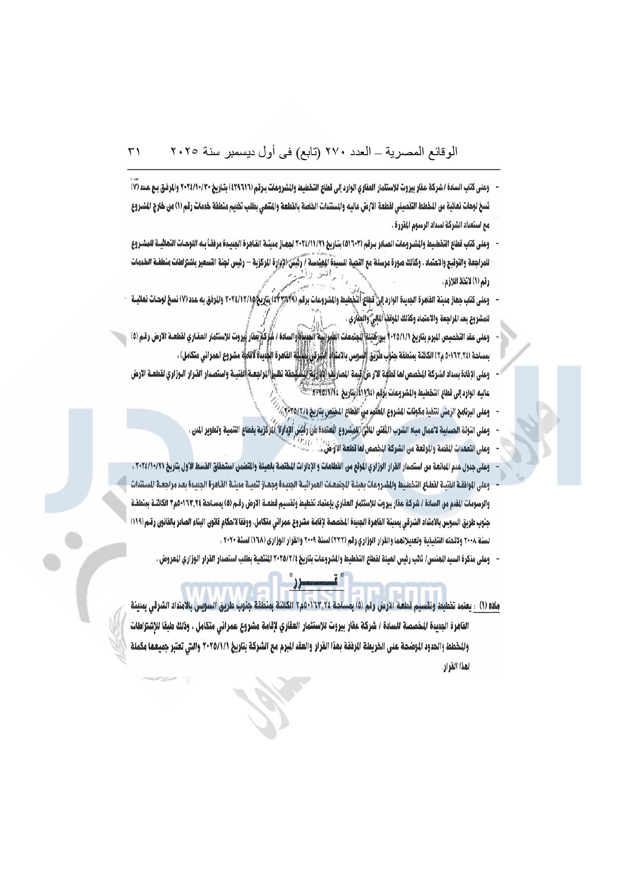 نشرت الوقائع المصرية في العدد 270 "تابع"، بتاريخ أول ديسمبر 2025، قرار وزارة الإسكان والمرافق والمجتمعات العمرانية، رقم 196 لسنة 2025، بتاريخ 8-2-2025، بشأن اعتماد تخطيط وتقسيم قطعة الأرض رقم "5" بمساحة 50163.24م2 الكائنة بمنطقة جنوب طريق السويس بالامتداد الشرقى بمدينة القاهرة الجديدة المخصصة لـ شركة عقار بيروت للاستثمار العقارى لإقامة مشروع عمراني متكامل.