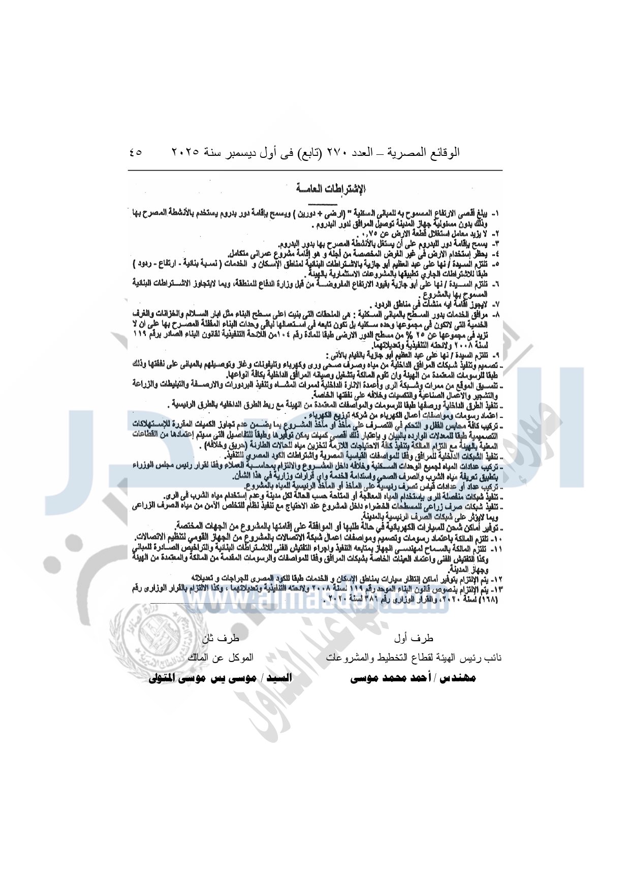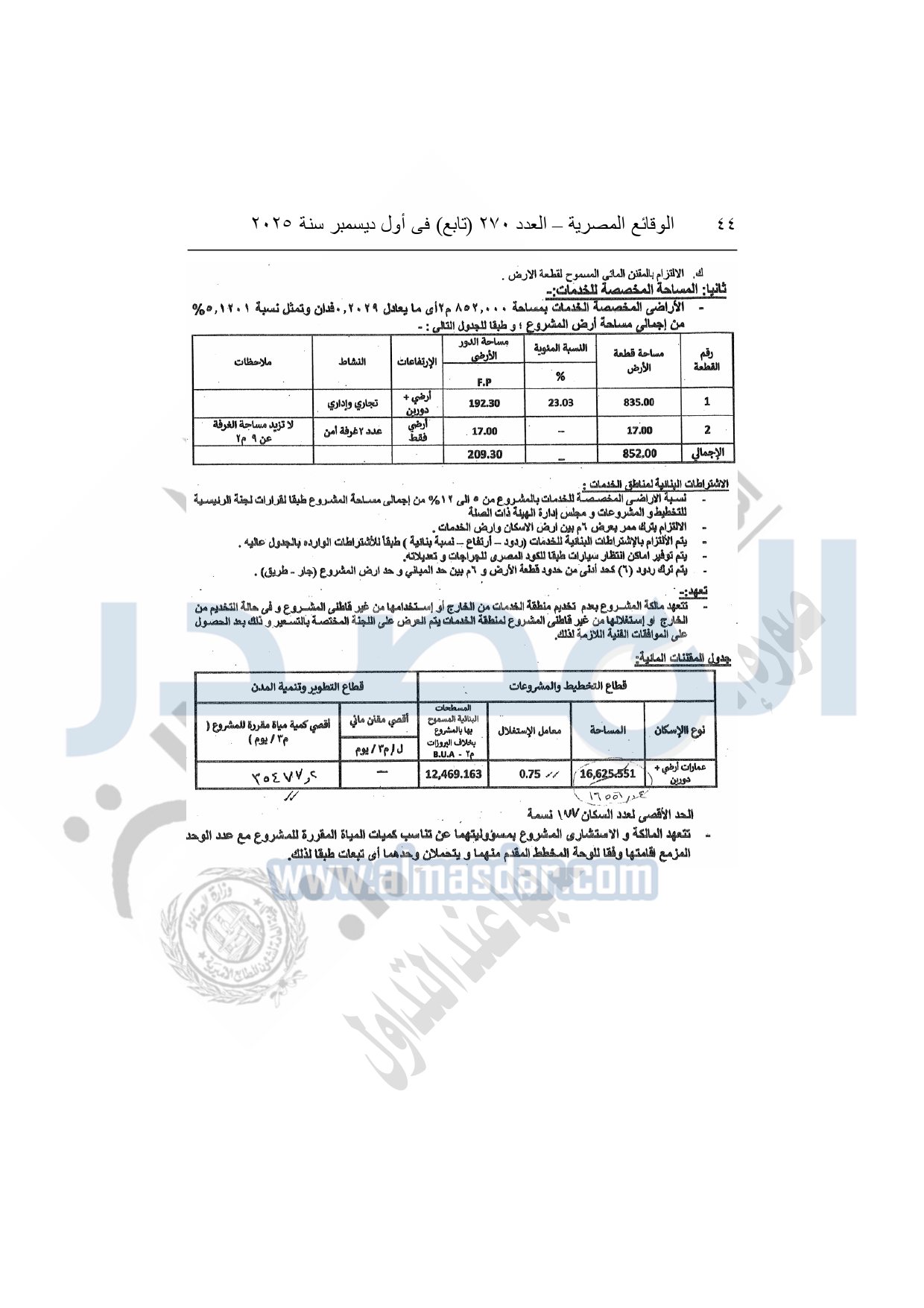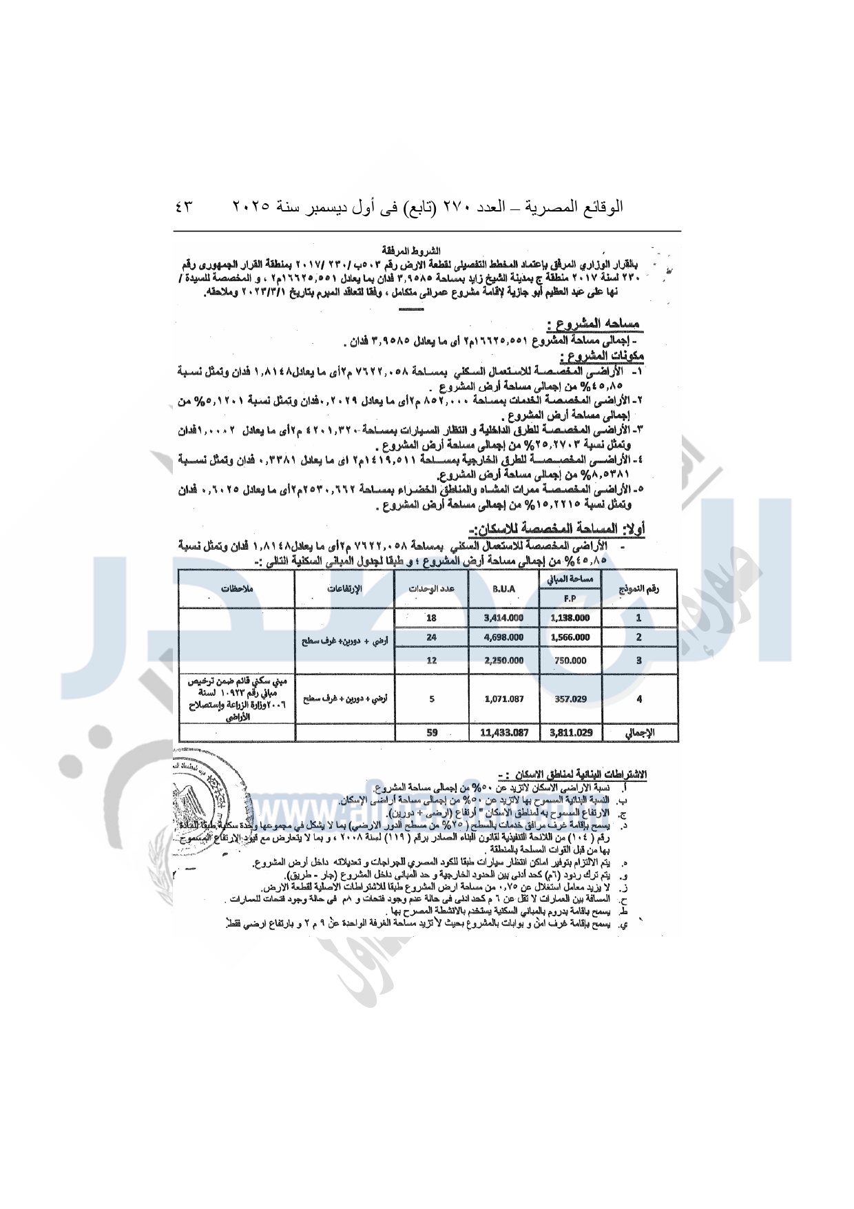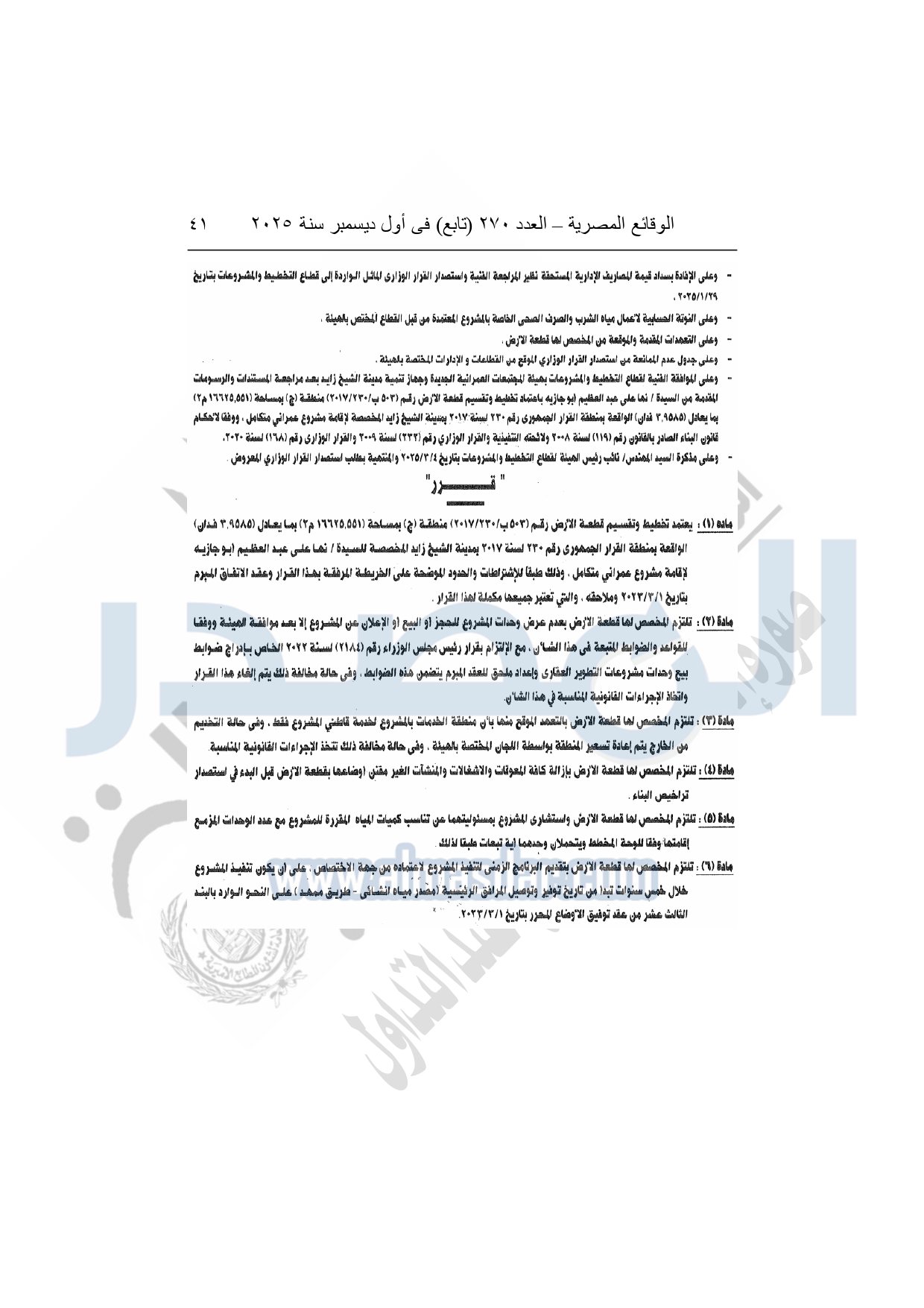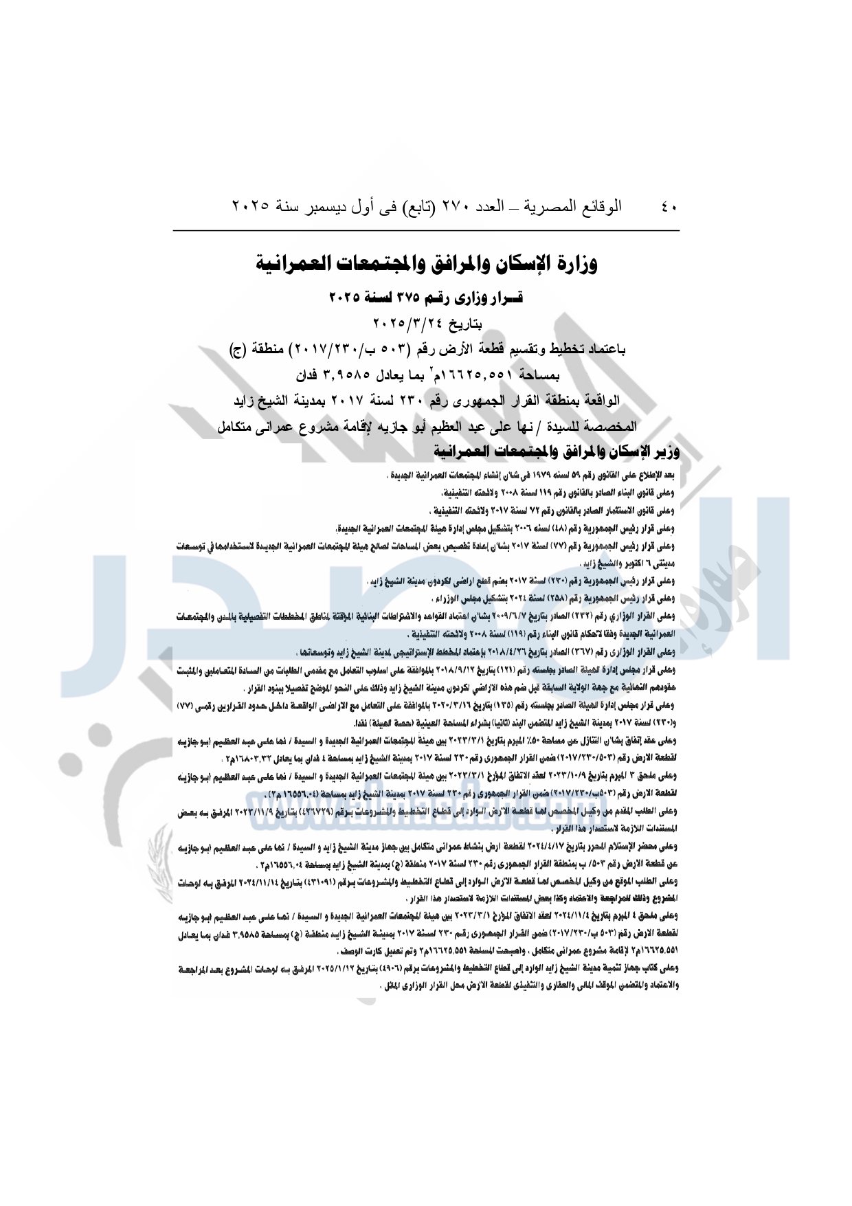 نشرت الوقائع المصرية في العدد 270 "تابع"، بتاريخ أول ديسمبر 2025، قرار وزارة الإسكان والمرافق والمجتمعات العمرانية، رقم 375 لسنة 2025، بتاريخ 24-3-2025، بشأن اعتماد تخطيط وتقسيم قطعة الأرض رقم "503 ب / 230 / 2017" منطقة بمساحة 16625.551م2 بما يعادل 3.9585 فدان الواقعة بمنطقة القرار الجمهورى رقم 230 لسنة 2017 بمدينة الشيخ زايد المخصصة لـ نها على عبد العظيم أبو جازيه لإقامة مشروع عمراني متكامل.