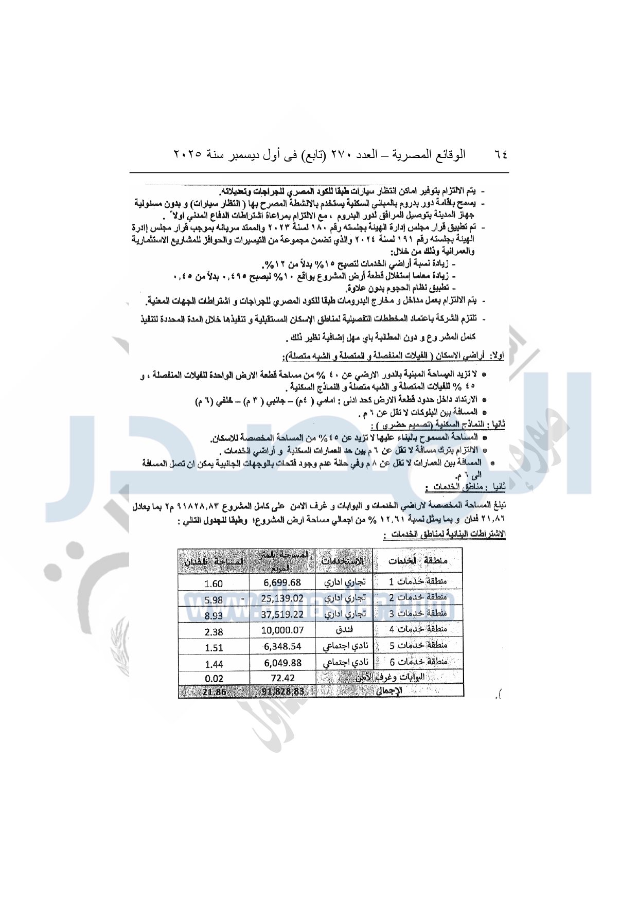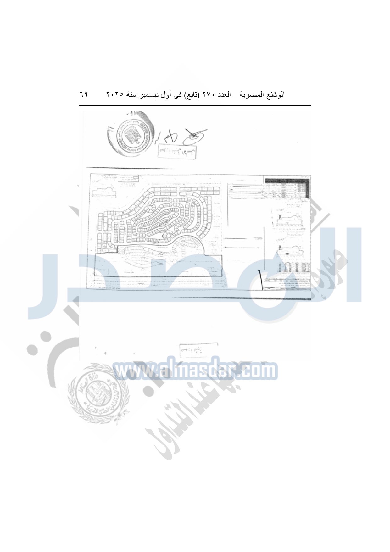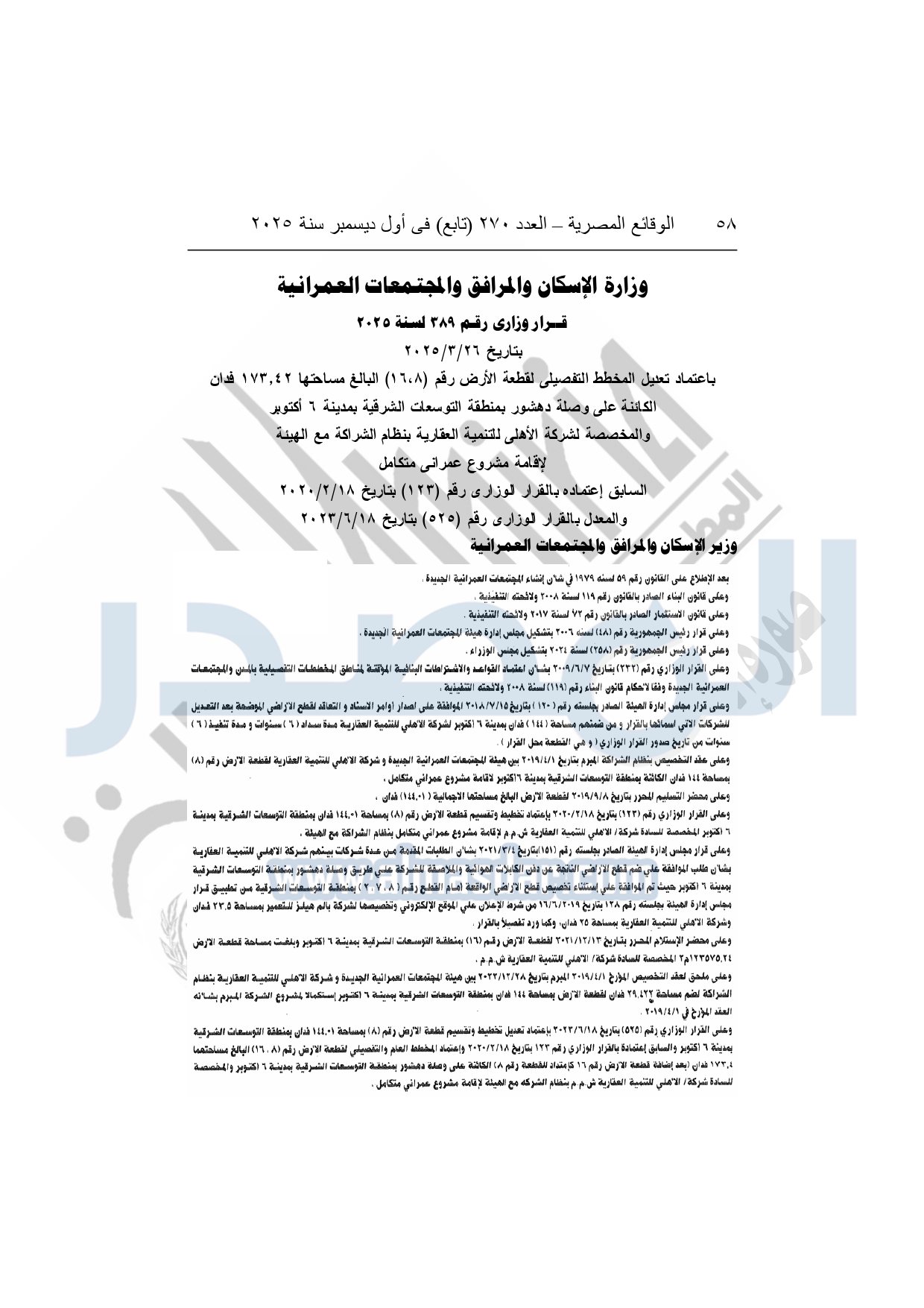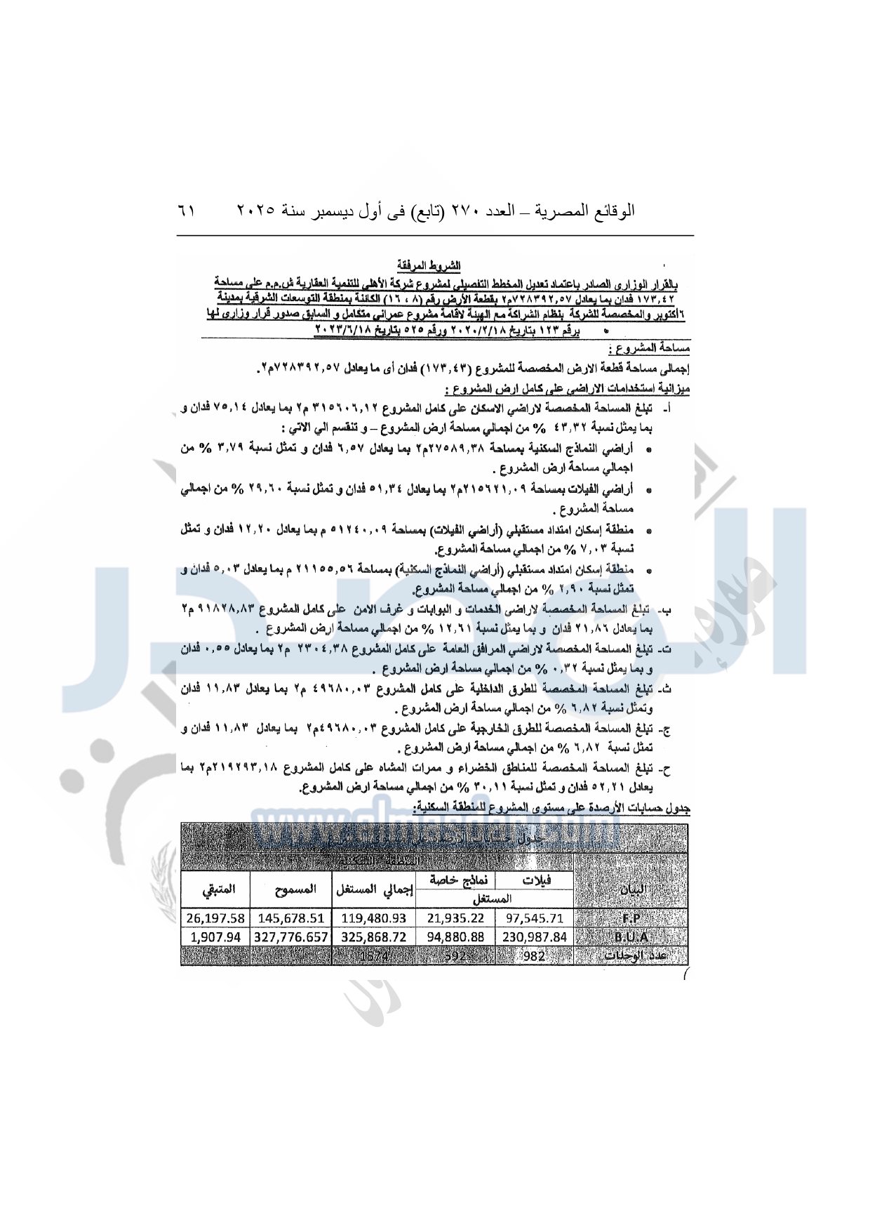 نشرت الوقائع المصرية في العدد 270 "تابع"، بتاريخ أول ديسمبر 2025، قرار وزارة الإسكان والمرافق والمجتمعات العمرانية، رقم 389 لسنة 2025، بتاريخ 26-3-2025، بشأن اعتماد تعديل المخطط التفصيلى لقطعة الأرض رقم "8، 16" البالغ مساحتها 173.42 فدان الكائنة على وصلة دهشور بمنطقة التوسعات الشرقية بمدينة 6 أكتوبر والمخصصة لشركة الأهلى للتنمية العقارية بنظام الشراكة مع الهيئة لإقامة مشروع عمراني متكامل السابق إعتماده بالقرار الوزارى رقم "123" بتاريخ 18-2-2020 والمعدل بالقرار الوزارى رقم "525" بتاريخ 18-6-2023.