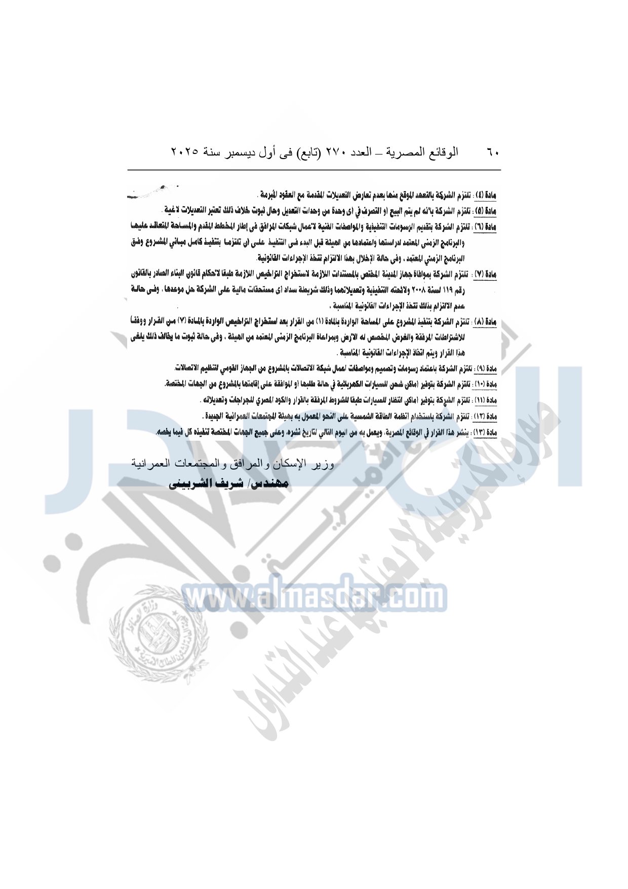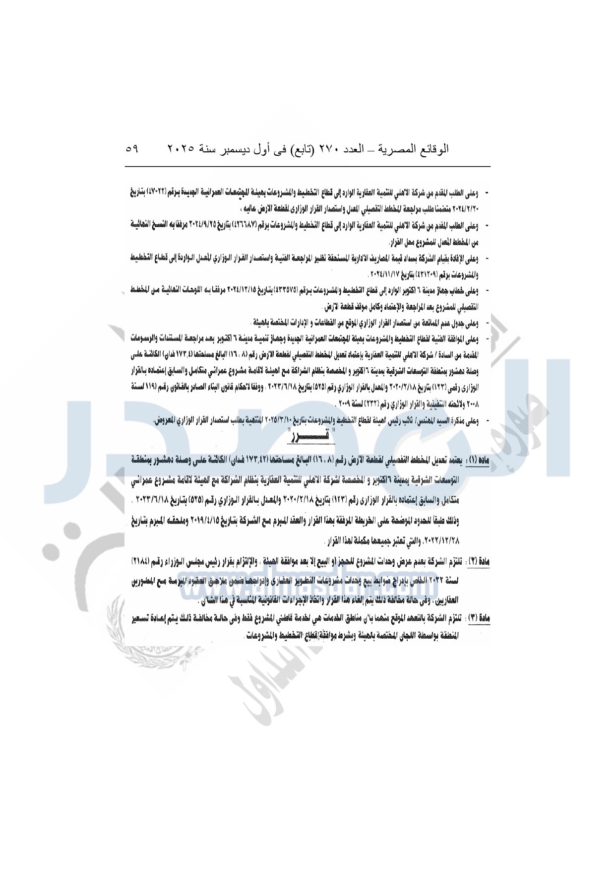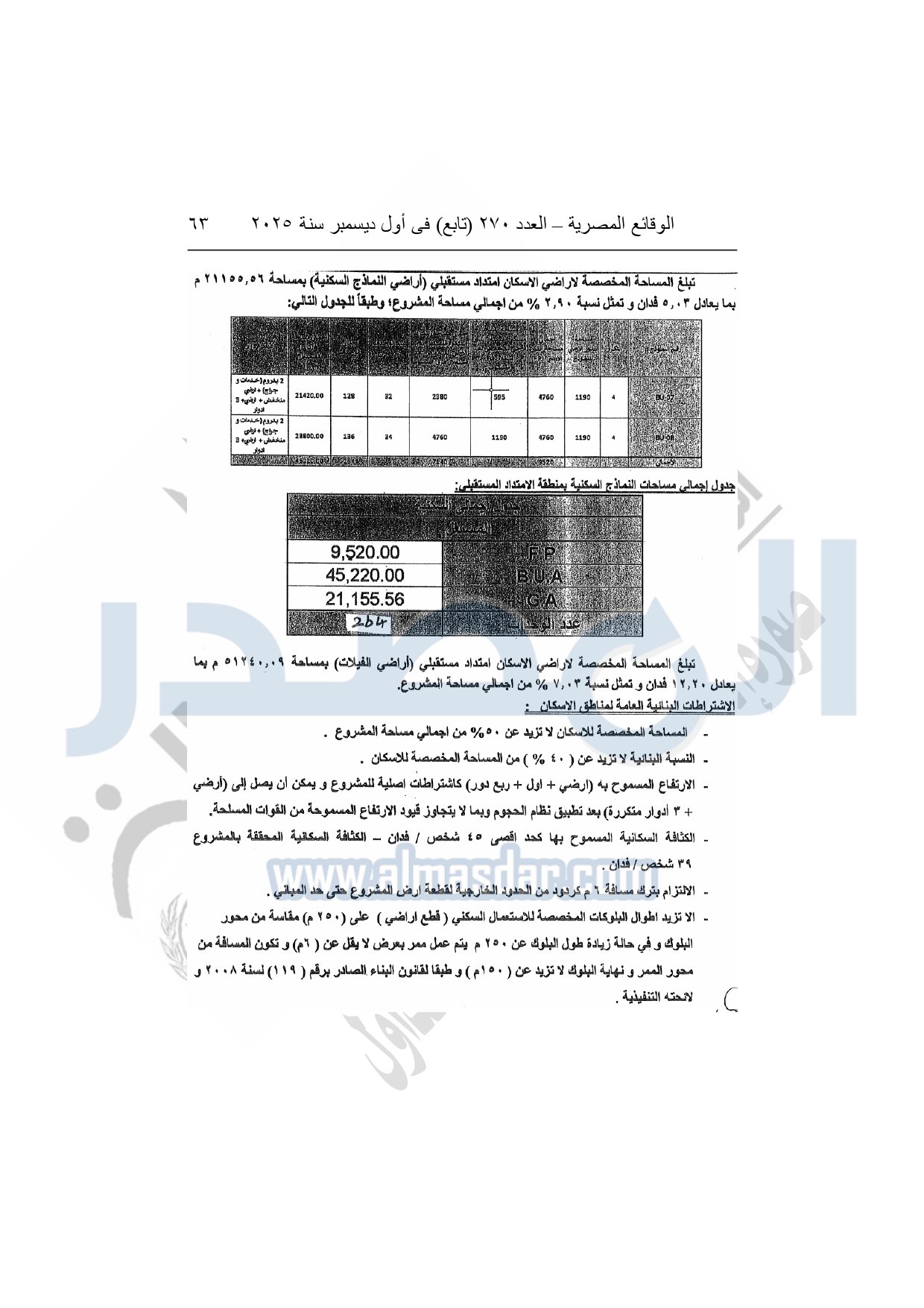 نشرت الوقائع المصرية في العدد 270 "تابع"، بتاريخ أول ديسمبر 2025، قرار وزارة الإسكان والمرافق والمجتمعات العمرانية، رقم 389 لسنة 2025، بتاريخ 26-3-2025، بشأن اعتماد تعديل المخطط التفصيلى لقطعة الأرض رقم "8، 16" البالغ مساحتها 173.42 فدان الكائنة على وصلة دهشور بمنطقة التوسعات الشرقية بمدينة 6 أكتوبر والمخصصة لشركة الأهلى للتنمية العقارية بنظام الشراكة مع الهيئة لإقامة مشروع عمراني متكامل السابق إعتماده بالقرار الوزارى رقم "123" بتاريخ 18-2-2020 والمعدل بالقرار الوزارى رقم "525" بتاريخ 18-6-2023.