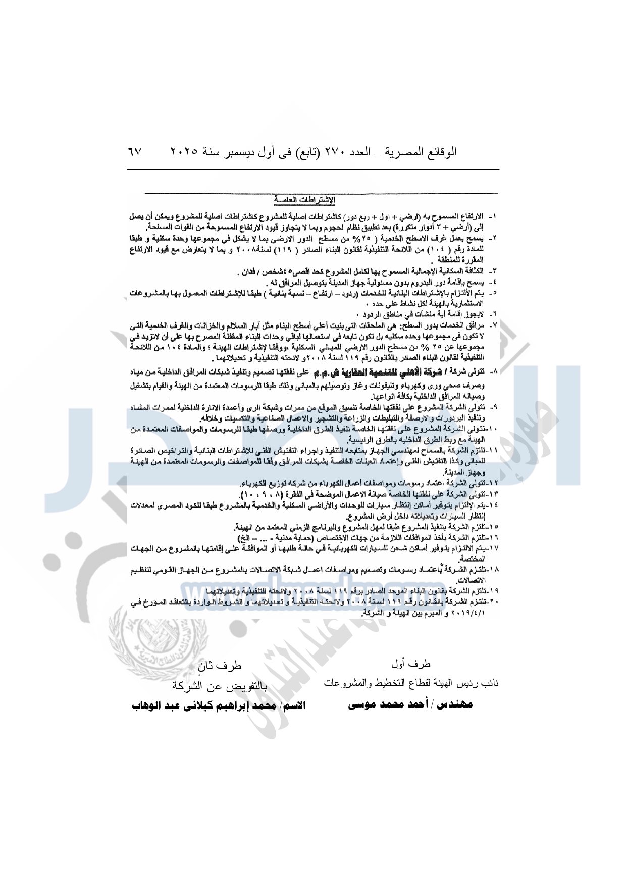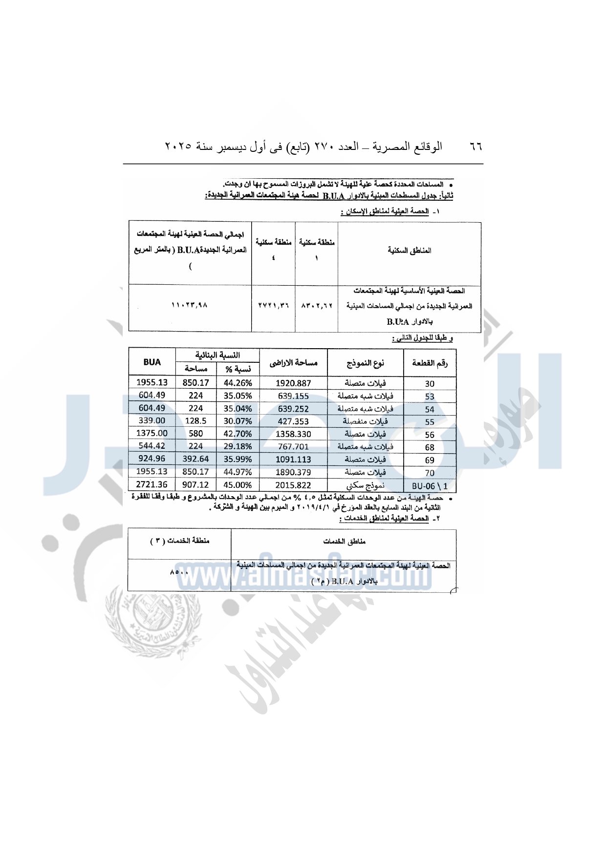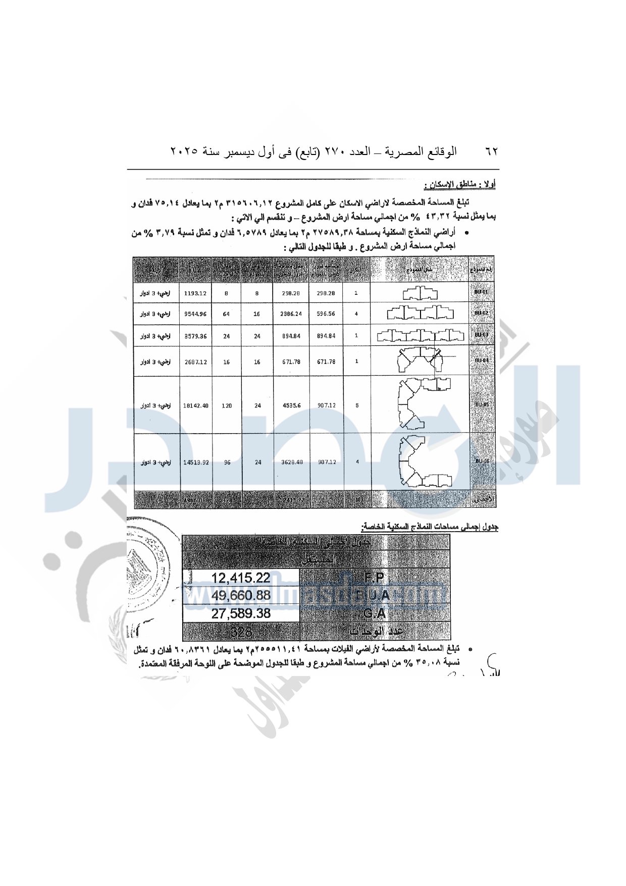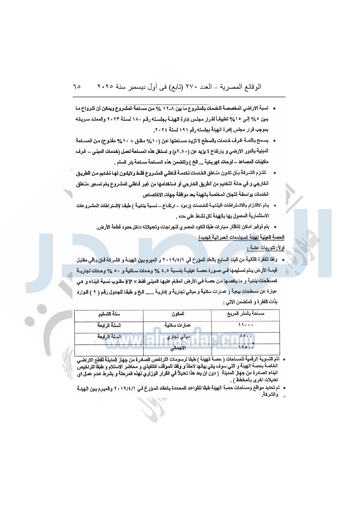 نشرت الوقائع المصرية في العدد 270 "تابع"، بتاريخ أول ديسمبر 2025، قرار وزارة الإسكان والمرافق والمجتمعات العمرانية، رقم 389 لسنة 2025، بتاريخ 26-3-2025، بشأن اعتماد تعديل المخطط التفصيلى لقطعة الأرض رقم "8، 16" البالغ مساحتها 173.42 فدان الكائنة على وصلة دهشور بمنطقة التوسعات الشرقية بمدينة 6 أكتوبر والمخصصة لشركة الأهلى للتنمية العقارية بنظام الشراكة مع الهيئة لإقامة مشروع عمراني متكامل السابق إعتماده بالقرار الوزارى رقم "123" بتاريخ 18-2-2020 والمعدل بالقرار الوزارى رقم "525" بتاريخ 18-6-2023.