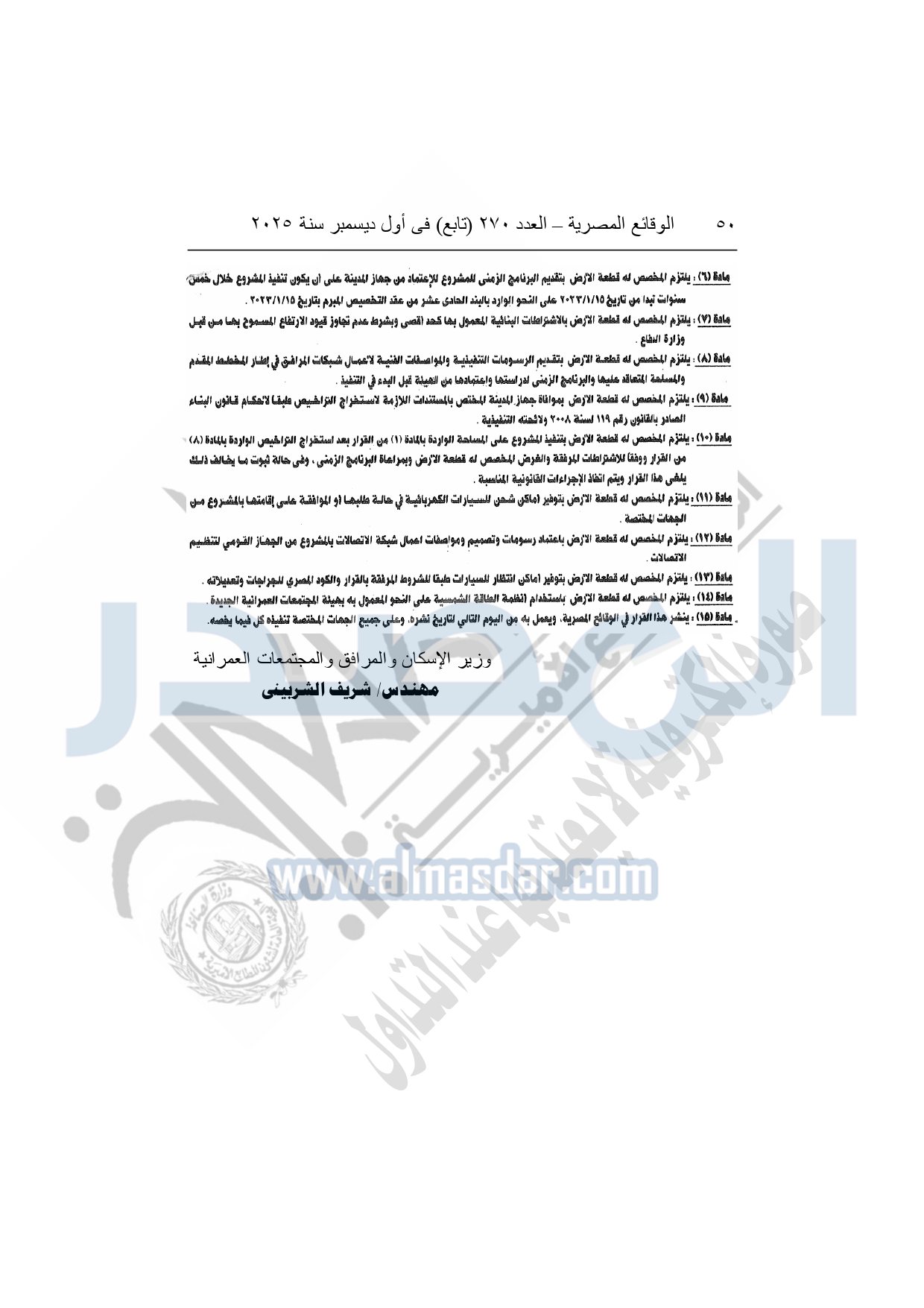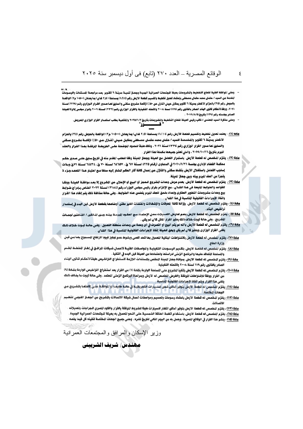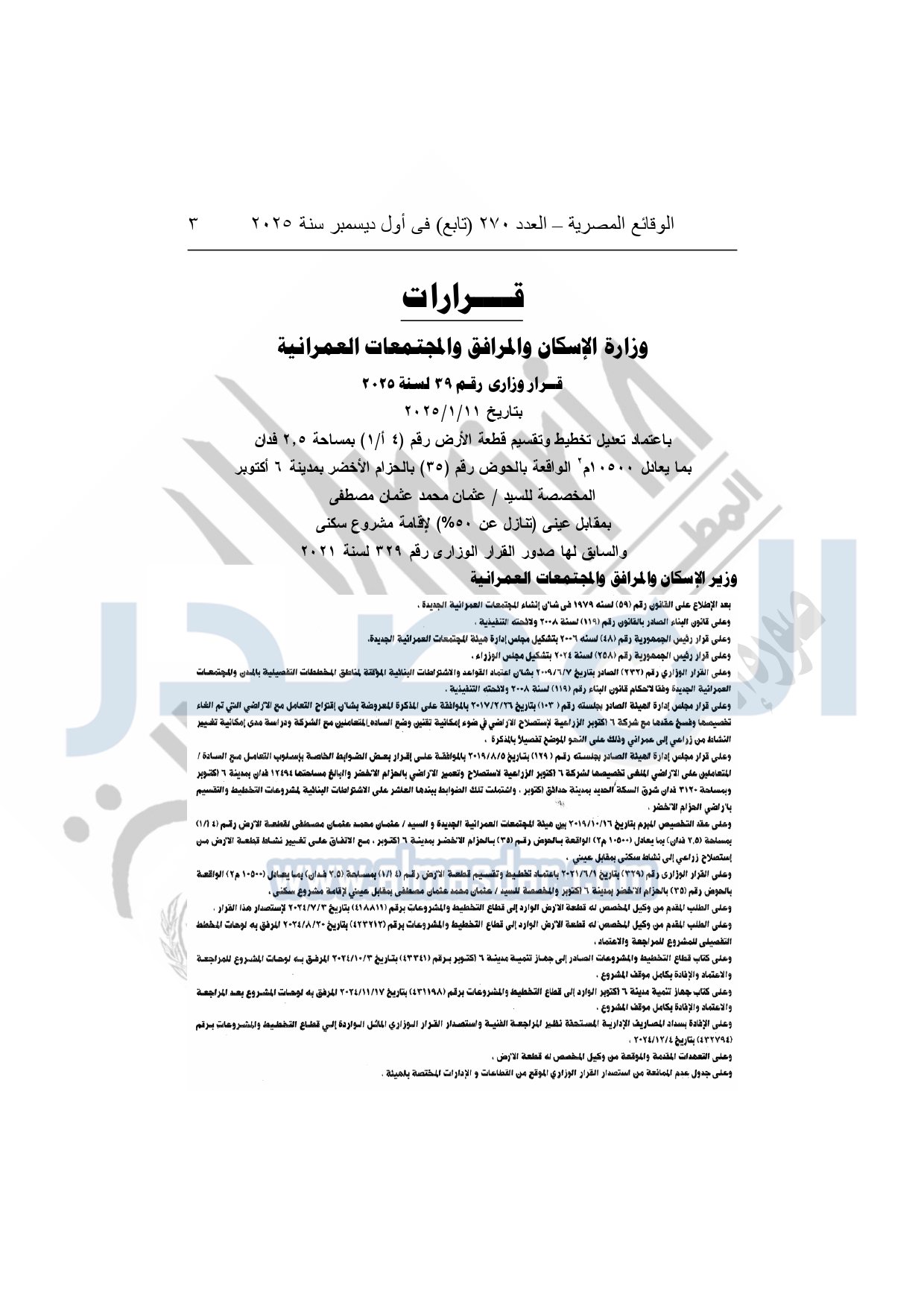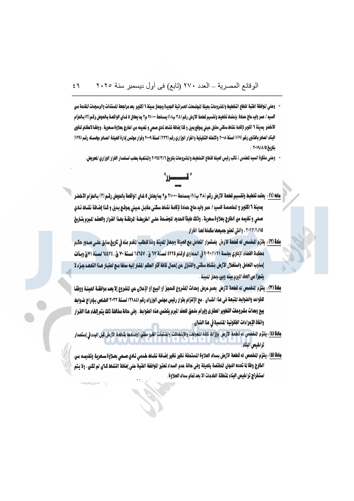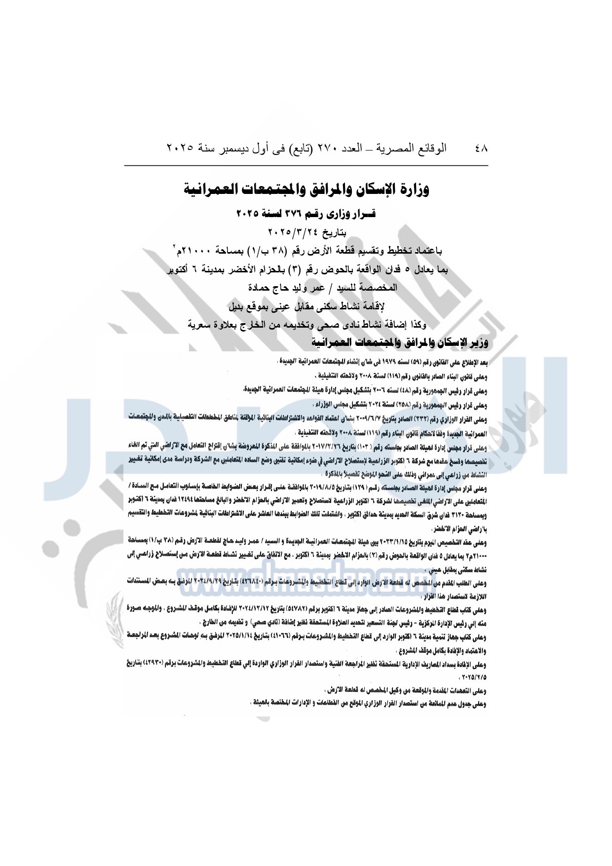 كما نشرت الوقائع المصرية في العدد 270 "تابع"، بتاريخ أول ديسمبر 2025، قرار وزارة الإسكان والمرافق والمجتمعات العمرانية، رقم 376 لسنة 2025، بتاريخ 24-3-2025، بشأن اعتماد تخطيط وتقسيم قطعة الأرض رقم "38 ب/ 1" بمساحة 21000م2 بما يعادل 5 فدان الواقعة بالحوض رقم "3" بالحزام الأخضر بمدينة 6 أكتوبر المخصصة لـ عمر وليد حاج حمادة لإقامة نشاط سكنى مقابل عيني بموقع بديل وكذا إضافة نشاط نادى صحى وتخديمه من الخارج بعلاوة سعرية.