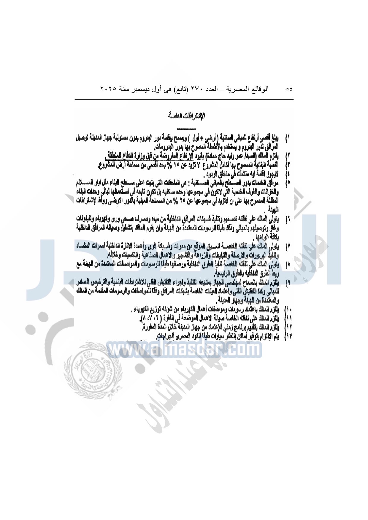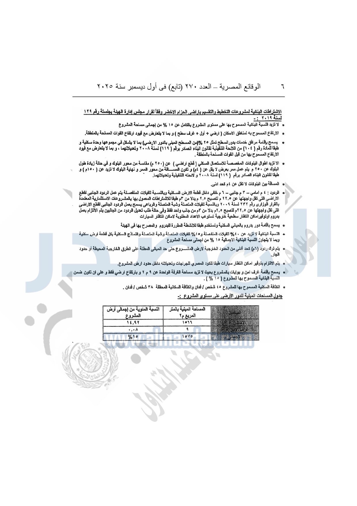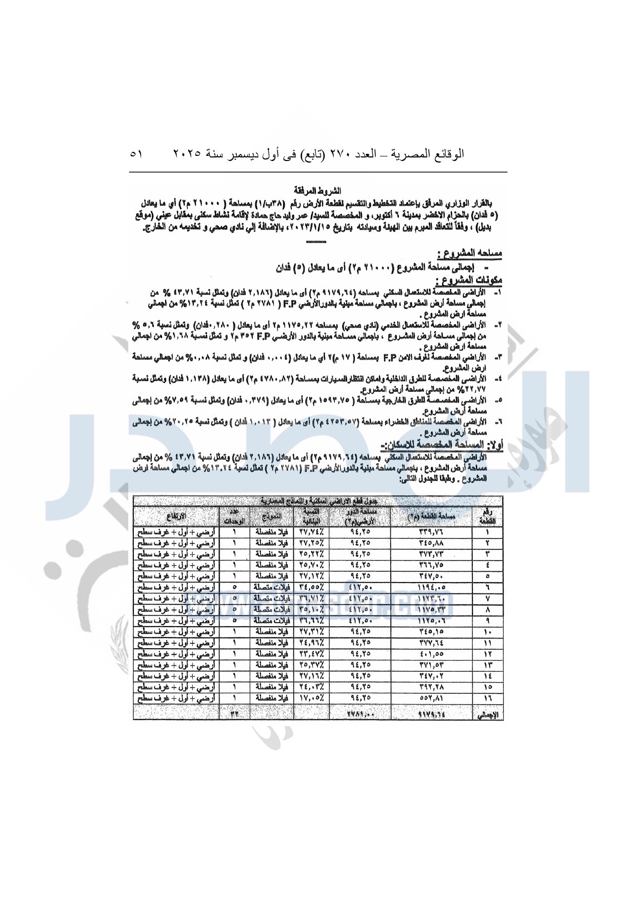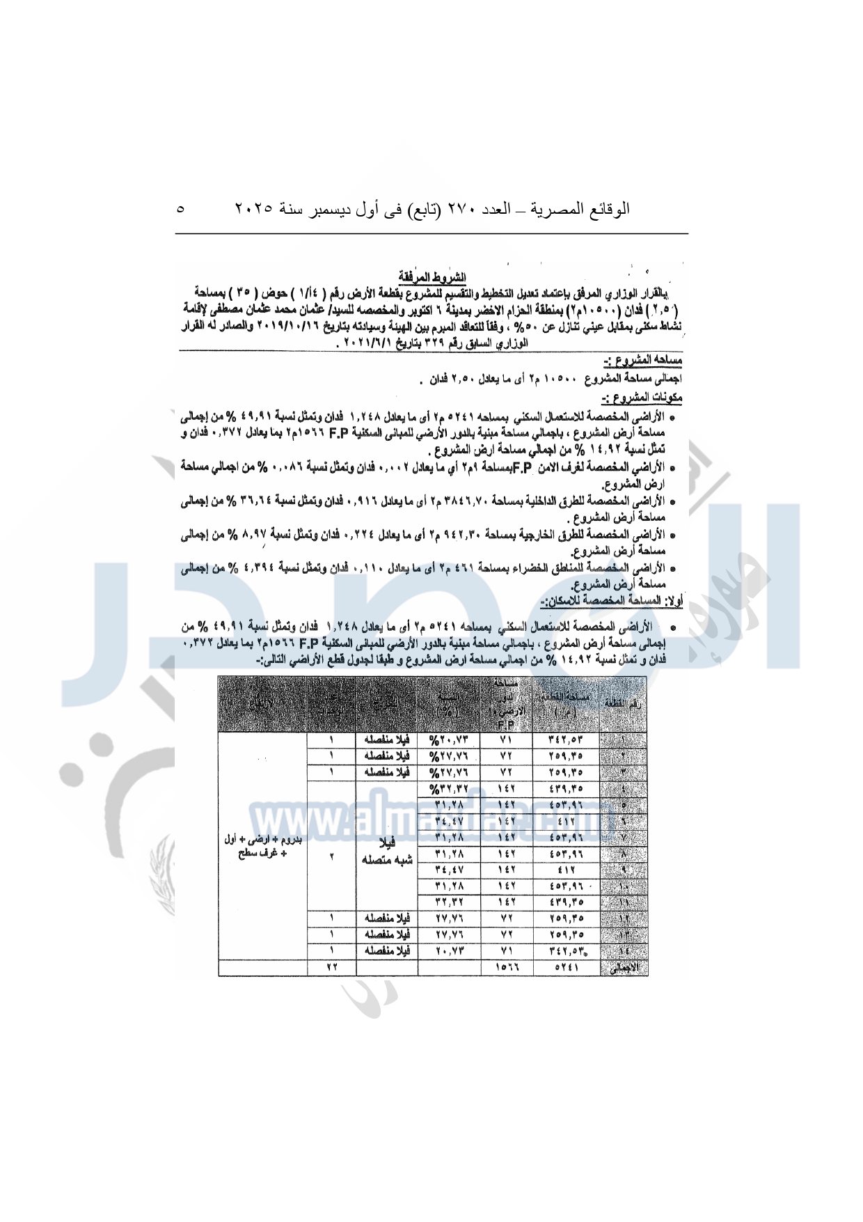 كما نشرت الوقائع المصرية في العدد 270 "تابع"، بتاريخ أول ديسمبر 2025، قرار وزارة الإسكان والمرافق والمجتمعات العمرانية، رقم 376 لسنة 2025، بتاريخ 24-3-2025، بشأن اعتماد تخطيط وتقسيم قطعة الأرض رقم "38 ب/ 1" بمساحة 21000م2 بما يعادل 5 فدان الواقعة بالحوض رقم "3" بالحزام الأخضر بمدينة 6 أكتوبر المخصصة لـ عمر وليد حاج حمادة لإقامة نشاط سكنى مقابل عيني بموقع بديل وكذا إضافة نشاط نادى صحى وتخديمه من الخارج بعلاوة سعرية.