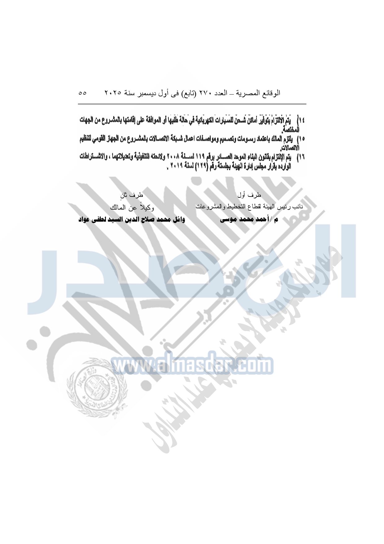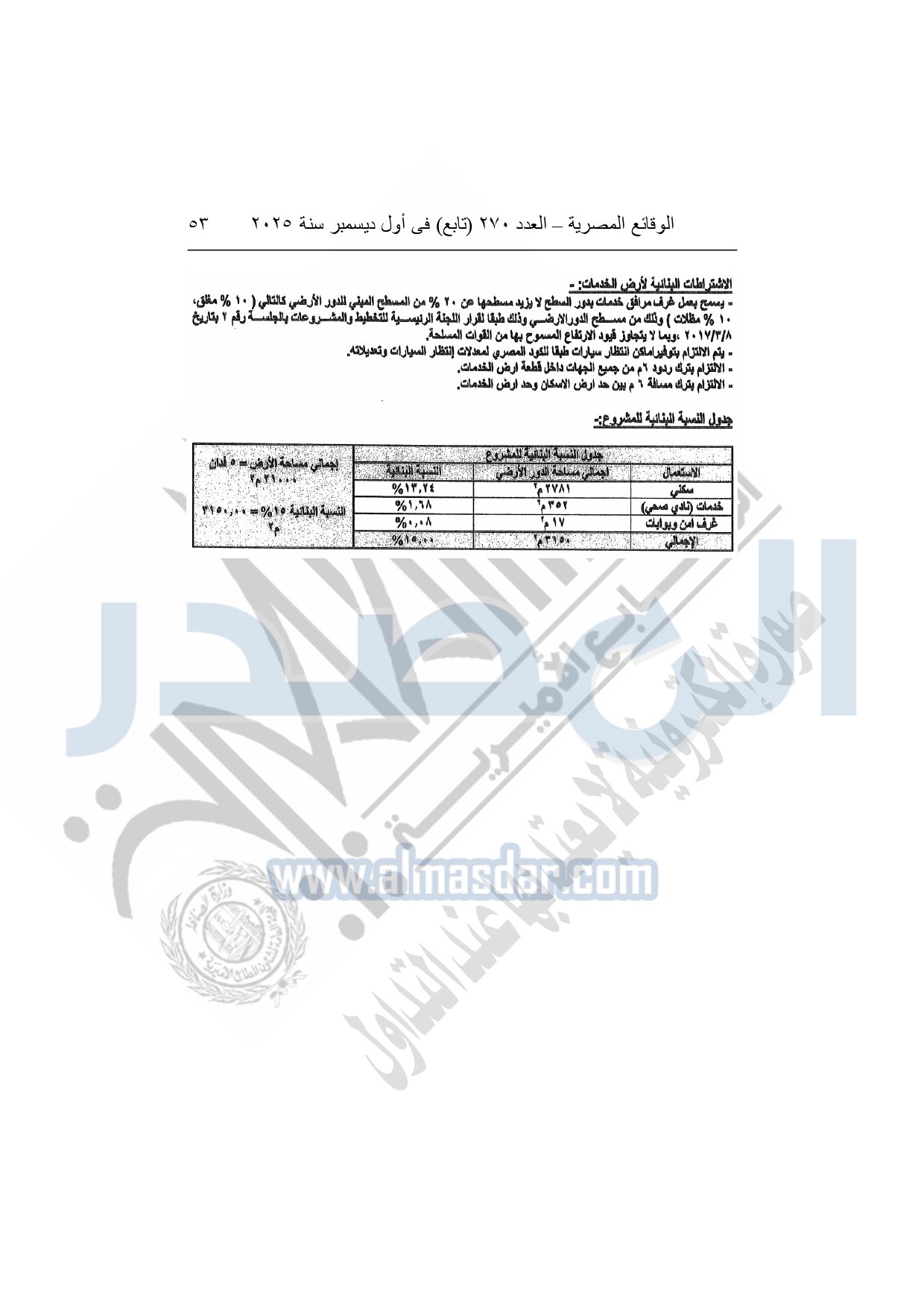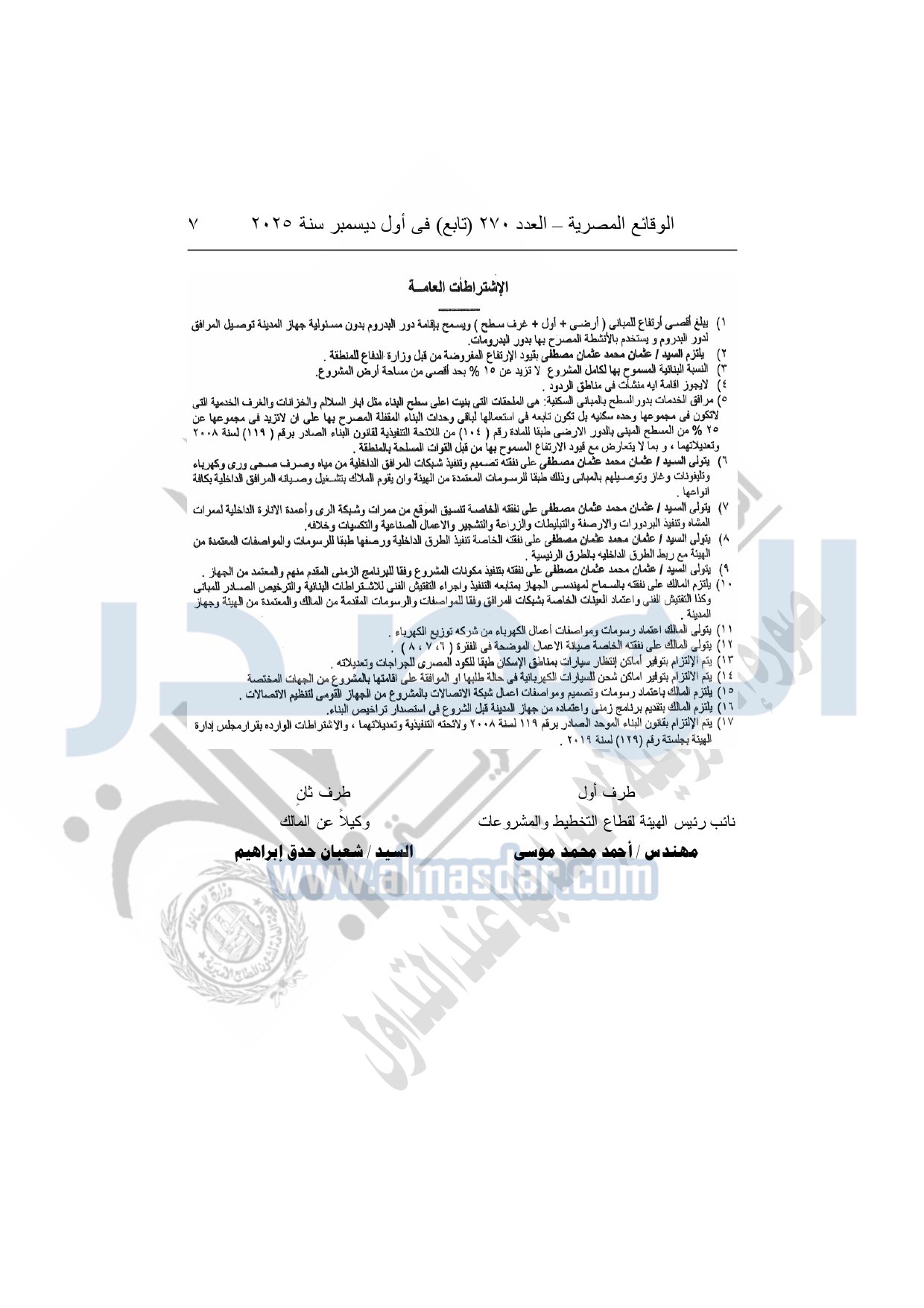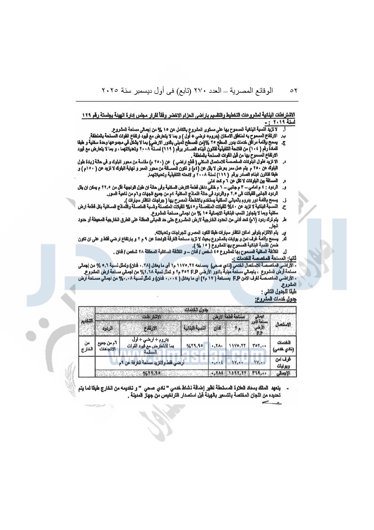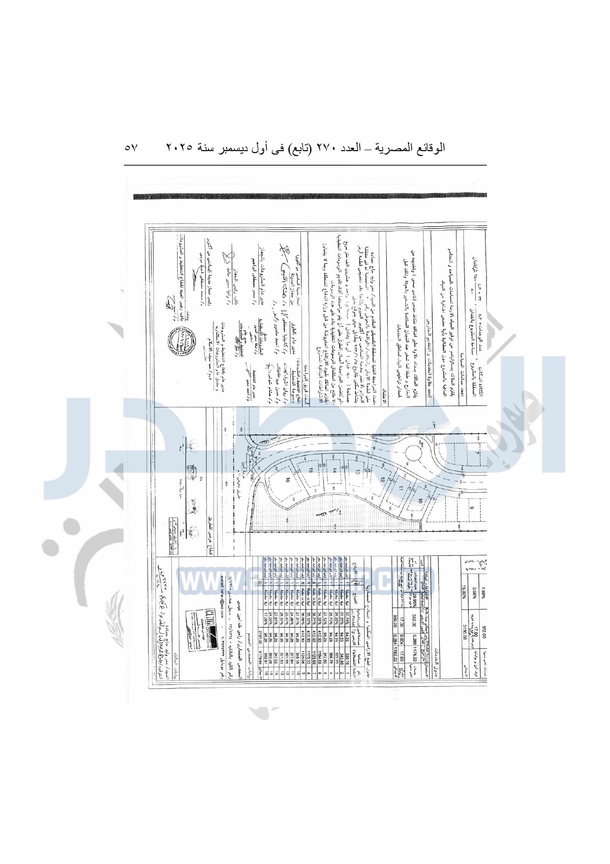 كما نشرت الوقائع المصرية في العدد 270 "تابع"، بتاريخ أول ديسمبر 2025، قرار وزارة الإسكان والمرافق والمجتمعات العمرانية، رقم 376 لسنة 2025، بتاريخ 24-3-2025، بشأن اعتماد تخطيط وتقسيم قطعة الأرض رقم "38 ب/ 1" بمساحة 21000م2 بما يعادل 5 فدان الواقعة بالحوض رقم "3" بالحزام الأخضر بمدينة 6 أكتوبر المخصصة لـ عمر وليد حاج حمادة لإقامة نشاط سكنى مقابل عيني بموقع بديل وكذا إضافة نشاط نادى صحى وتخديمه من الخارج بعلاوة سعرية.