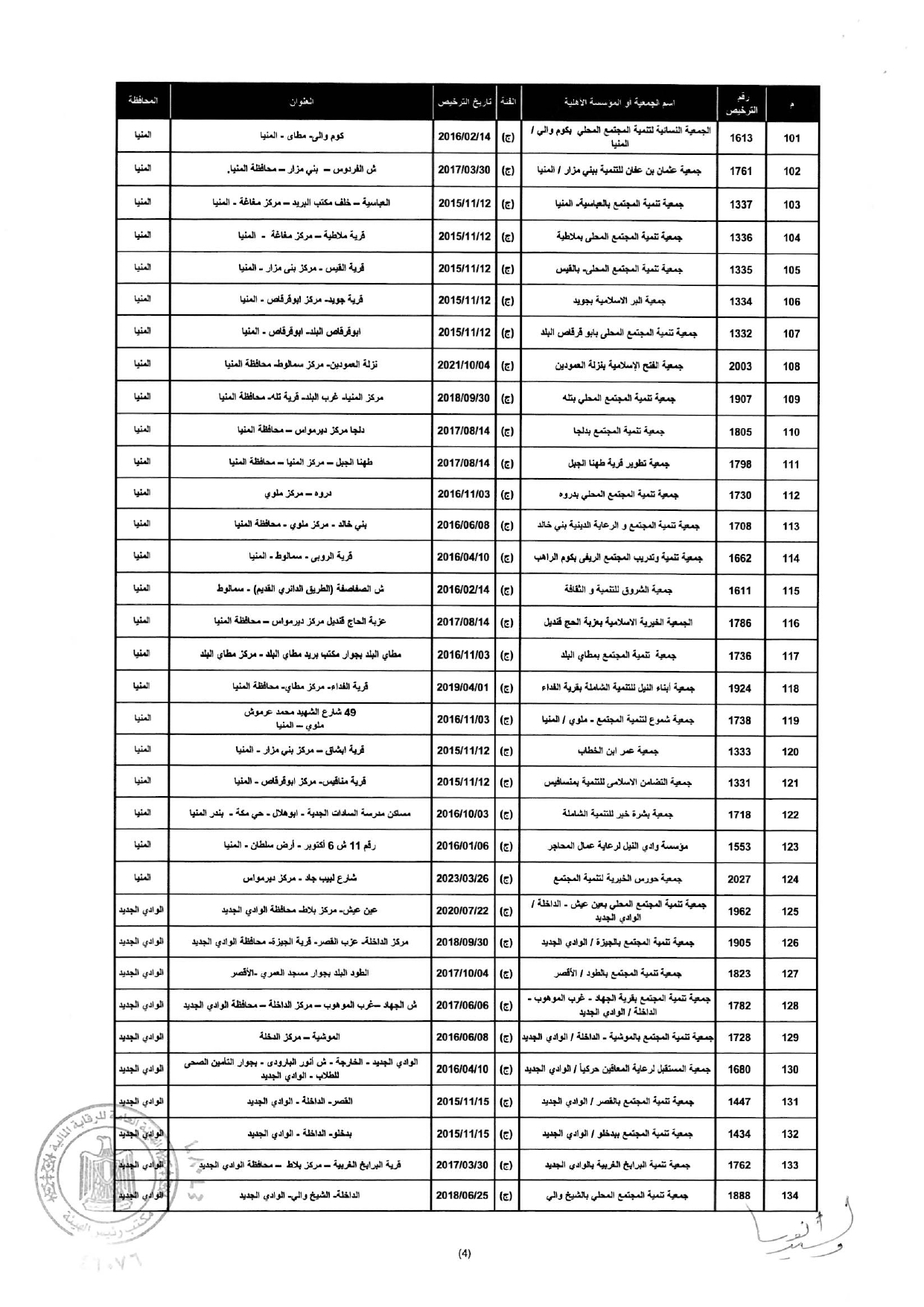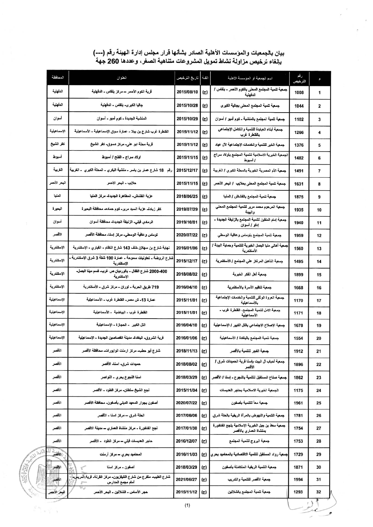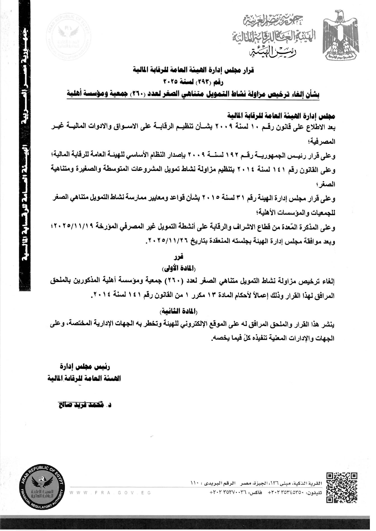 إلغاء ترخيص مزاولة نشاط التمويل متناهى الصغر لعدد "260" جمعية ومؤسسة أهلية المذكورين بالمحلق المرافق لهذا القرار وذلك إعمالًا لأحكام المادة 13 مكرر 1 من القانون رقم 141 لسنة 2014.