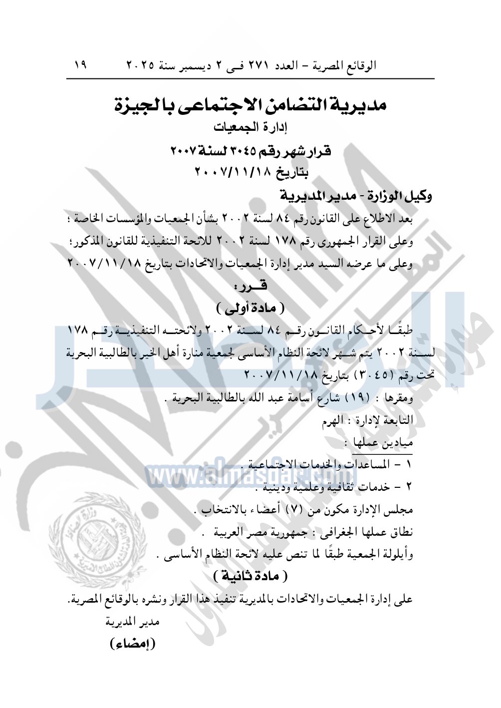 نشرت الوقائع المصرية في العدد 271، الصادر في 2 ديسمبر سنة 2025، قرار مديرية التضامن الاجتماعى بالجيزة، قرر شهر رقم 3045 لسنة 2007، بتاريخ 18-11-2007، الخاص بإشهار جمعية منارة أهل الخير بالطالبية البحرية.