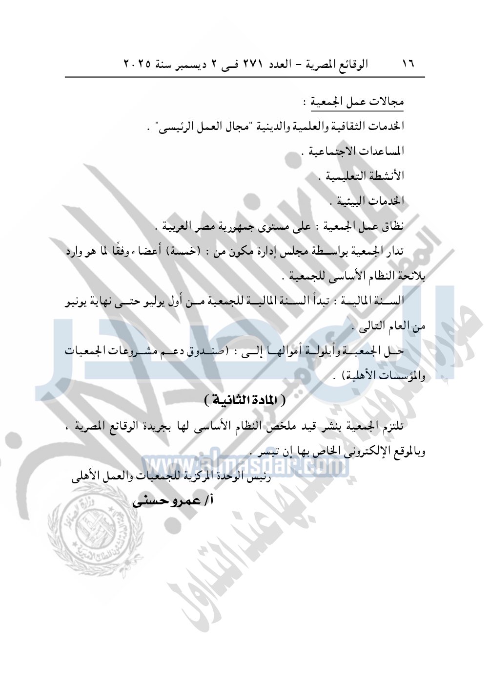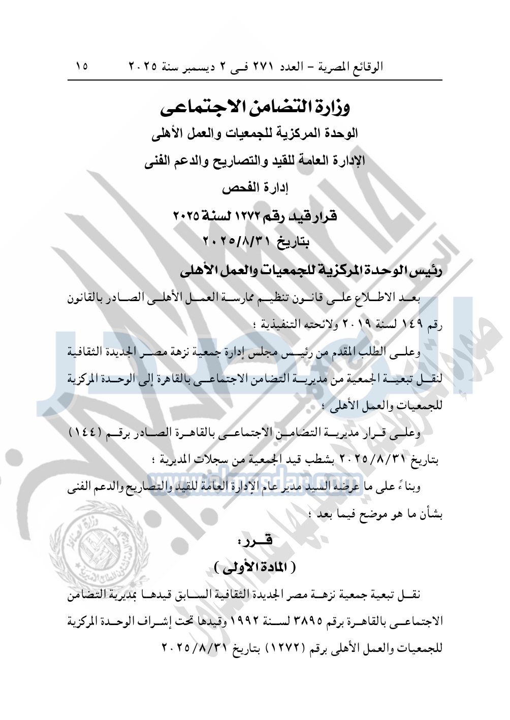 نشرت الوقائع المصرية في العدد 271، بتاريخ 2 ديسمبر 2025، قرار وزارة التضامن الاجتماعي، قيد رقم 1272 لسنة 2025، بتاريخ 31-8-2025، بشأن قيد جمعية نزهة مصر الجديدة الثقافية.