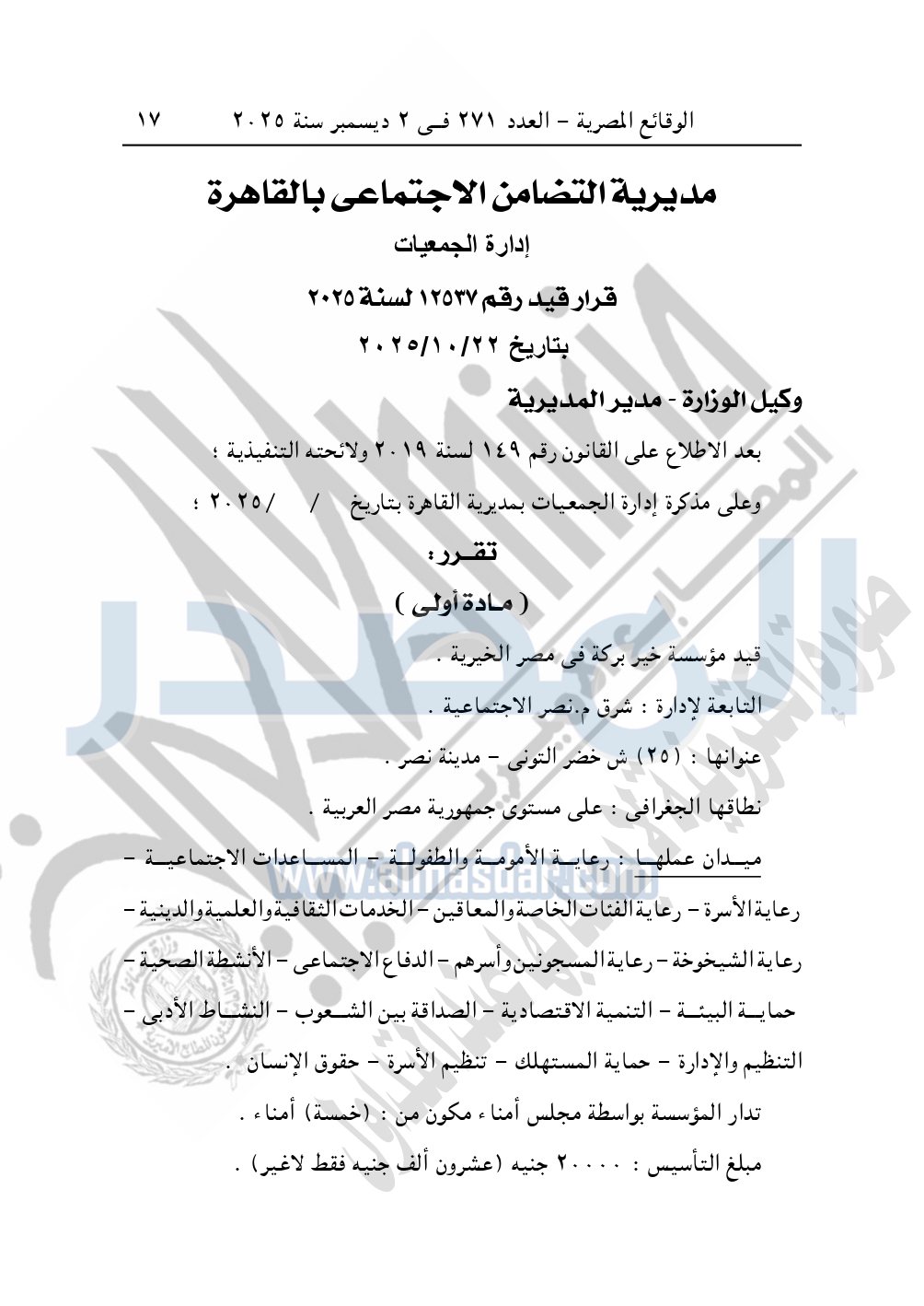 كما نشرت الوقائع المصرية في العدد 271، بتاريخ 2 ديسمبر 2025، قرار مديرية التضامن الاجتماعي بالقاهرة، قيد رقم 12537 لسنة 2025، بتاريخ 22-10-2025، بشأن قيد مؤسسة خير بركة في مصر الخيرية.
