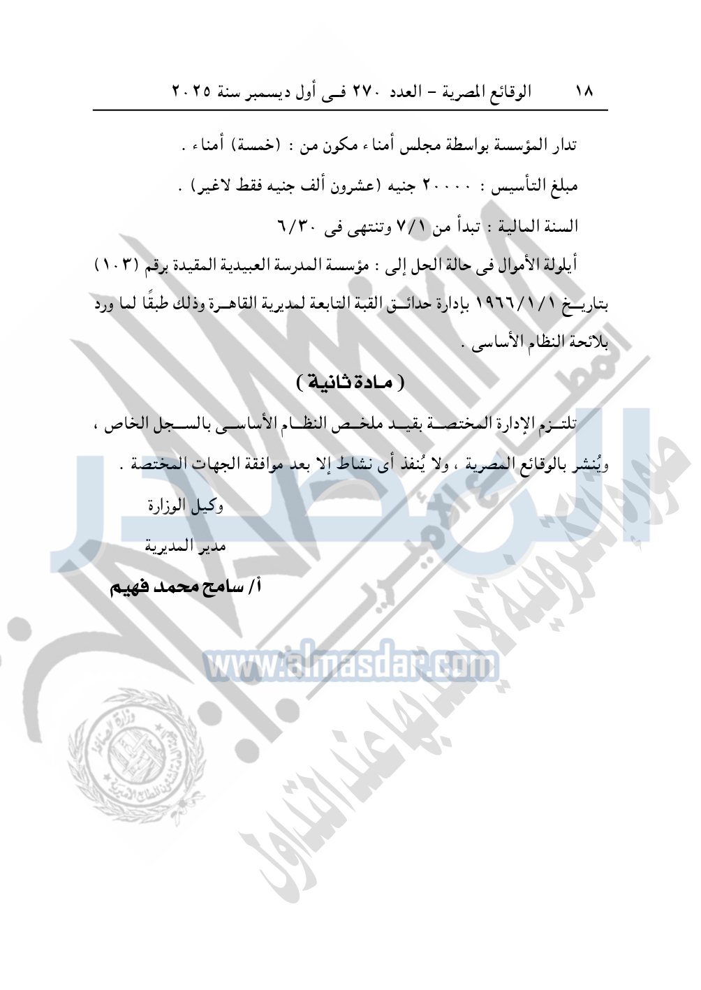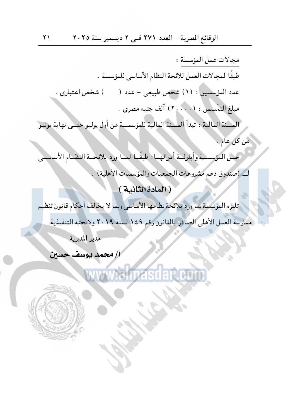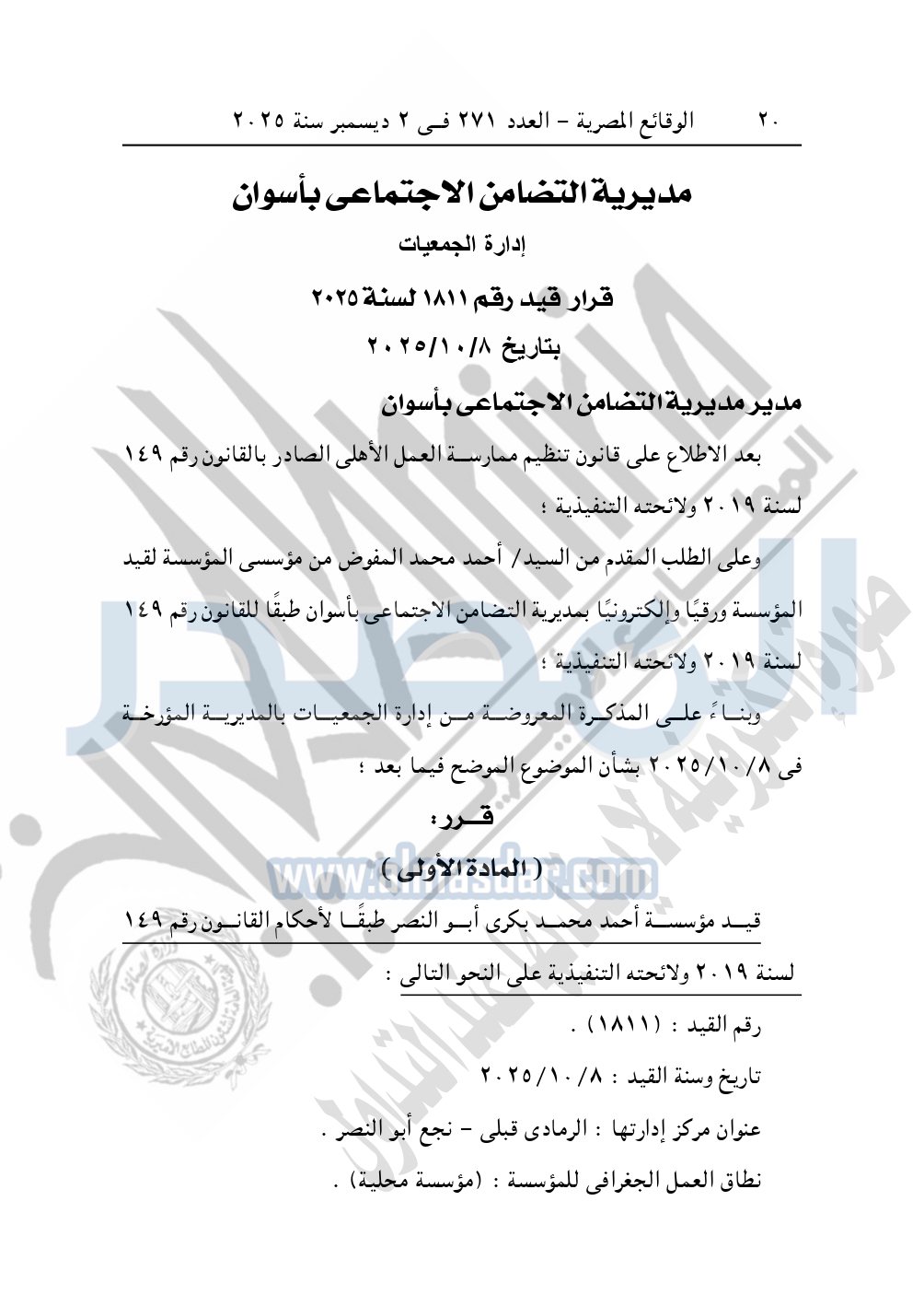 ونشرت الوقائع المصرية في العدد 271، بتاريخ 2 ديسمبر 2025، قرار مديرية التضامن الاجتماعي بأسوان، قيد رقم 1811 لسنة 2025، بتاريخ 8-10-2025، بشأن قيد مؤسسة أحمد محمد بكري أبو النصر.