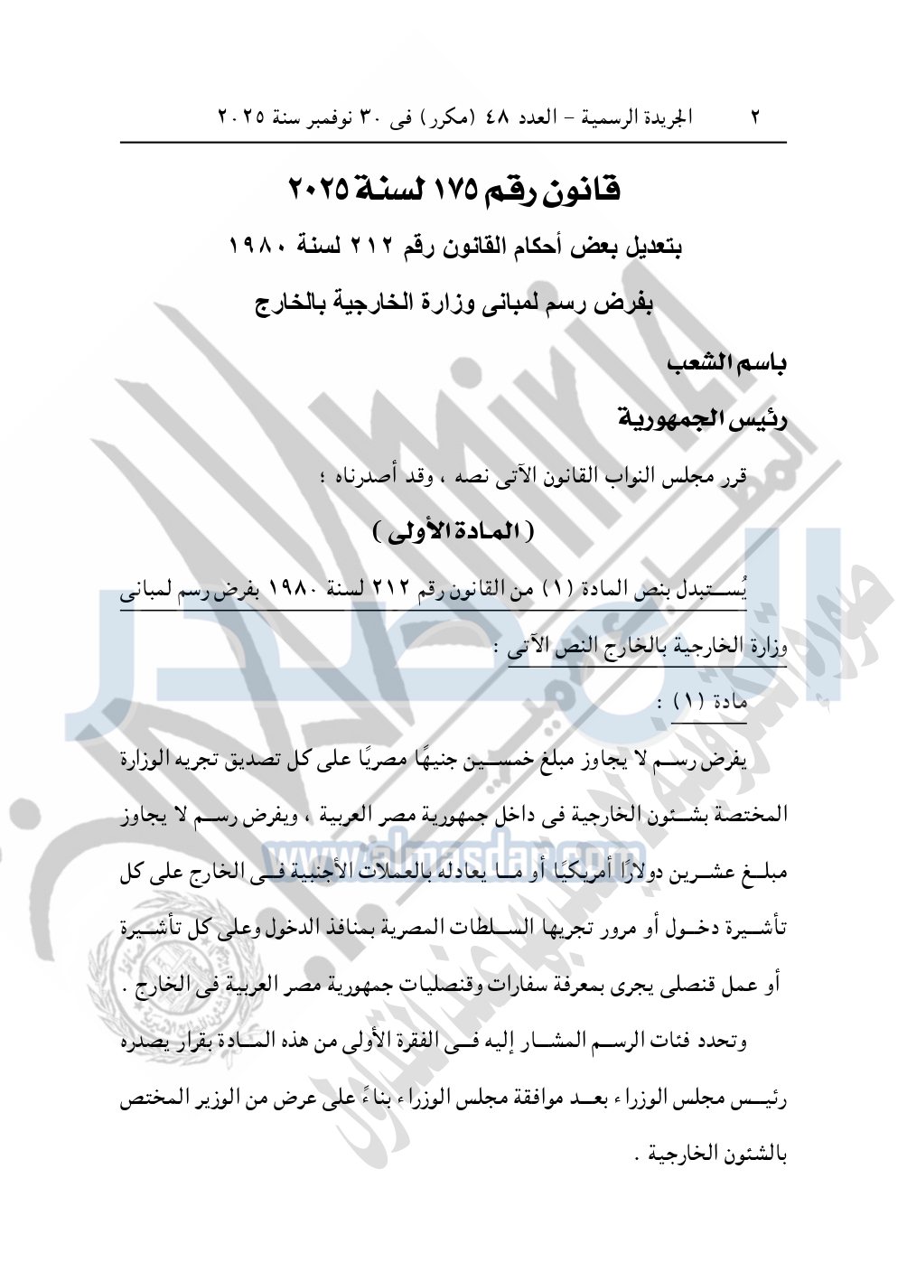 نشرت الجريدة الرسمية، في العدد 48 "مكرر"، الصادر في 30 نوفمبر سنة 2025، قرار رئيس الجمهورية، رقم 175 لسنة 2025، بتعديل بعض أحكام القانون رقم 212 لسنة 1980، بشأن فرض رسم لمبانى وزارة الخارجية بالخارج.