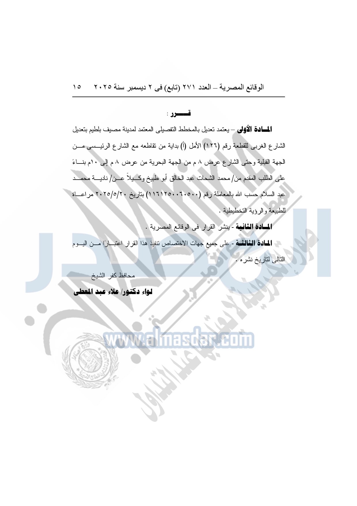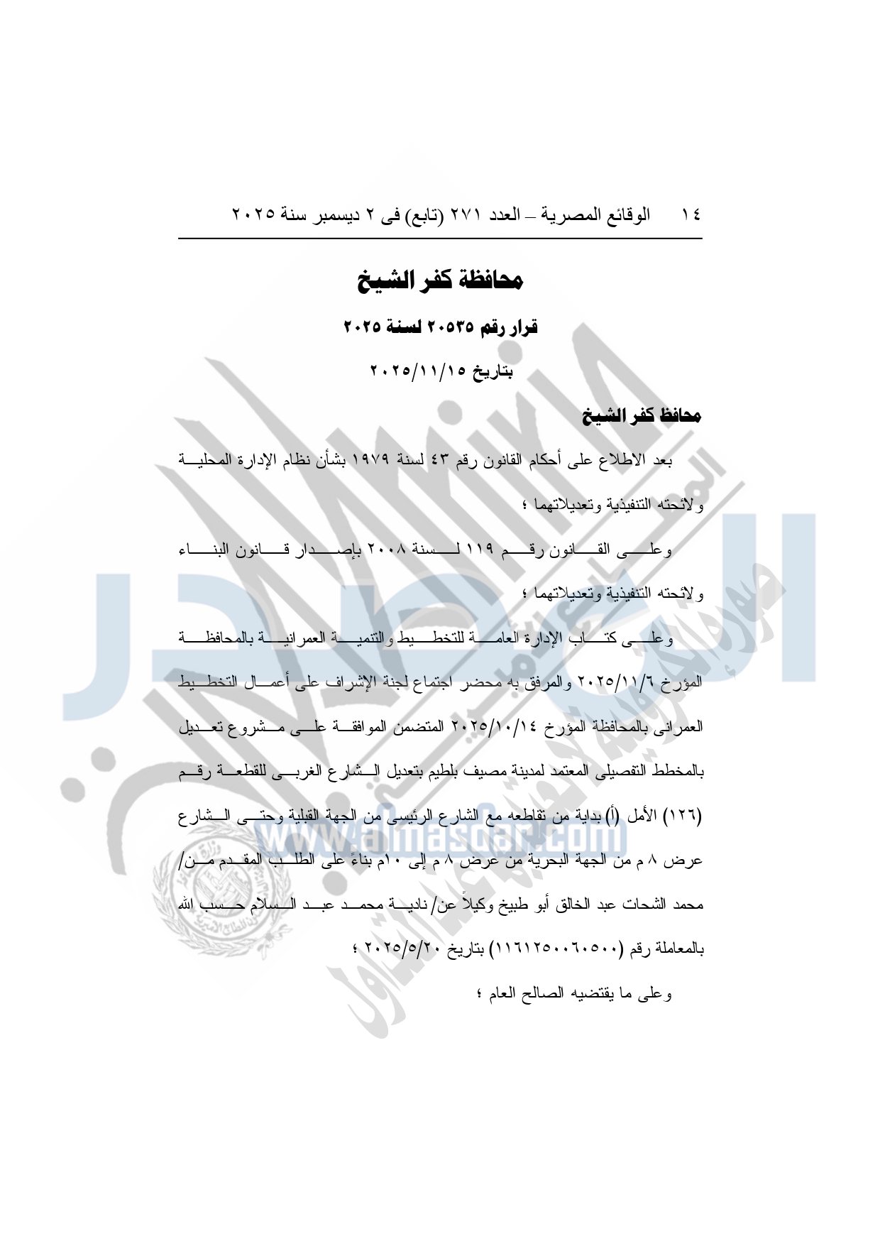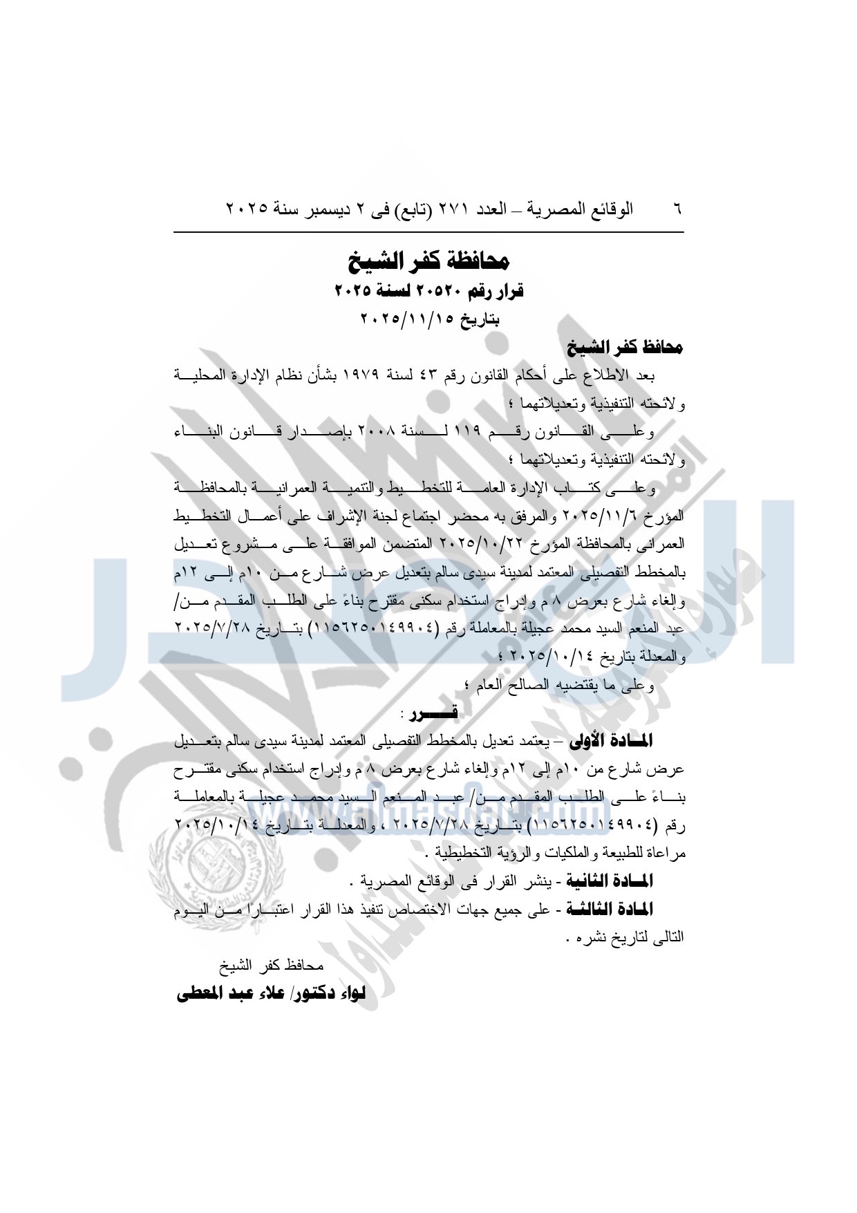 كما نشرت الوقائع المصرية، في العدد 271 "تابع"، الصادر في 2 ديسمبر سنة 2025، قرار محافظة كفر الشيخ، رقم 20520 لسنة 2025، بتاريخ 15-11-2025، بشأن إعتماد تعديل بالمخطط التفصيلي المعتمد لمدينة سيدى سالم.