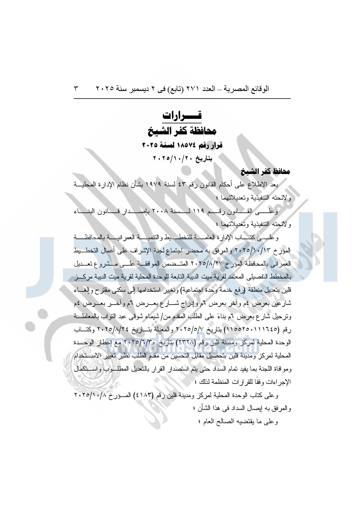 كما نشرت الوقائع المصرية، في العدد 271 "تابع"، الصادر في 2 ديسمبر سنة 2025، قرار محافظة كفر الشيخ، رقم 20521 لسنة 2025، بتاريخ 15-11-2025، بشأن إعتماد تعديل بالمخطط التفصيلي المعتمد لقرية البخانيس.