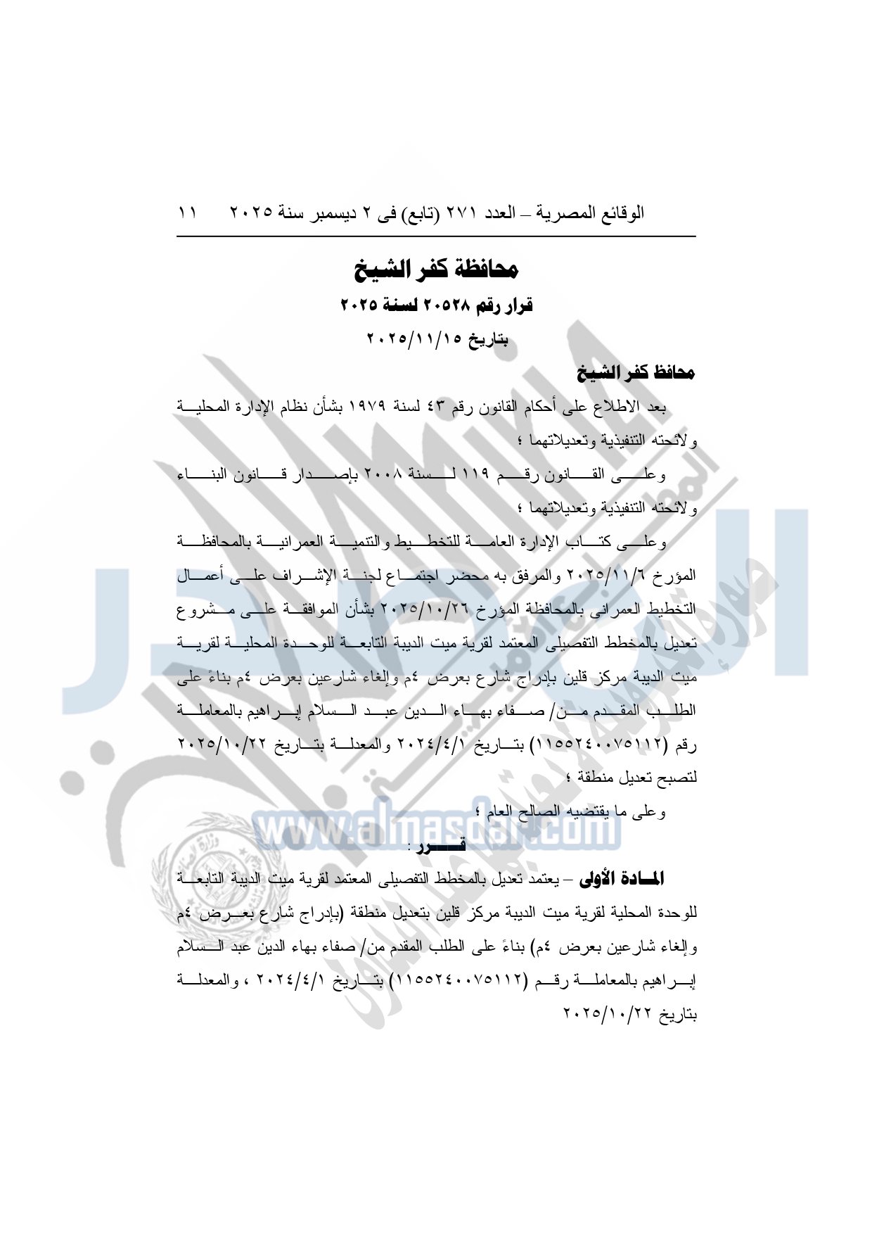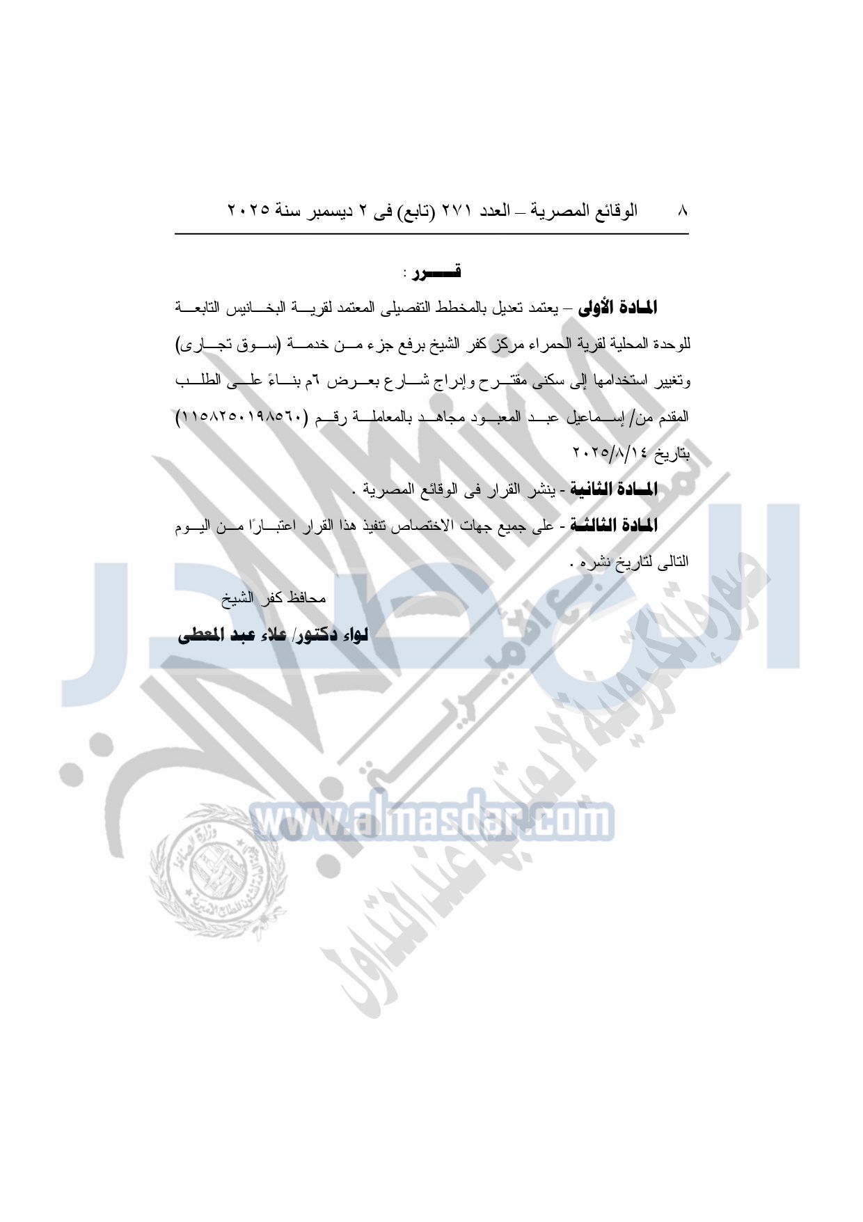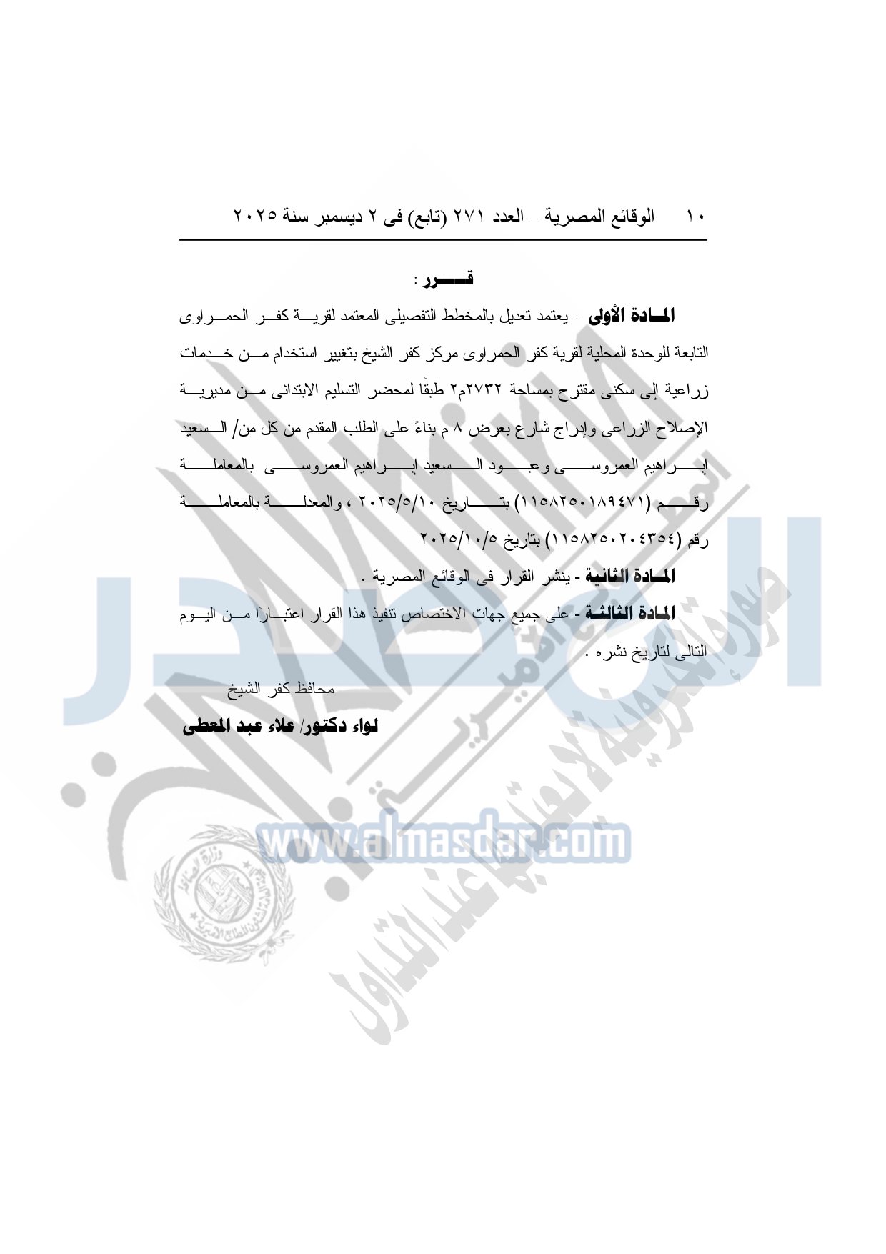 وأيضا نشرت الوقائع المصرية، في العدد 271 "تابع"، الصادر في 2 ديسمبر سنة 2025، قرار محافظة كفر الشيخ، رقم 20522 لسنة 2025، بتاريخ 15-11-2025، بشأن إعتماد تعديل بالمخطط التفصيلي المعتمد لقرية كفر الحمراوي.
