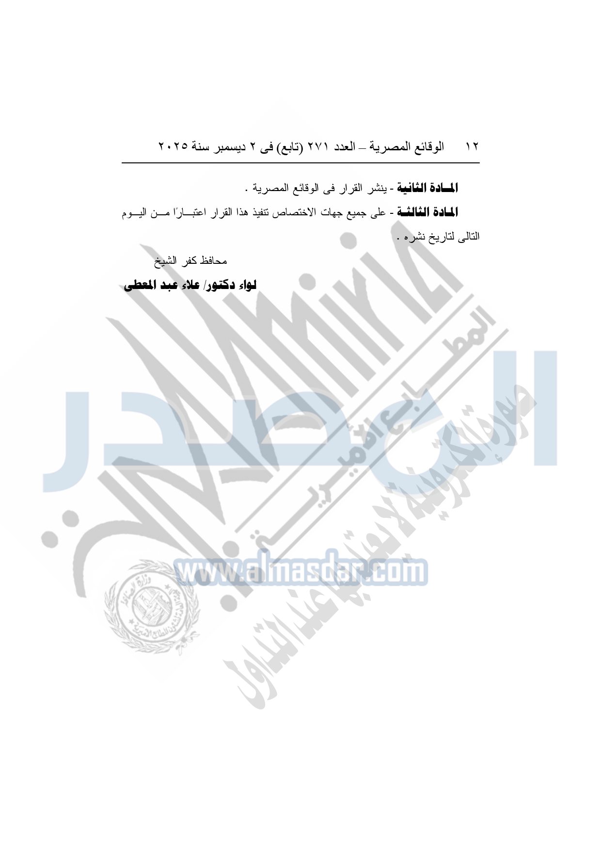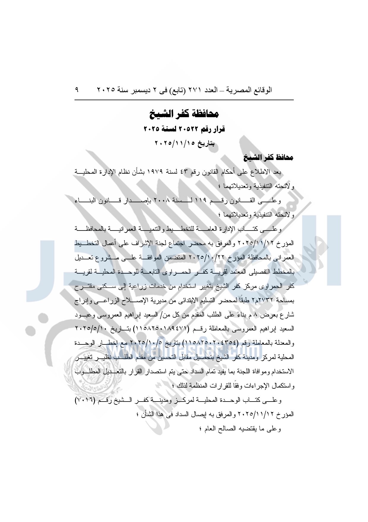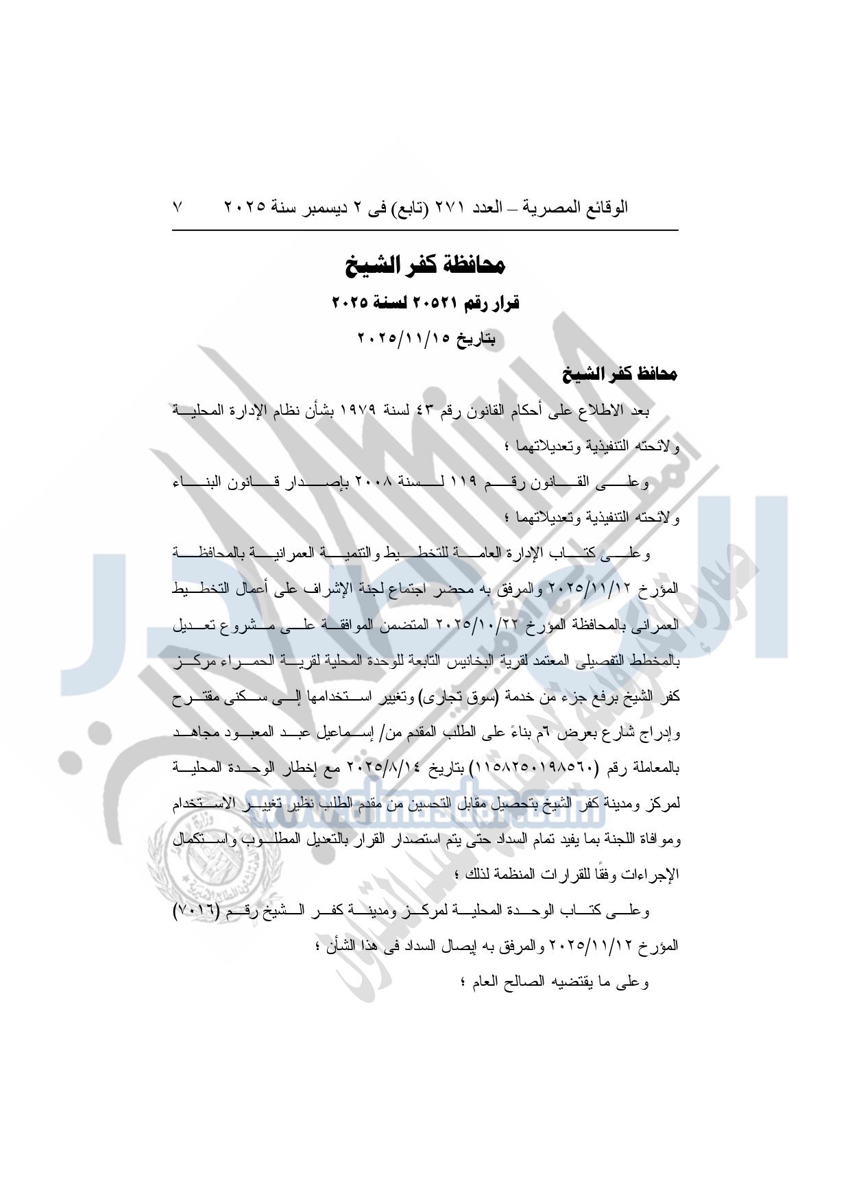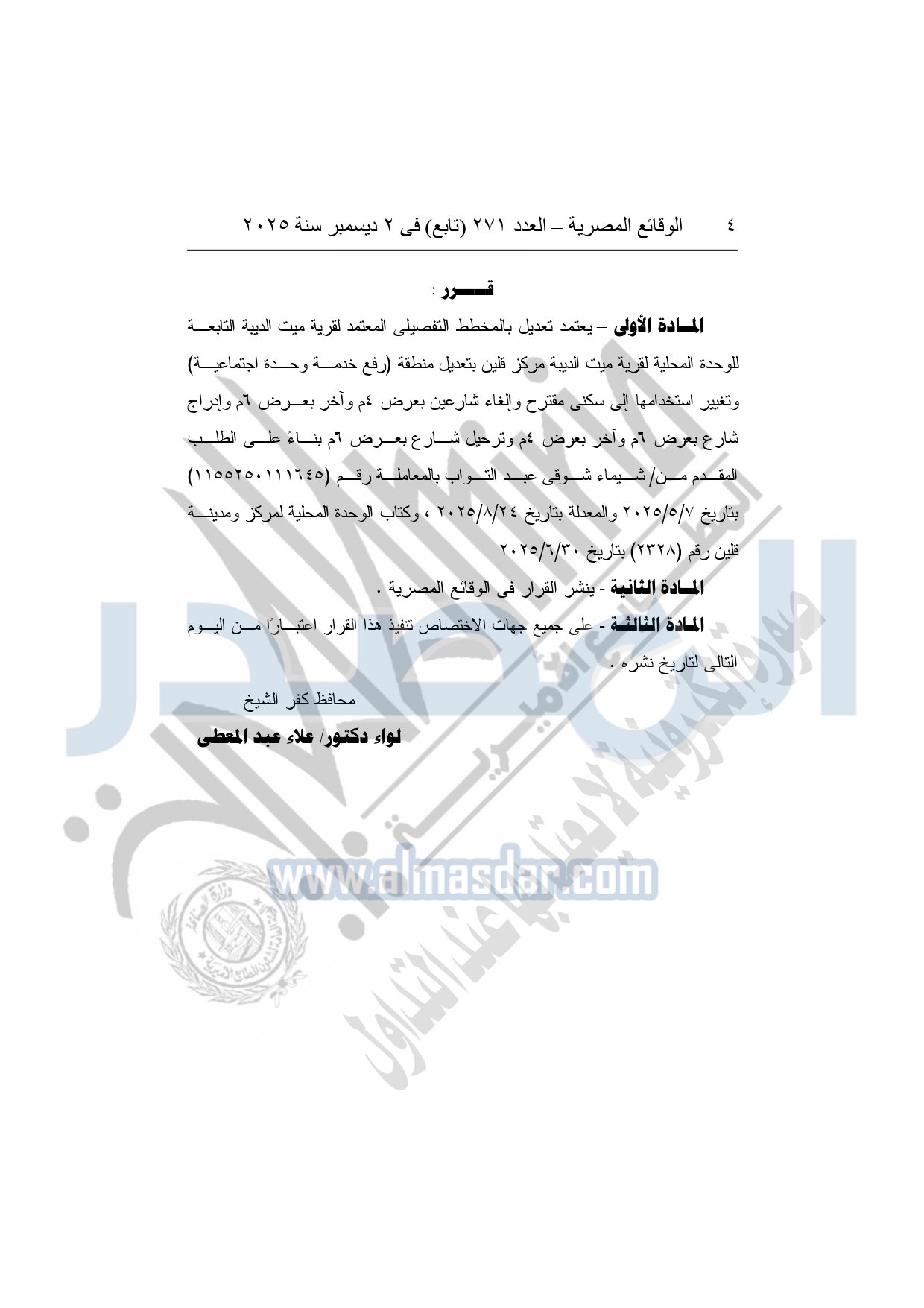وأيضا نشرت الوقائع المصرية، في العدد 271 "تابع"، الصادر في 2 ديسمبر سنة 2025، قرار محافظة كفر الشيخ، رقم 20522 لسنة 2025، بتاريخ 15-11-2025، بشأن إعتماد تعديل بالمخطط التفصيلي المعتمد لقرية كفر الحمراوي.