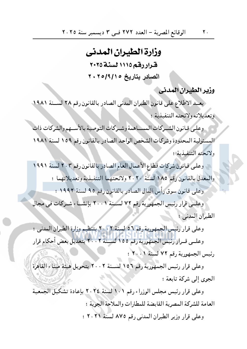 نشرت الوقائع المصرية، في العدد 272، الصادر في 3 ديسمبر سنة 2025، قرار وزارة الطيران المدنى، رقم 1115 لسنة 2025، بتاريخ 15-9-2025، بشأن مد 25 عام للشركة المصرية القابضة للمطارات والملاحة الجوية.
