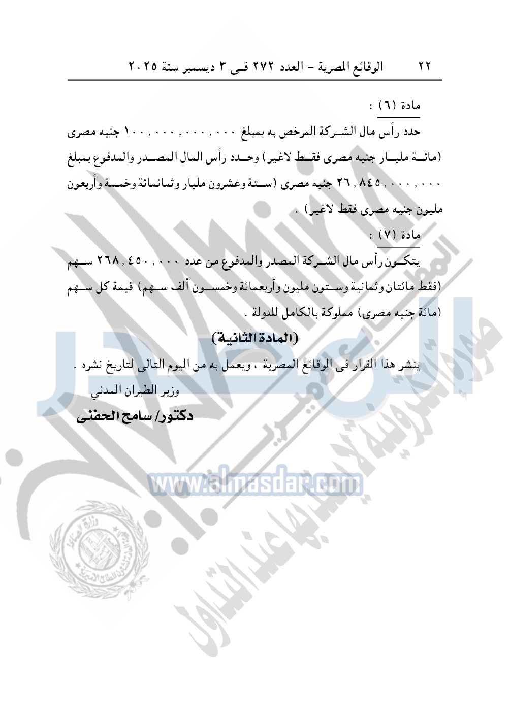 يستبدل بنصوص المواد "5"، "6"، "7" من النظام الأساسي للشركة المصرية القابضة للمطارات والملاحة الجوية الصادر بقرار وزير الطيران المدنى رقم 875 لسنة 2021 النصوص الآتية: