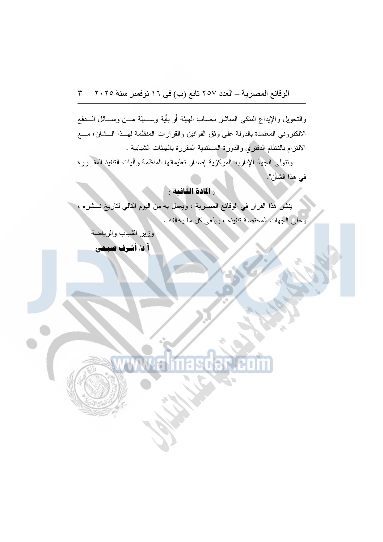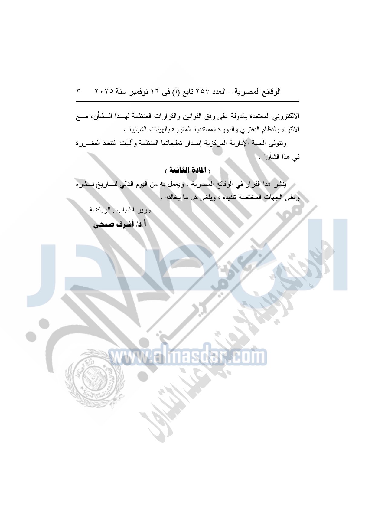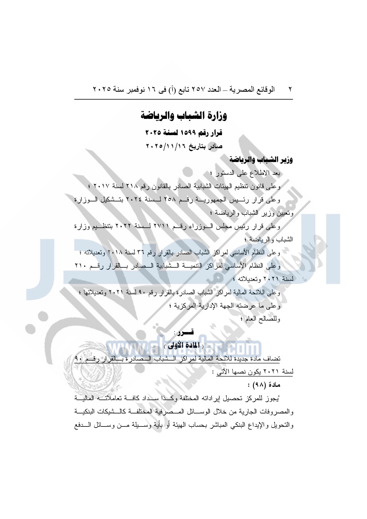 نشرت الوقائع المصرية، في العدد 257 تابع "أ"، الصادر في 16 نوفمبر سنة 2025، قرار وزارة الشباب والرياضة، رقم 1599 لسنة 2025، صادر بتاريخ 16-11-2025، بشأن إضافة مادة جديدة للائحة المالية لمراكز الشباب.