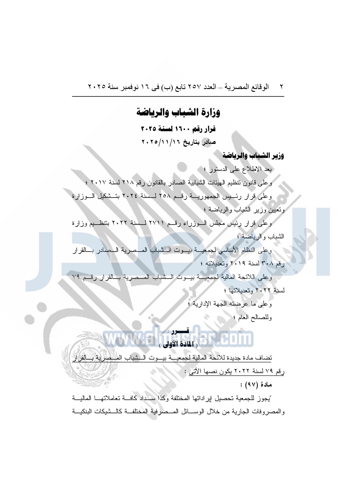 كما نشرت الوقائع المصرية، في العدد 257 تابع "ب"، الصادر في 16 نوفمبر سنة 2025، قرار وزارة الشباب والرياضة، رقم 1600 لسنة 2025، صادر بتاريخ 16-11-2025، بشأن إضافة مادة جديدة للائحة المالية لجمعية بيوت الشباب المصرية.