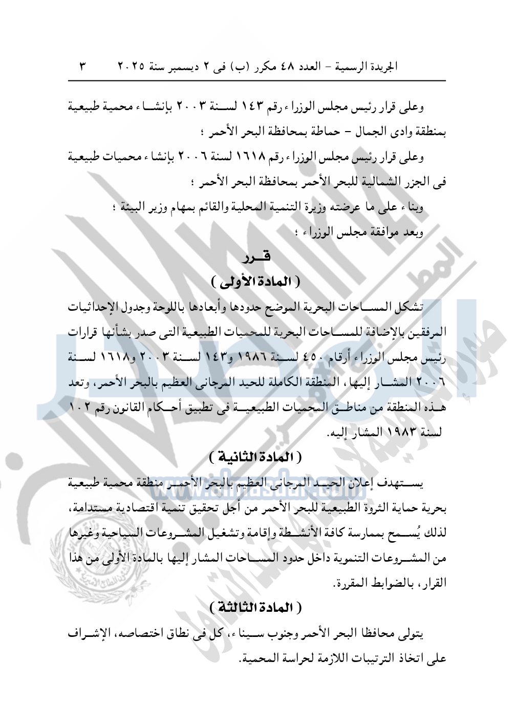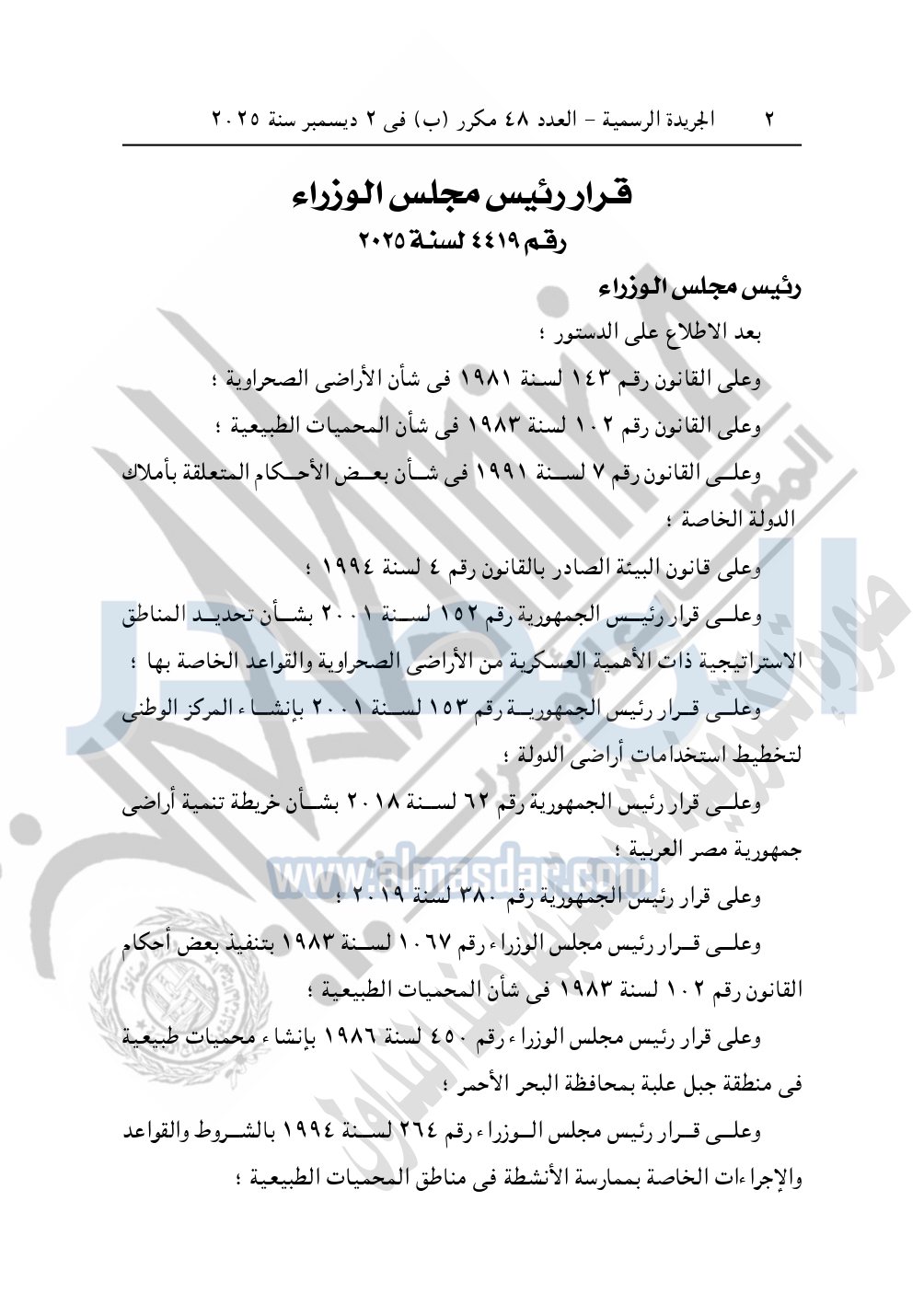 نشرت الجريدة الرسمية، في العدد 48 مكرر "ب"، الصادر في 2 ديسمبر سنة 2025، قرار رئيس مجلس الوزراء، رقم 4419 لسنة 2025، بشأن إنشاء محميات الطبيعية في منطقة جبل علبة بمحافظة البحر الأحمر.