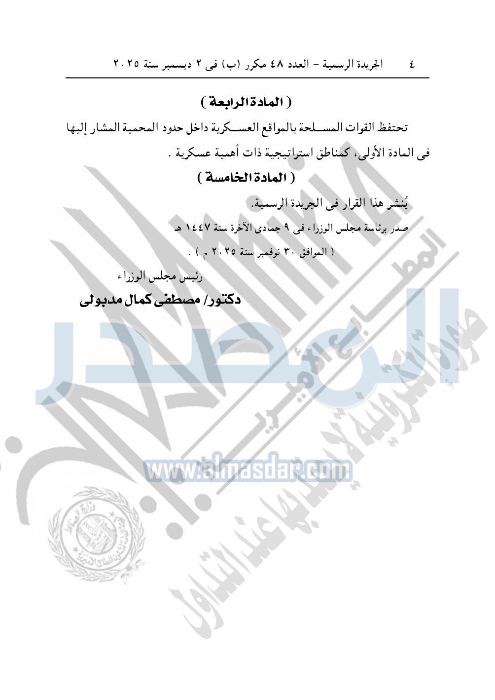 تحتفظ القوات المسلحة بالمواقع العسكرية داخل حدود المحمية المشار إليها في المادة الأولى، كمناطق استراتيجية ذات أهمية عسكرية .