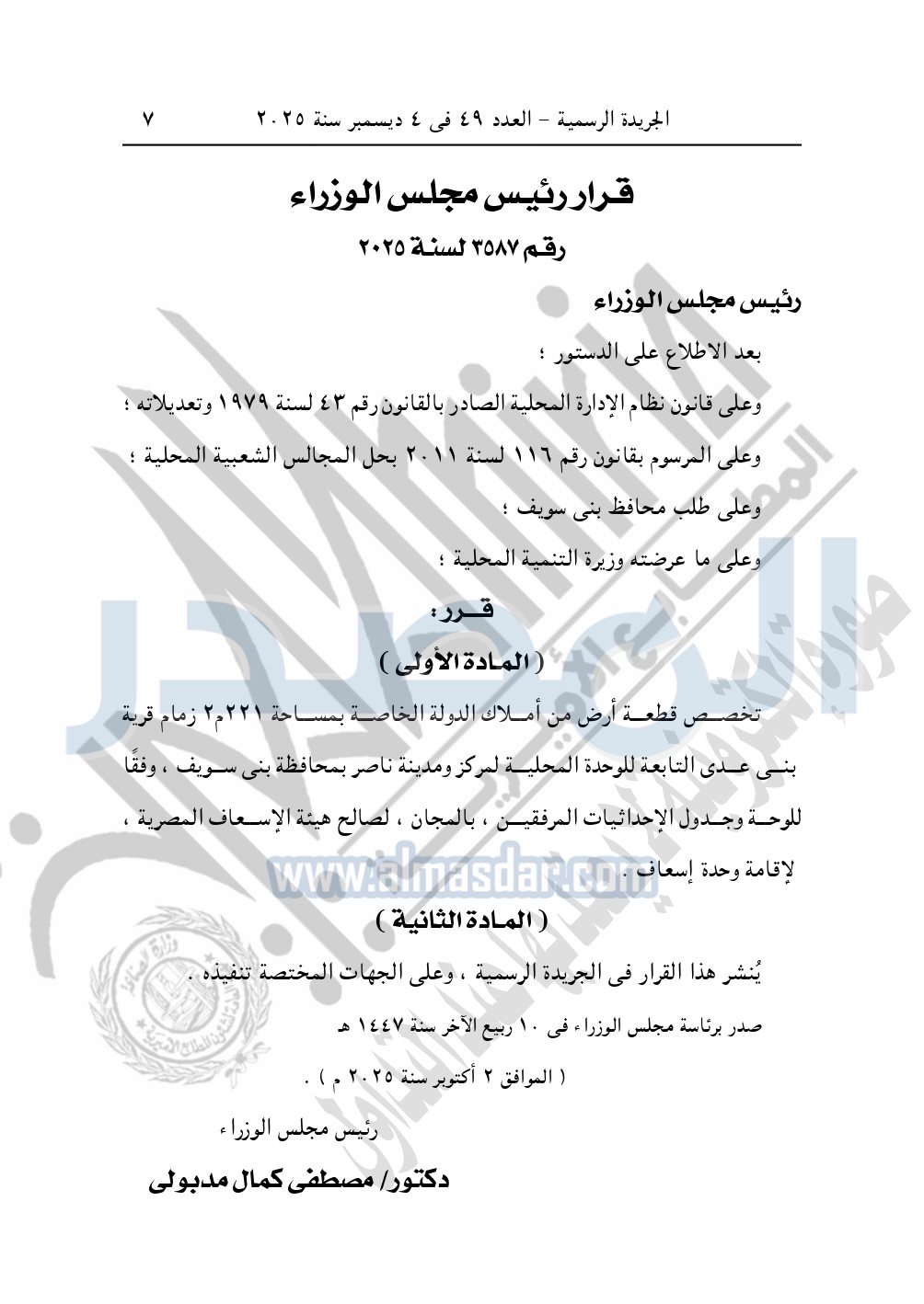 نشرت الوقائع المصرية في العدد 49، بتاريخ 4 ديسمبر 2025، قرار رئيس مجلس الوزراء، رقم 3587 لسنة 2025، بشأن تخصيص قطعة أرض لإقامة وحدة إسعاف بمحافظة بنى سويف.