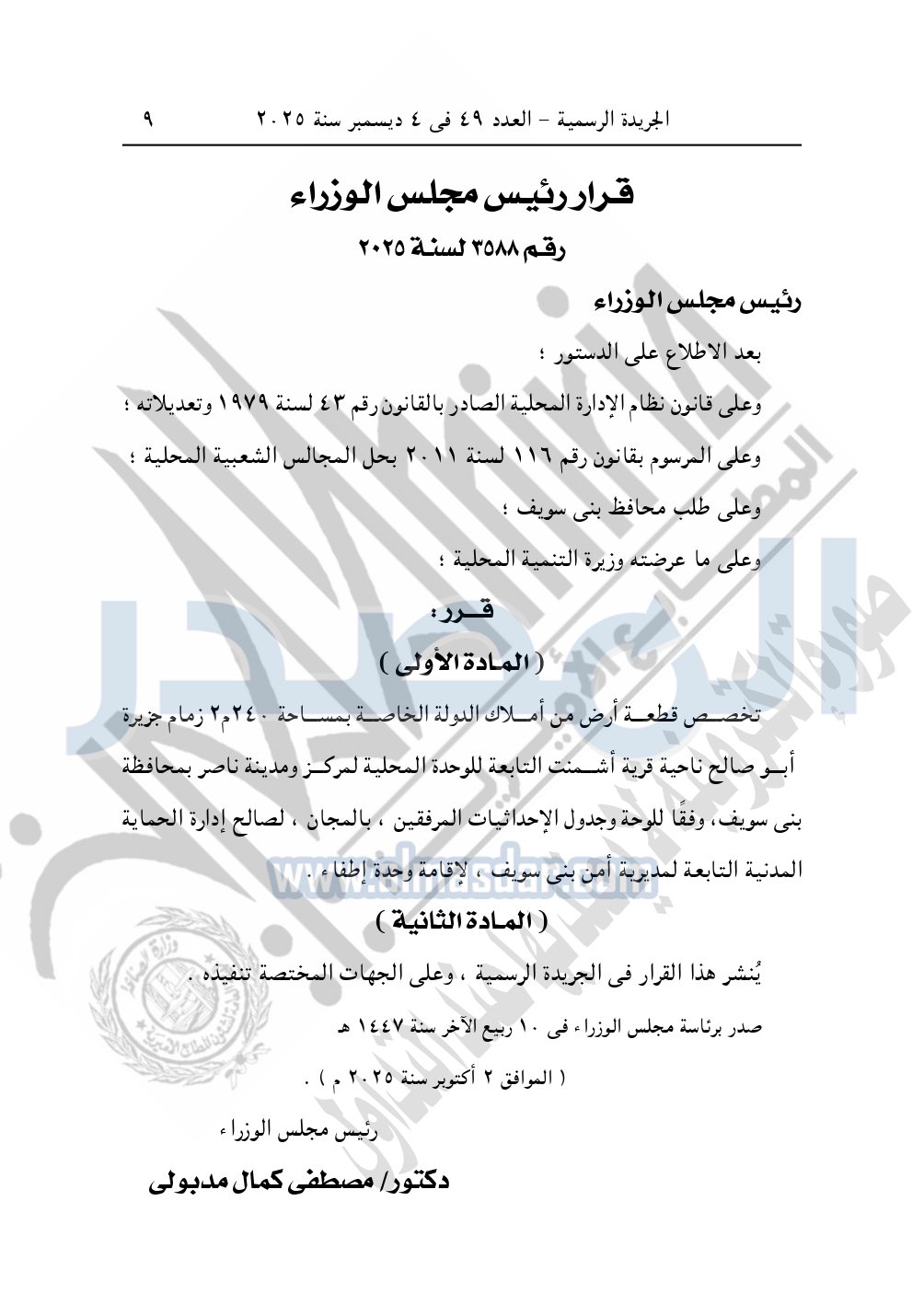 كما نشرت الوقائع المصرية في العدد 49، بتاريخ 4 ديسمبر 2025، قرار رئيس مجلس الوزراء، رقم 3588 لسنة 2025، بشأن تخصيص قطعة أرض لإقامة وحدة إطفاء بمحافظة بنى سويف.
