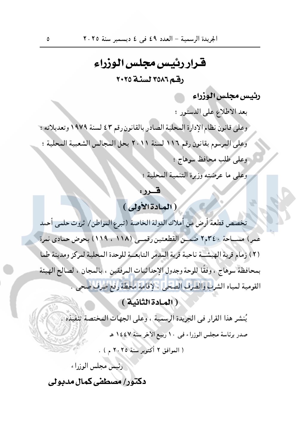 نشرت الوقائع المصرية في العدد 49، بتاريخ 4 ديسمبر 2025، قرار رئيس مجلس الوزراء، رقم 3586 لسنة 2025، بشأن تخصيص قطعة أرض لإقامة محطة رفع صرف صحى بمحافظة سوهاج.