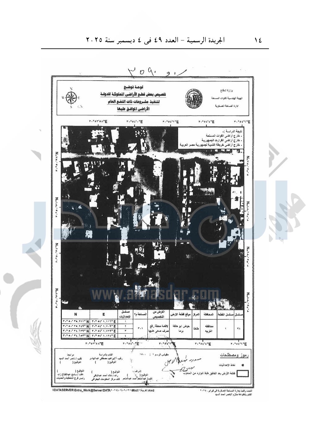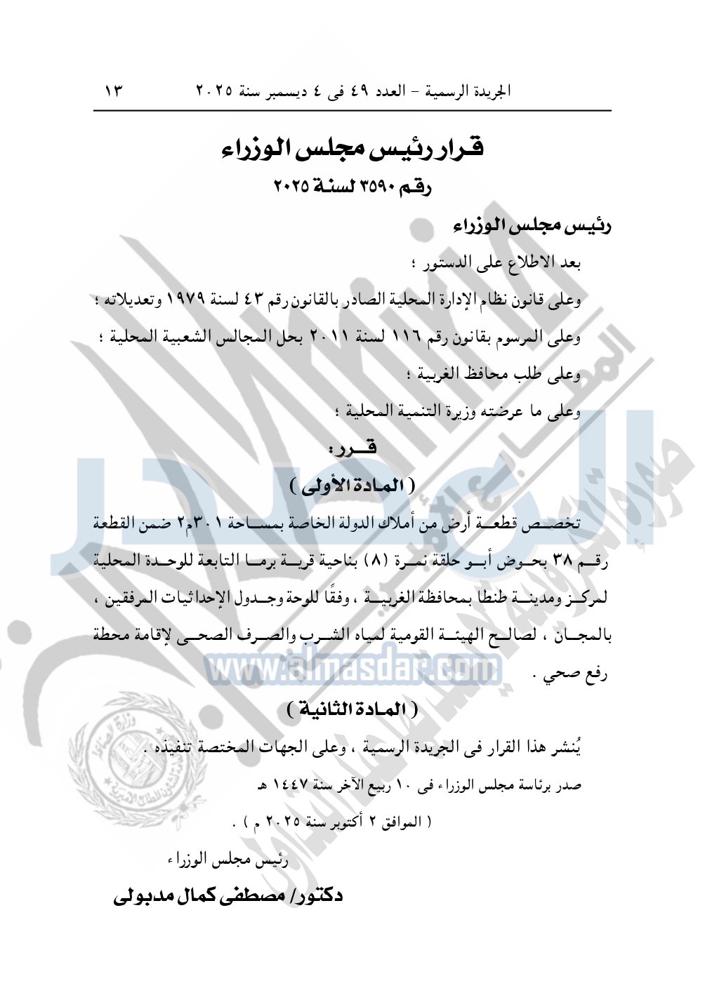 كما نشرت الوقائع المصرية في العدد 49، بتاريخ 4 ديسمبر 2025، قرار رئيس مجلس الوزراء، رقم 3590 لسنة 2025، بشأن تخصيص قطعة أرض لإقامة محطة رفع صحي بمحافظة الغربية.